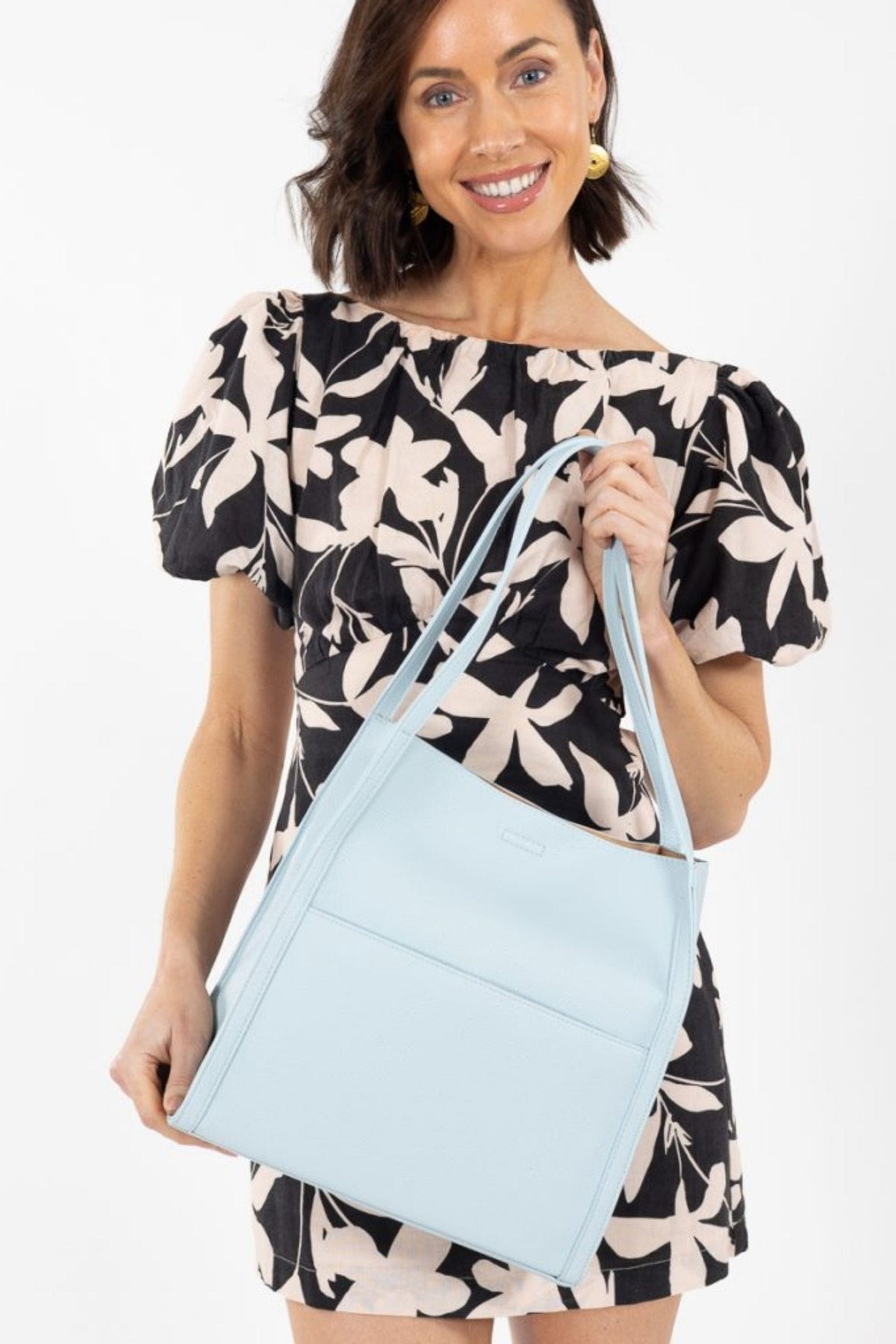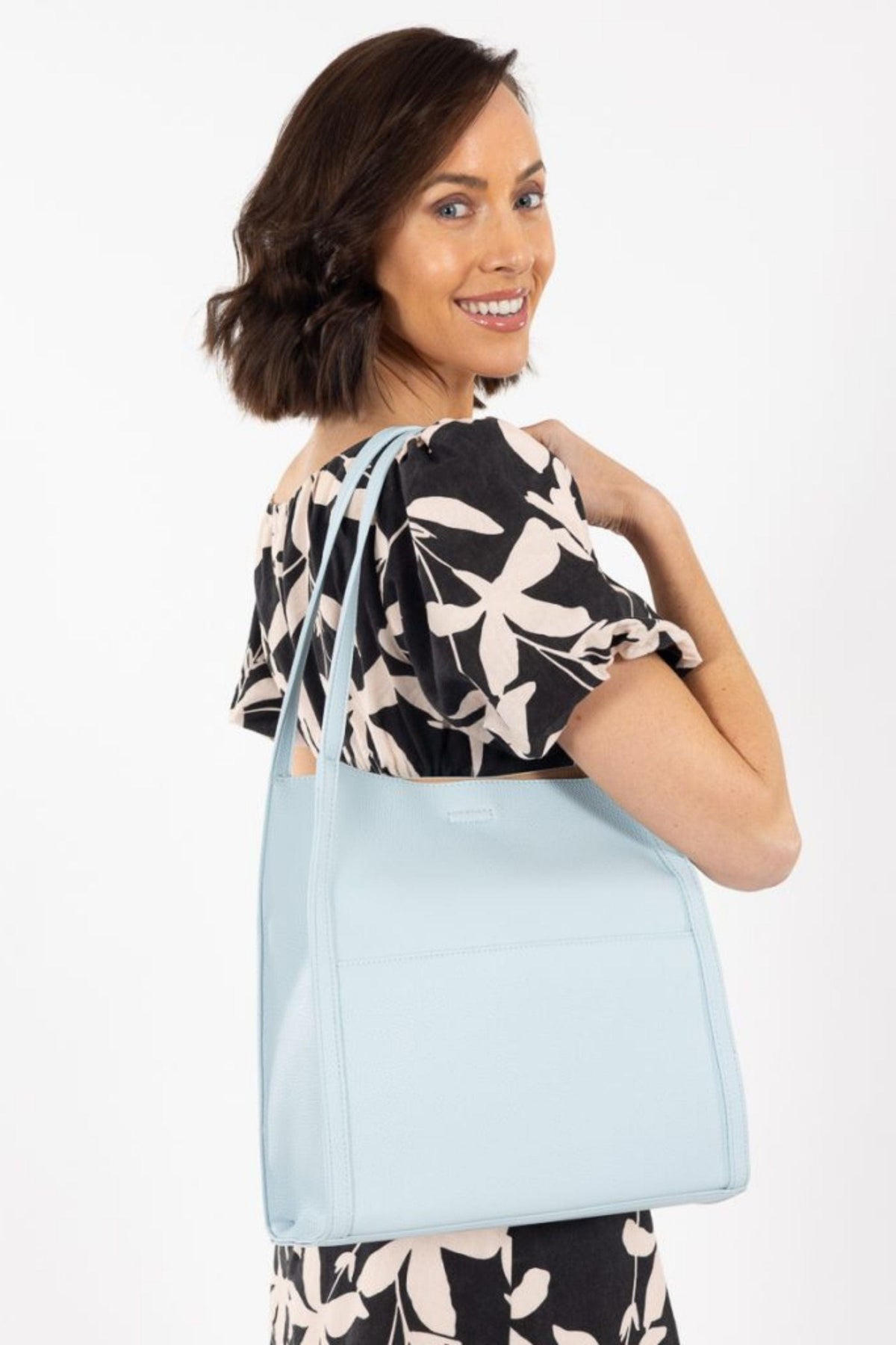 The Torino Tote features a tall, tapered silhouette with a large front pocket (perfect for your phone!) secured by a magnetic closure. The sides are finished with self-coloured picture frame-style edges for a defined shape.