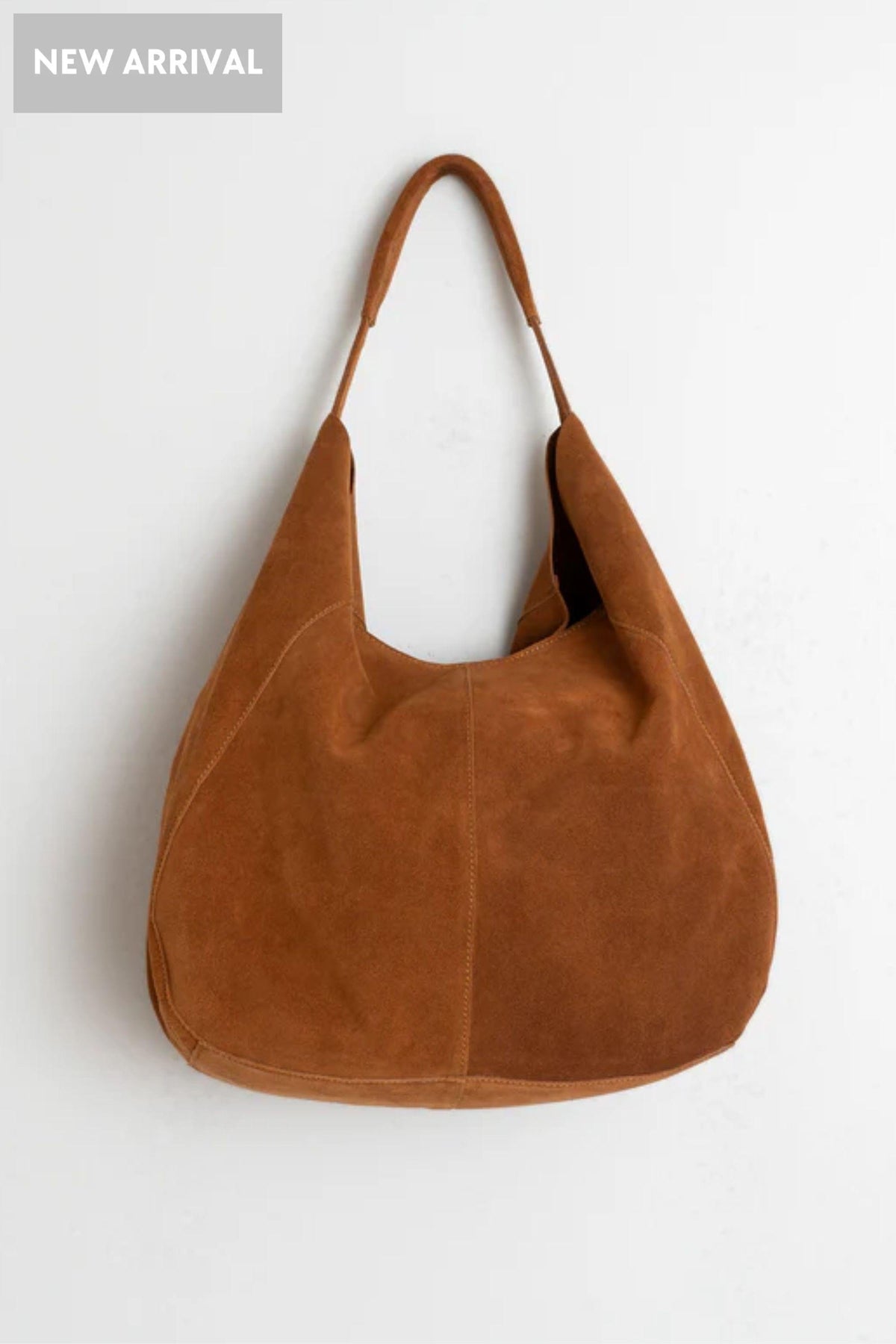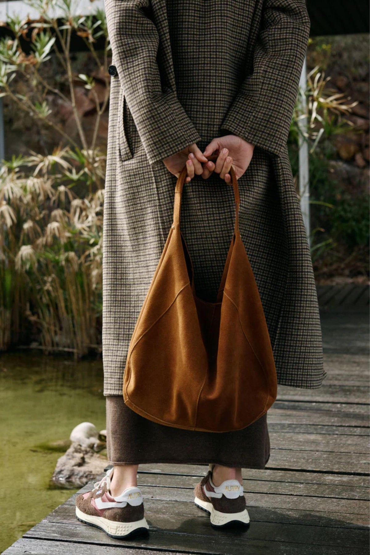 Split leather tote bag with hand/shoulder strap, plus cotton lining, a patch pocket and zipper closure that makes it softer and easier to use.