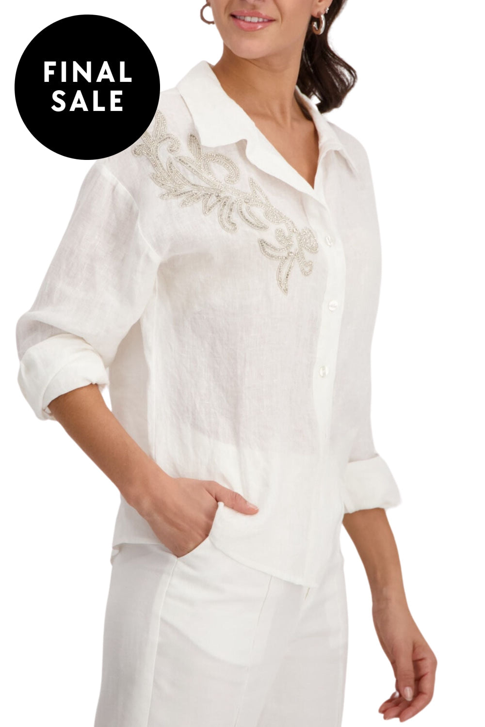 This beautiful blouse made of 100% Linen impresses with its elegant decorative appliqué and the practical cuffs on the long sleeves.