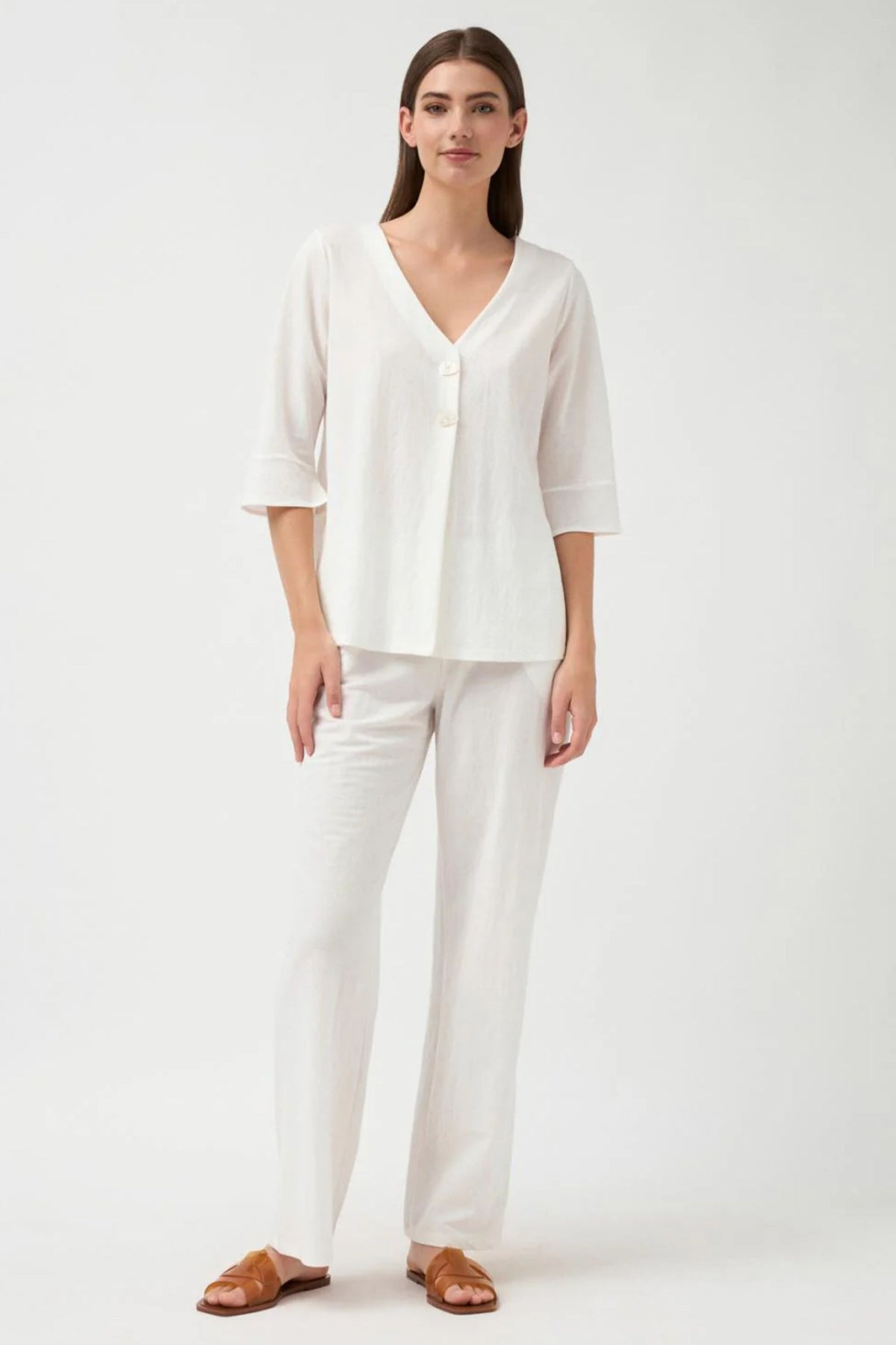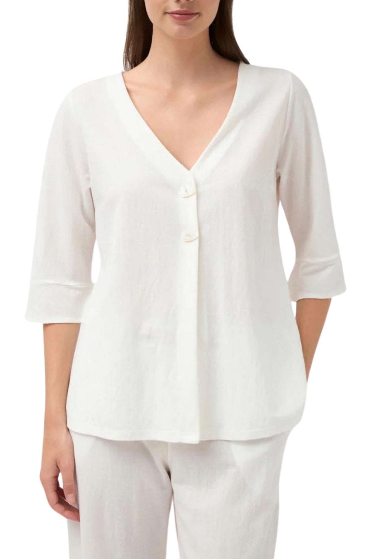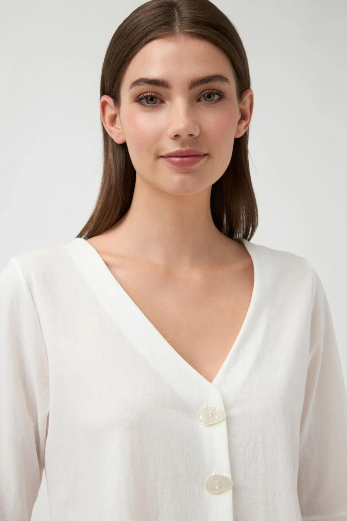 • V-neck with two-button front closure