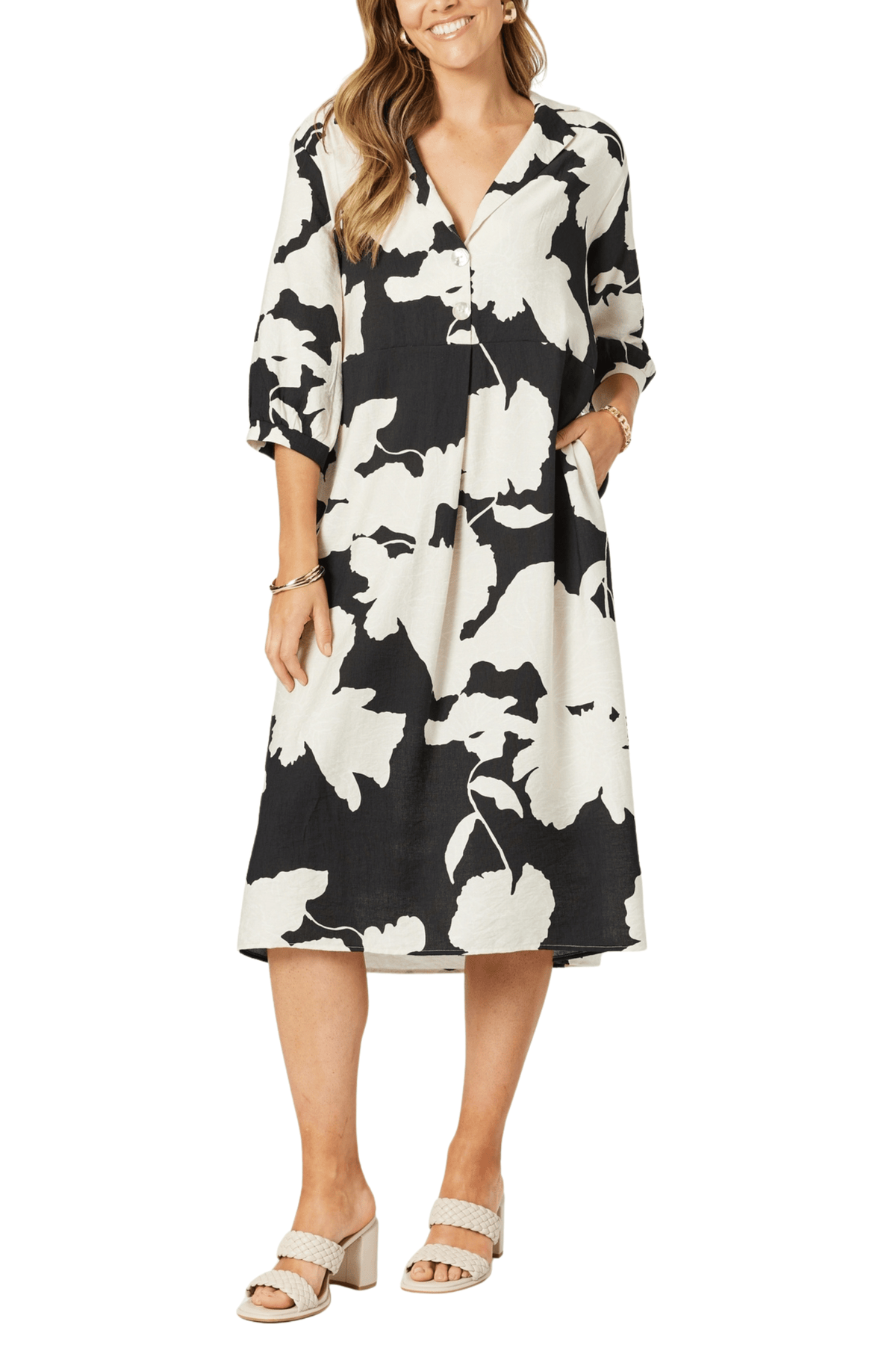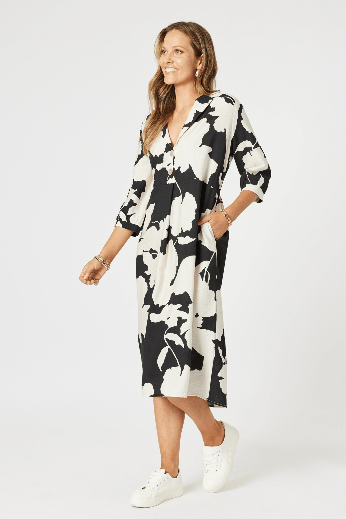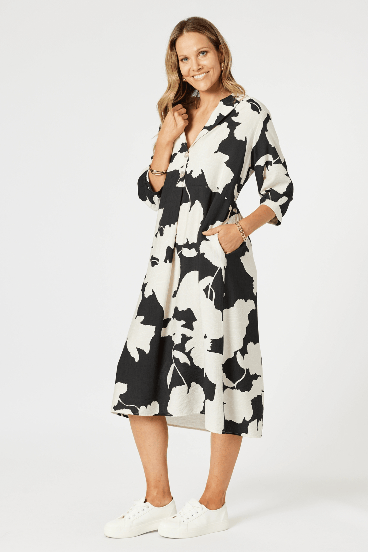 The Barcelona Floral Dress features elegant double button accents, relaxed and flowing three-quarter sleeves, and a soft collar. Falling gracefully below the knee, combining comfort with timeless style. An excellent choice for both your workday wardrobe and stylish evening occasions.
