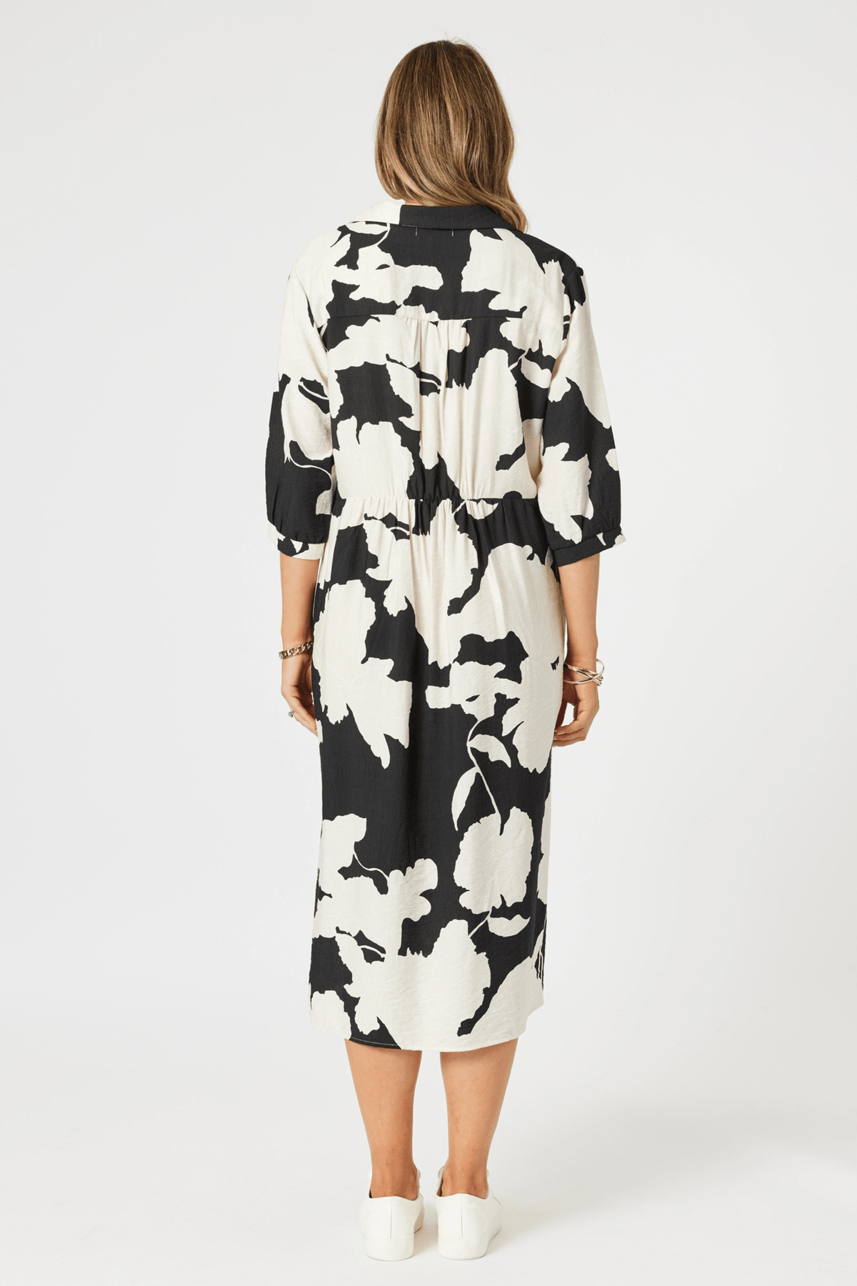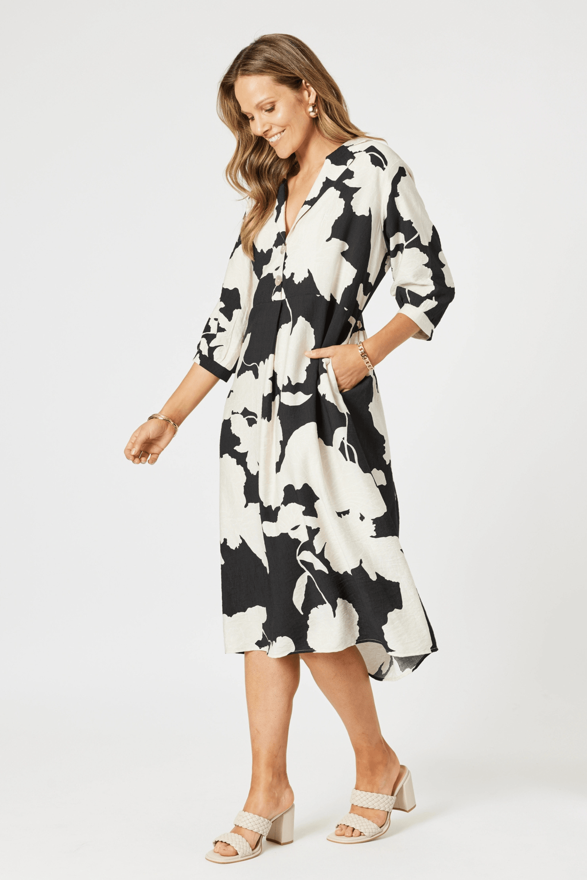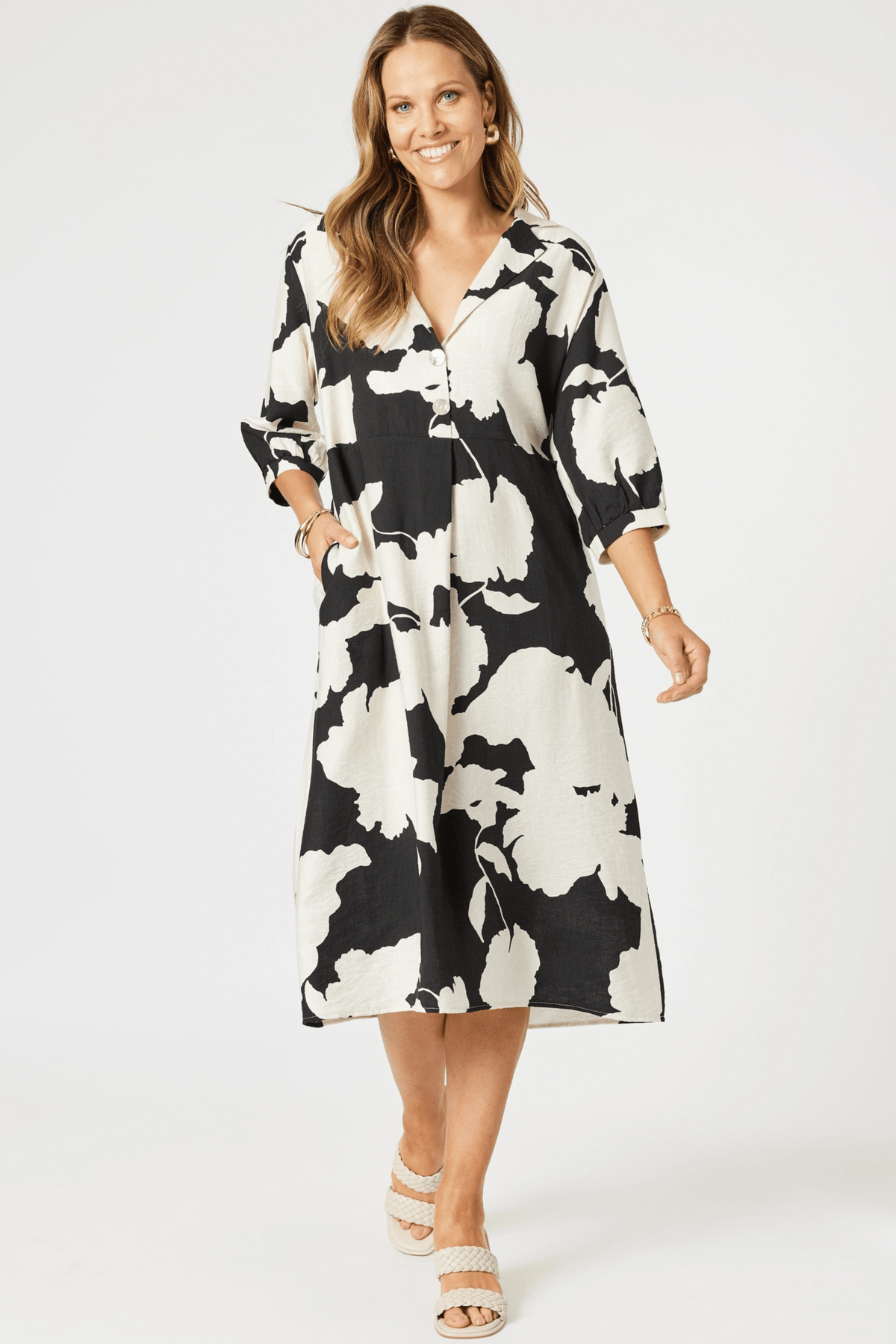 The Barcelona Floral Dress features elegant double button accents, relaxed and flowing three-quarter sleeves, and a soft collar. Falling gracefully below the knee, combining comfort with timeless style. An excellent choice for both your workday wardrobe and stylish evening occasions.