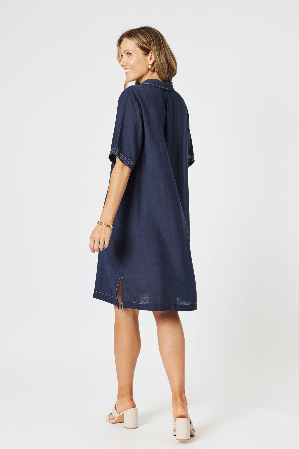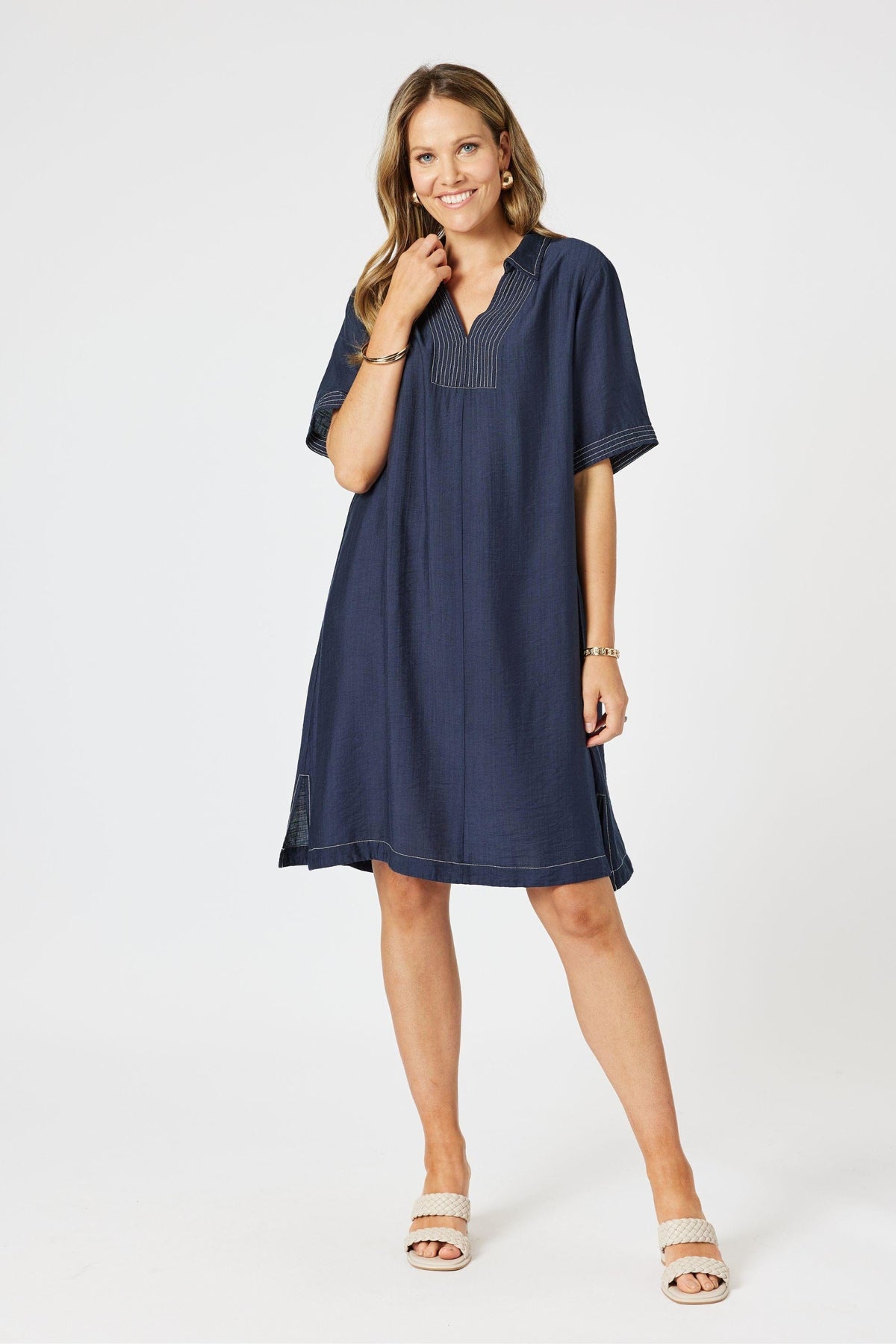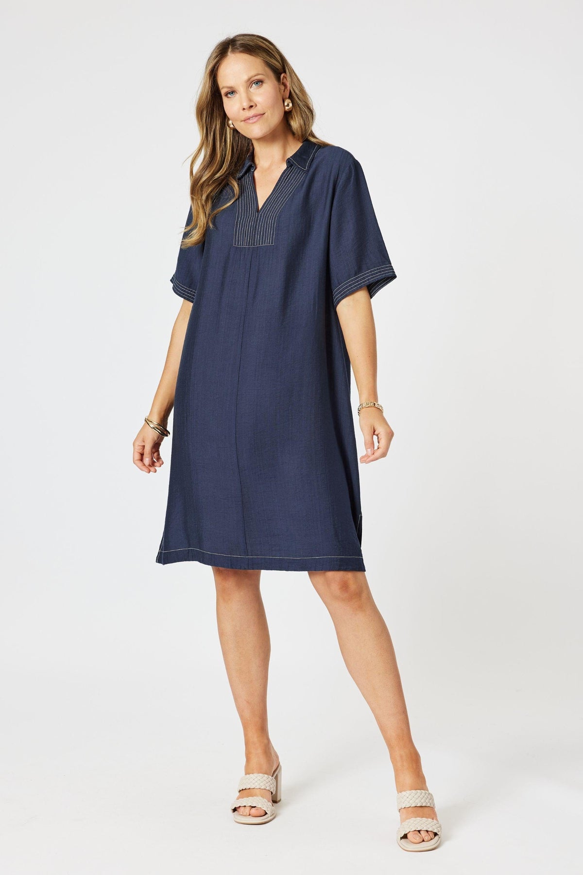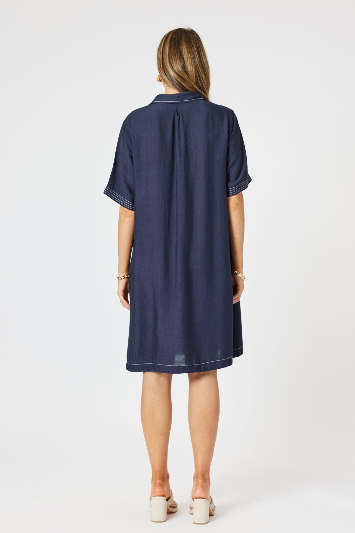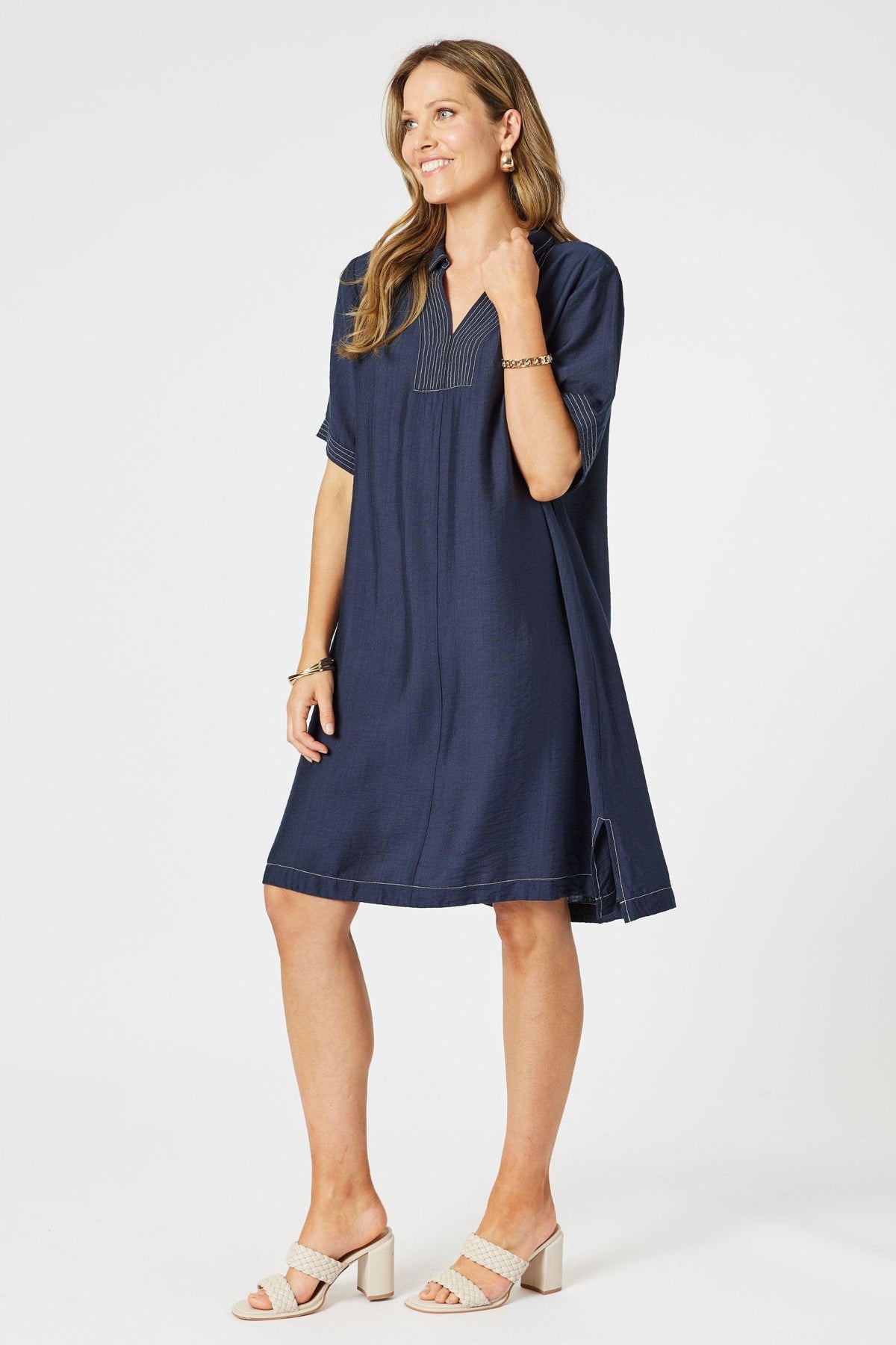 Crafted in a soft, drapey fabric, it features subtle contrast topstitching at the neckline, hem and sleeves for a modern, tailored touch. The relaxed silhouette flows gently over the body, with a flattering knee-length hem and a notched neckline that adds a hint of polish. Designed to move from casual days to easy evenings, it’s the kind of piece you’ll reach for again and again. Just add slides or sneakers for a laid-back look, or elevate it with bold accessories and a heel.