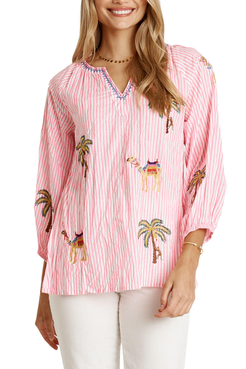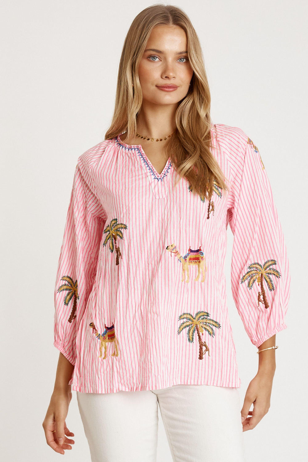 Soft, breezy, and beautifully detailed, the Lula Life Sahara Top brings effortless charm to everyday dressing. Made from 100% cotton, it’s lightweight, breathable, and perfect for warm-weather comfort. The scooped neckline with a front split creates a relaxed, flattering look, while the gentle gathers from the neck add soft movement. The 3/4 length raglan sleeves with elastic hems keep the fit easy and airy. Finished with delicate embroidery and practical side splits, this Australian-designed top pairs perfectly with denim, linen pants, or shorts for a fresh, casual outfit.