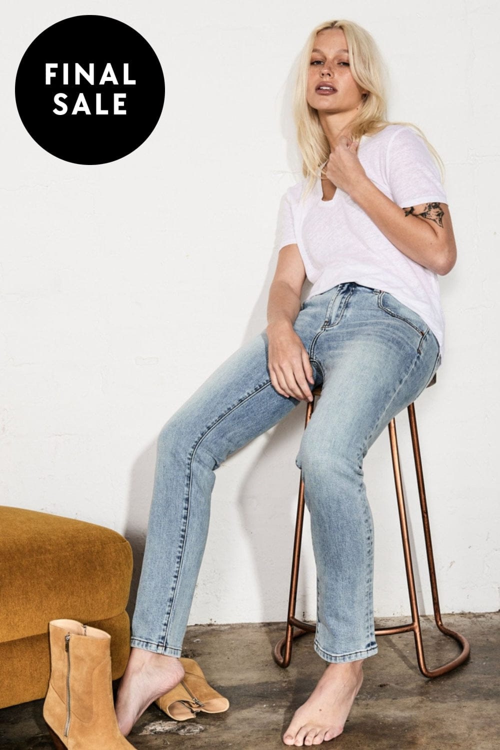 The Kirby is cut with a flattering mid rise waist and slightly tapering leg for a slimming effect. This flattering jean is constructed with a comfortable bit of stretch for everyday wear.