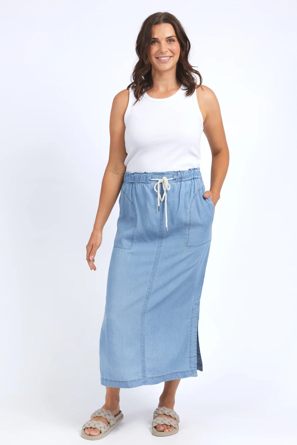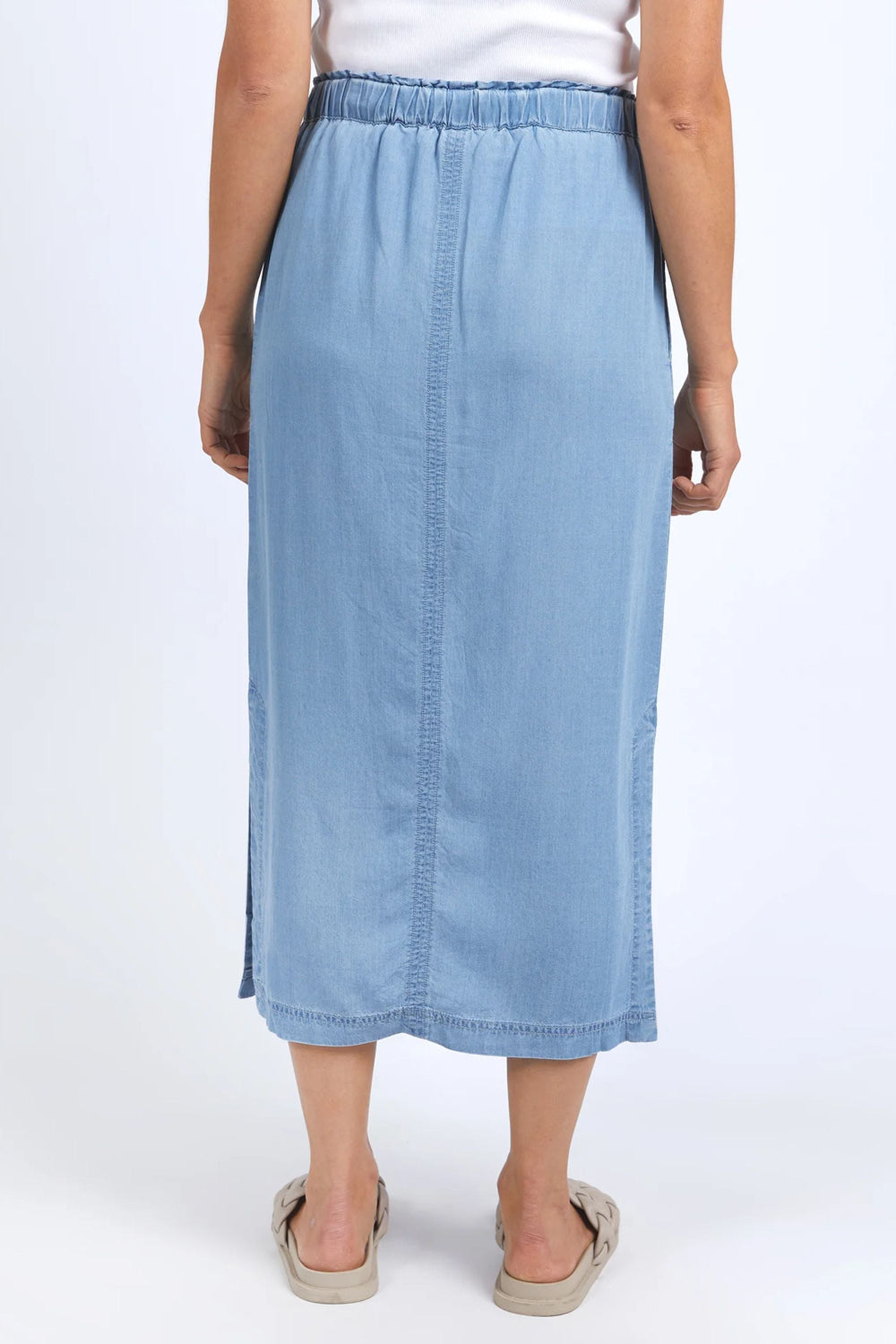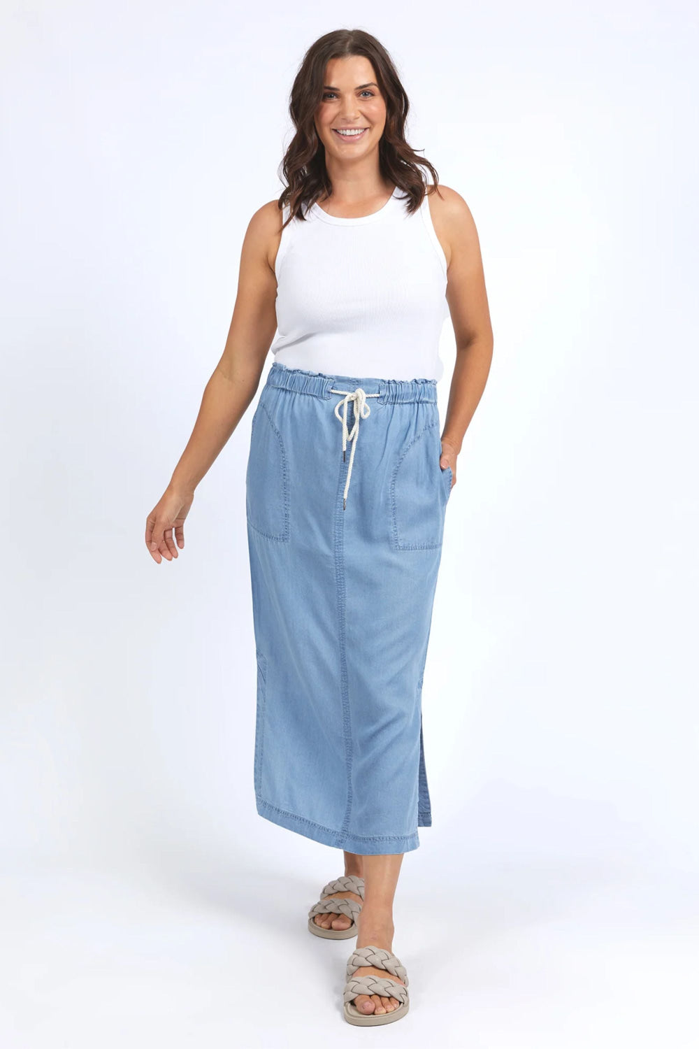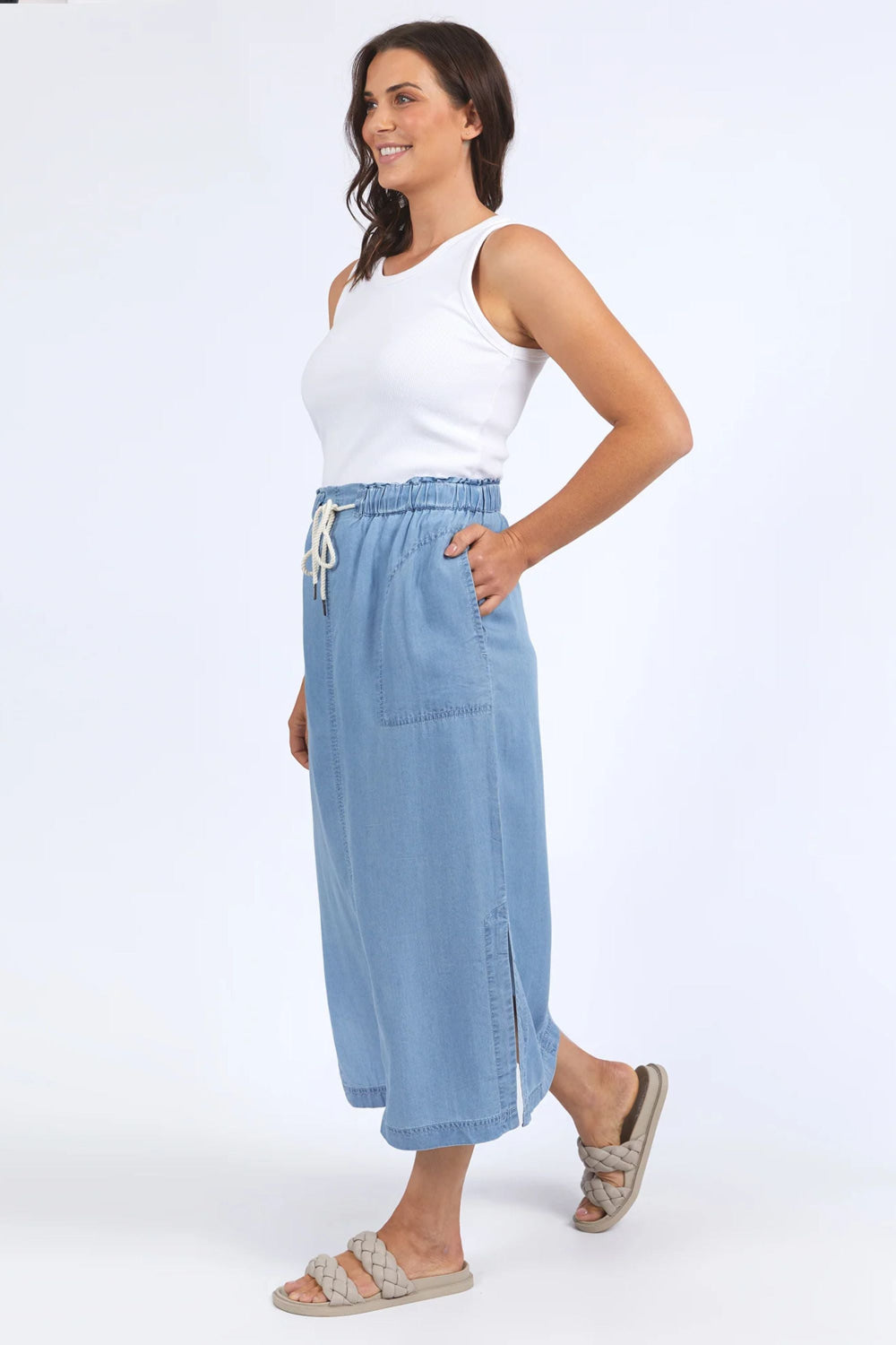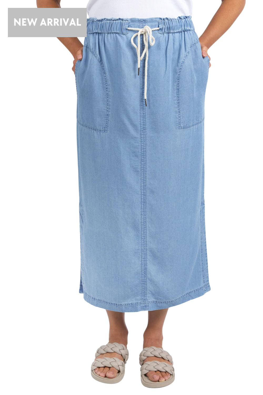 Versatility, class, and comfort are all the qualities that come to mind when the midi length Penny Utility Skirt becomes a part of your wardrobe. Featuring pockets and made with love from a lyocell chambray material cut in a soft and drapey design, you will be reaching for this skirt every day.