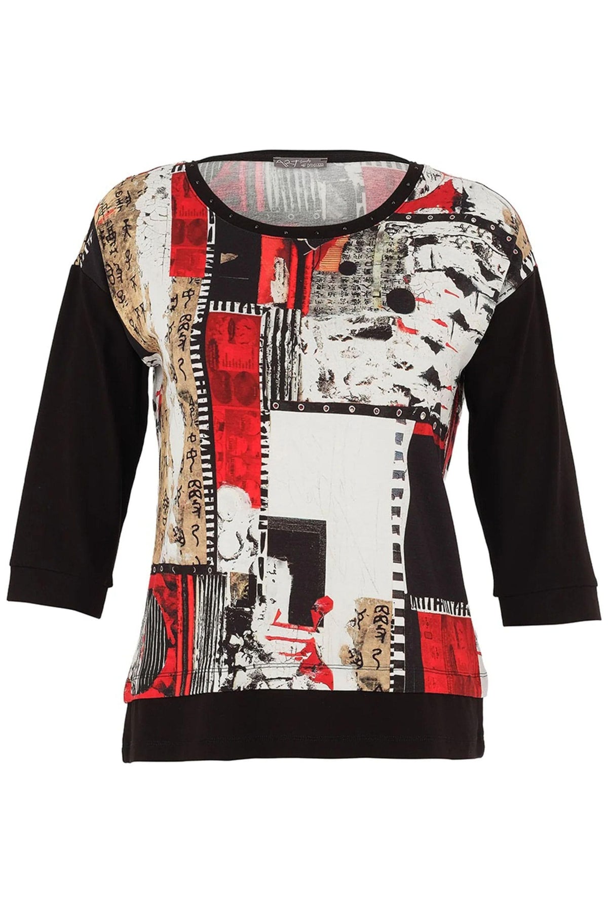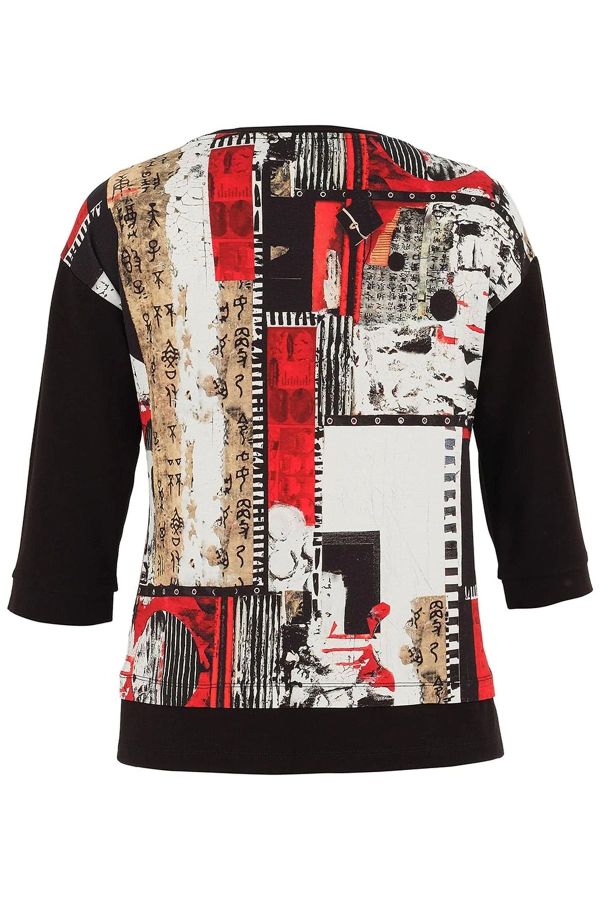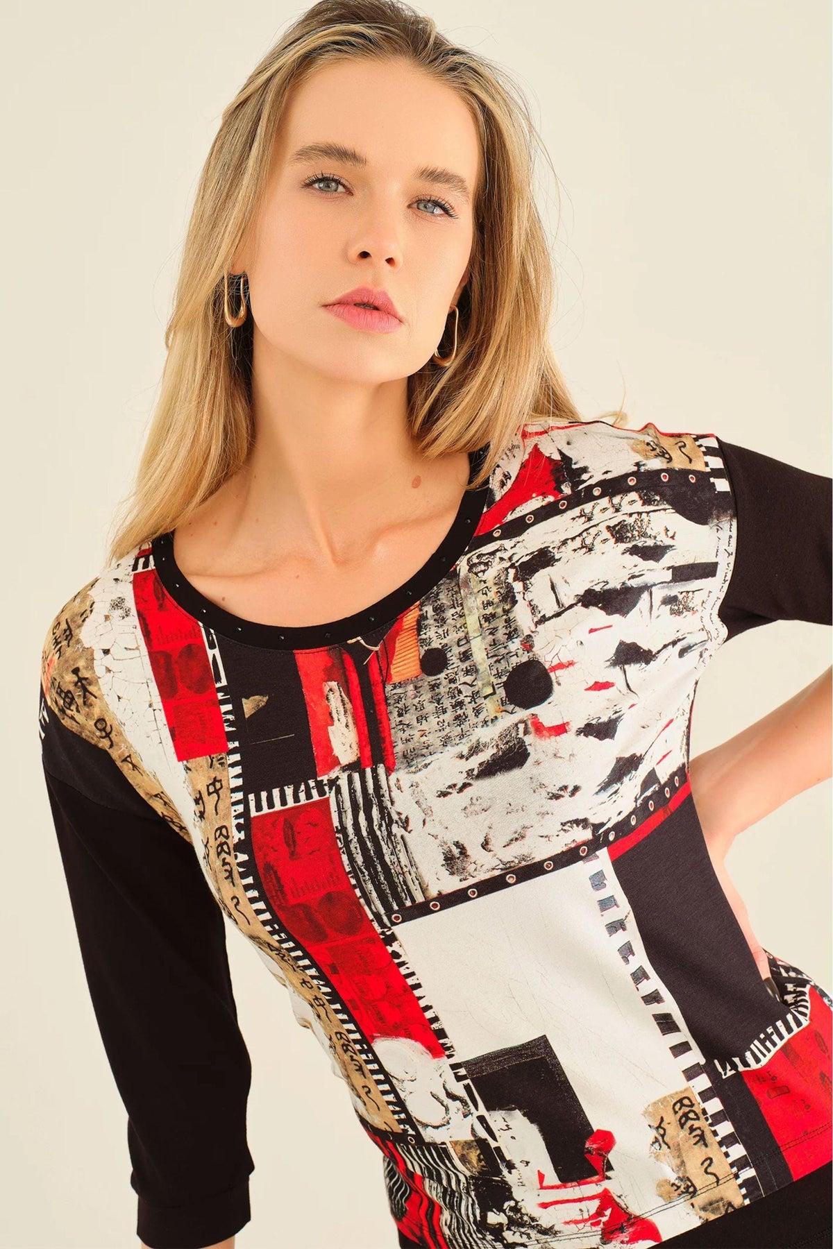 A three-quarter sleeve jersey top with gallery-inspired print and sculptural neckline. The abstract collage of text, brushstrokes, and muted tones is drawn from Carol Staub’s “Bookworm” series.