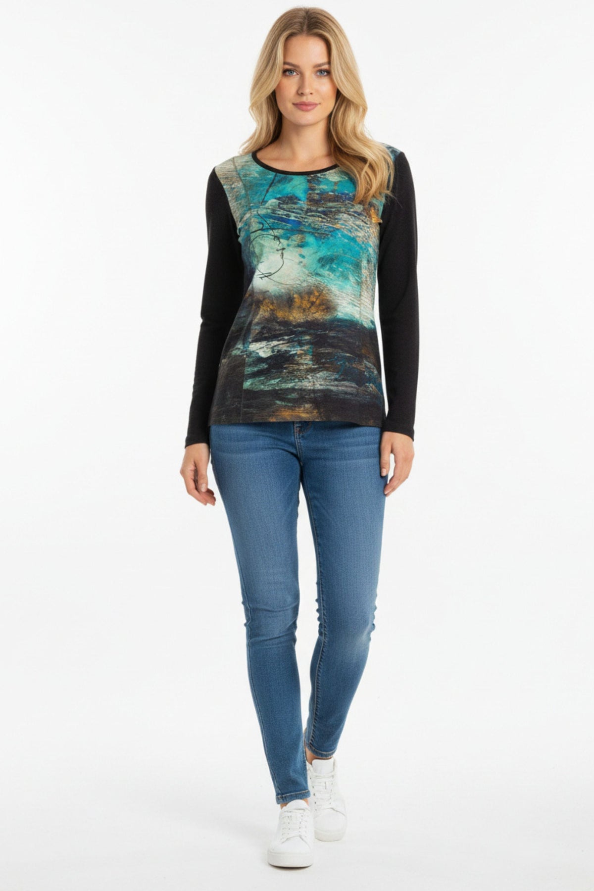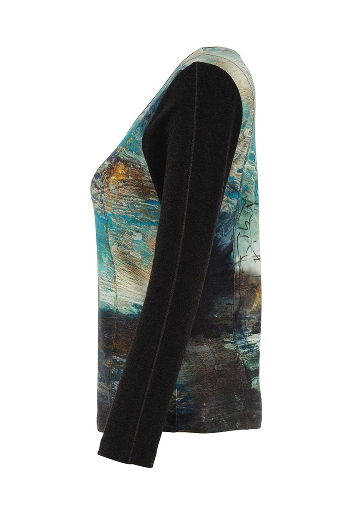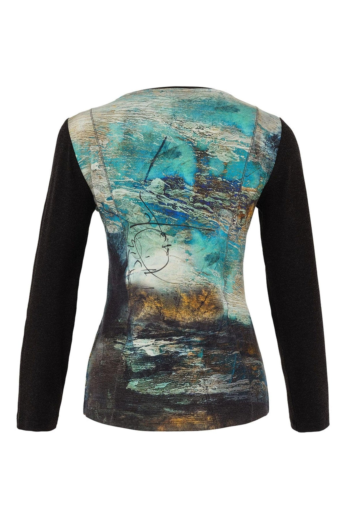Inspired by expressive brushwork and abstract forms, this top features a dynamic palette of blues, greens, and earthy tones, layered with black line drawings that evoke movement and emotion. The black sleeves and neckline offer sleek contrast, framing the print with modern edge.