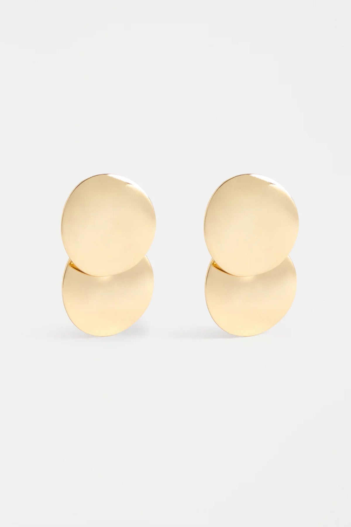 The Klara Earrings showcase two round sculptural discs in a shiny metallic finish with an interesting backing detail that creates a layered effect. These statement earrings will elevate and add unique sophistication to your more polished and evening outfits.