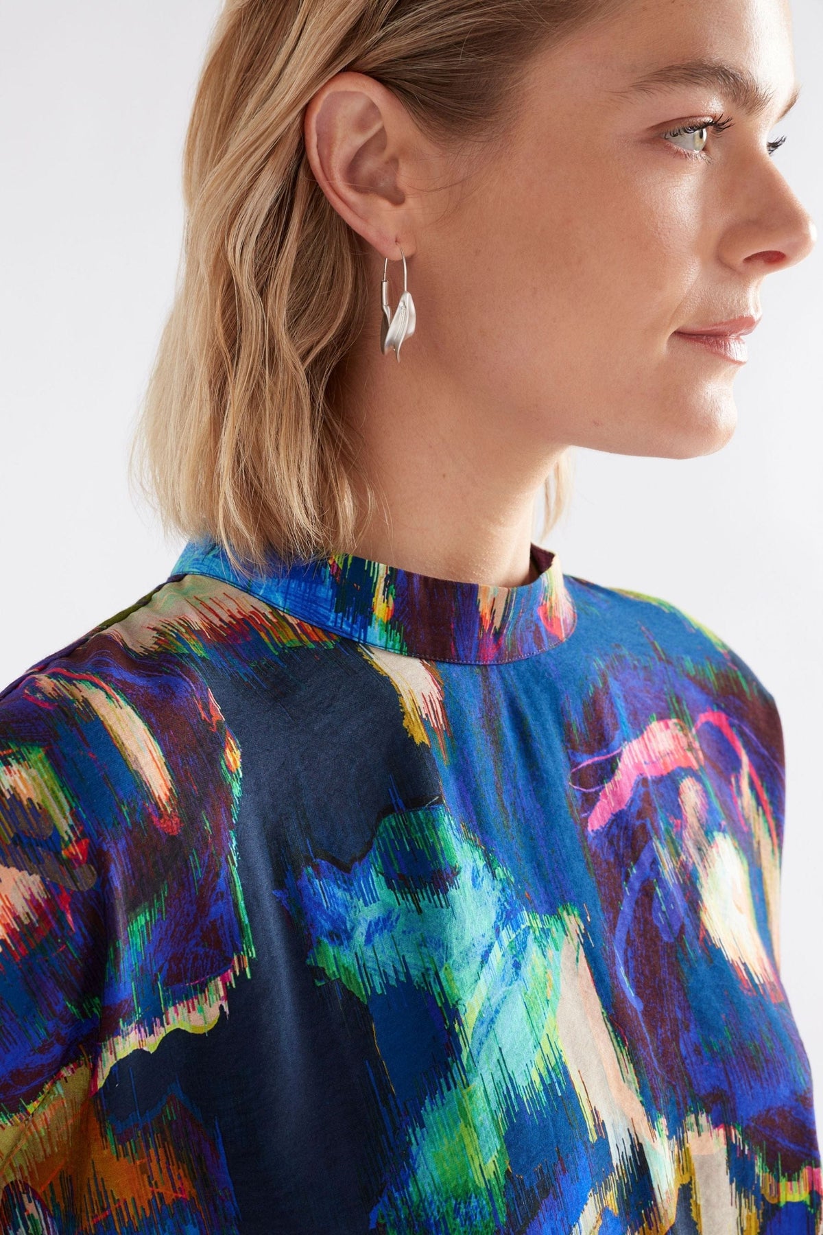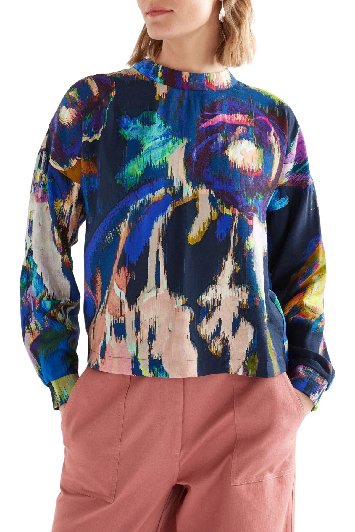 The Moda Turtle Neck Top has a smart sleekness with its mock turtleneck and striking Vaara print. Crafted from a breathable silky Liva Reviva™ viscose blend that has a matte sheen. This long sleeve top features dropped shoulders and sleeves that gather at the cuff and are finished with practical, decorative shirred half cuffs that allow the wearer to easily to push up for versatility and practicality.