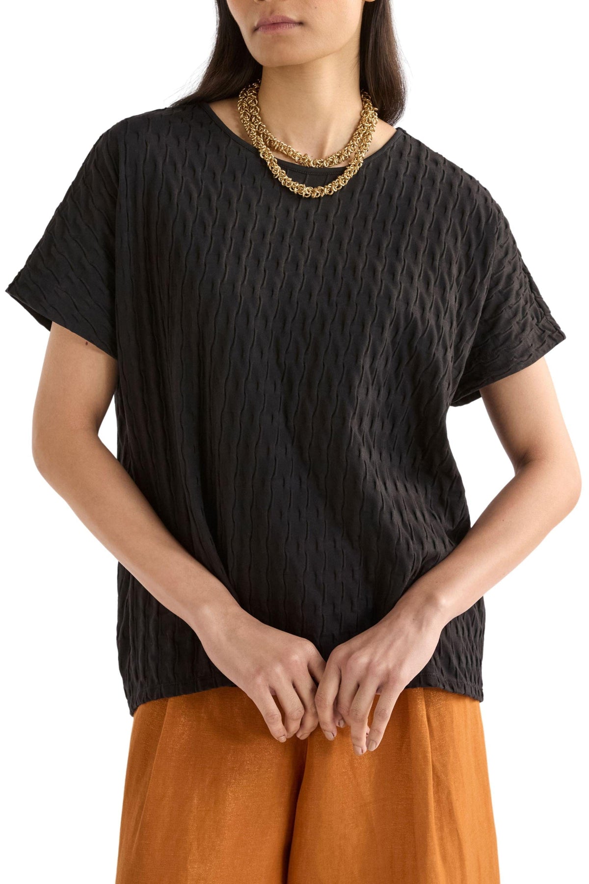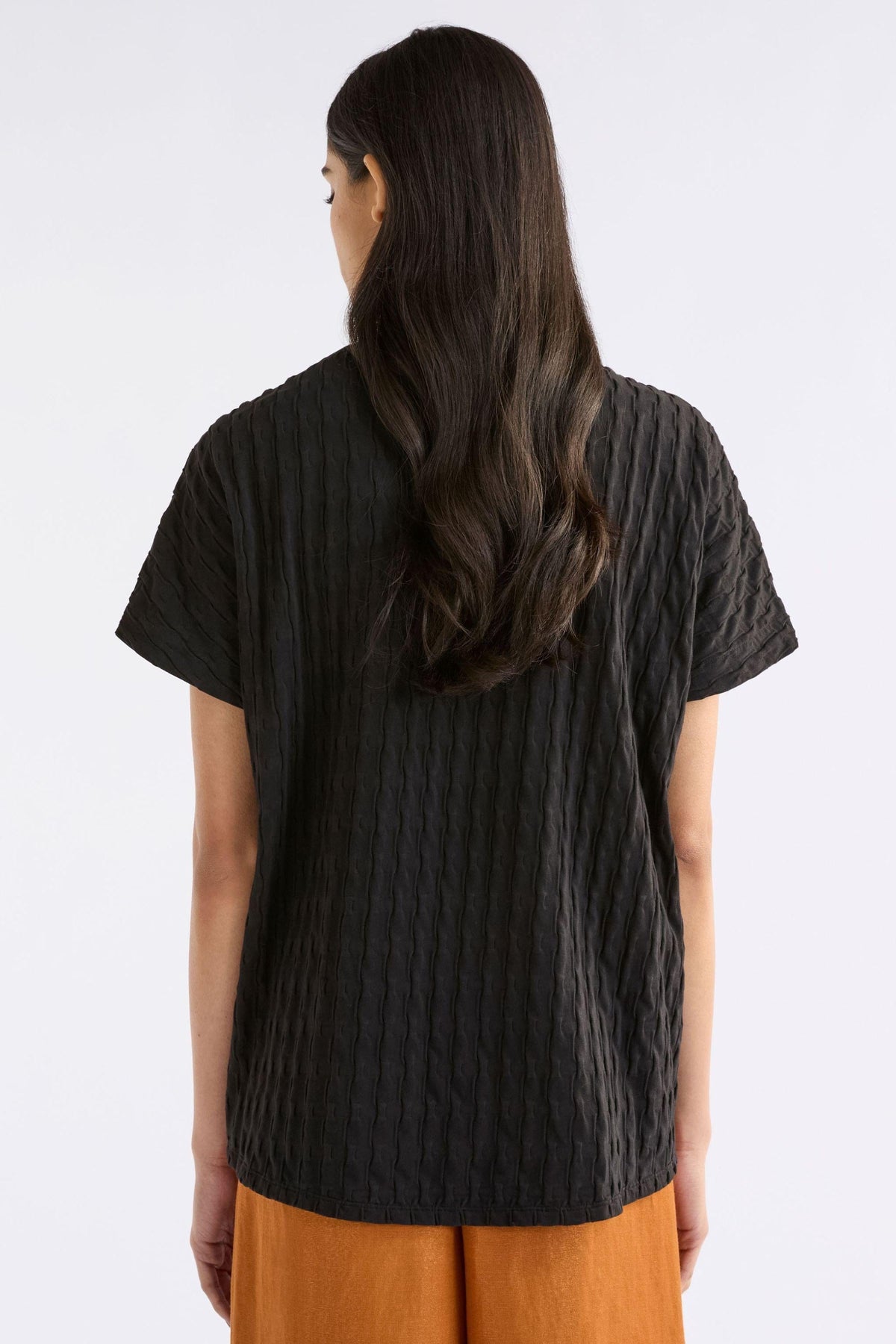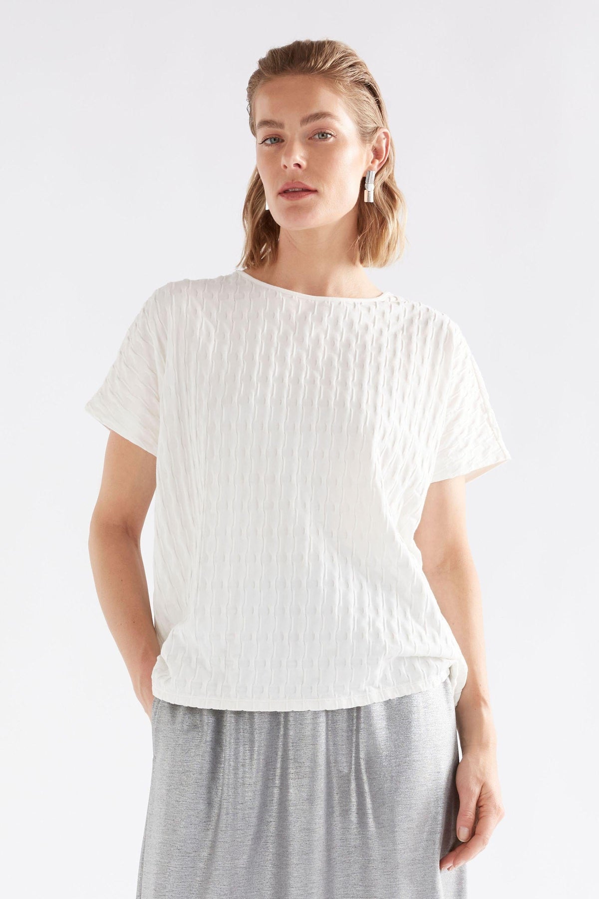 The Orta Boxy Tshirt is a relaxed fit, easy tee with a unique textured twist. Crafted from organic cotton with stretch for comfort and movement, it features a raised textured stripe bubble knit effect for interest. The organic cotton provides soft, breathable comfort with stretch for all-day ease. Pair with your favourite denim for casual outfitting or with tailored trousers and playful accessories for desk-to-dinner looks.