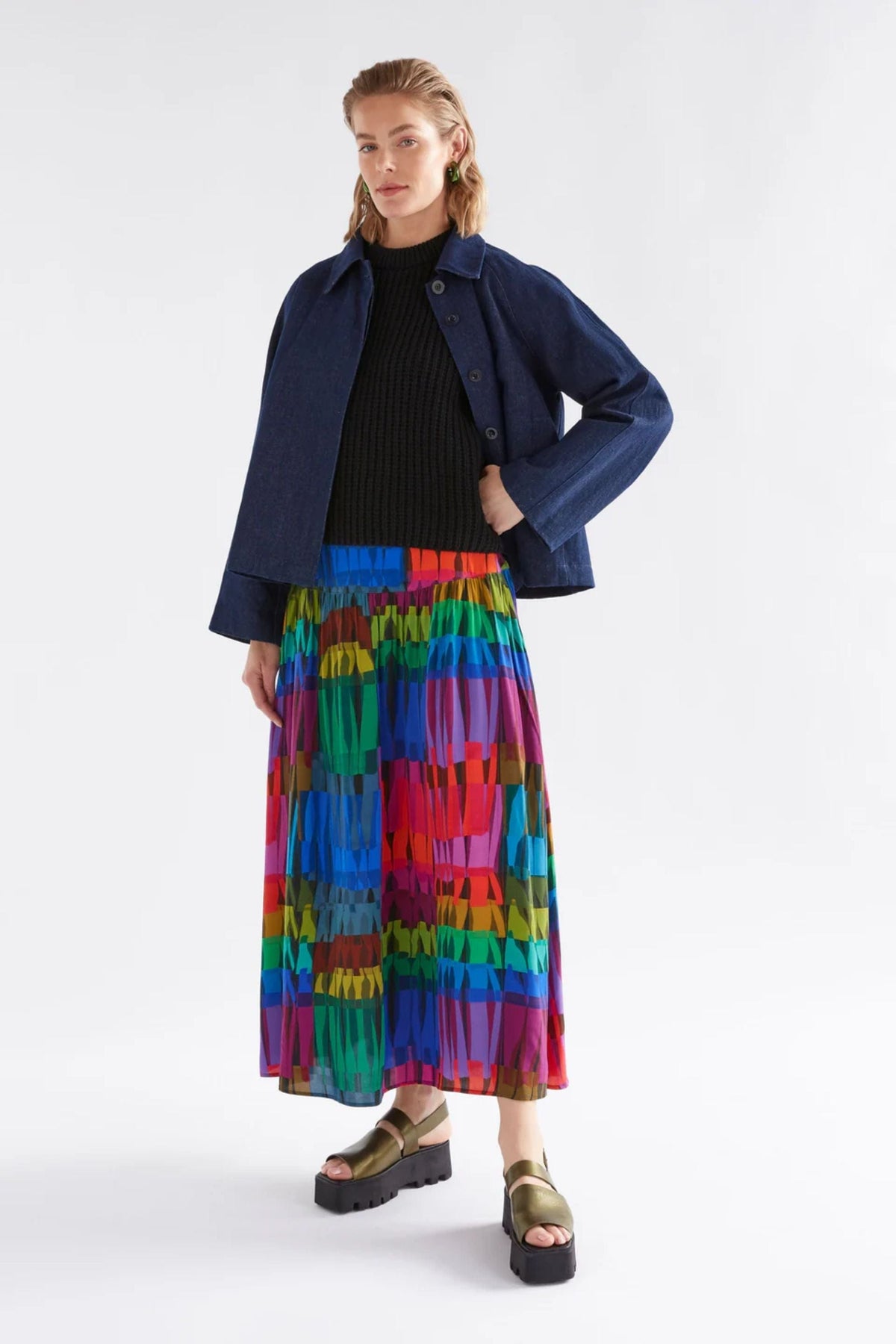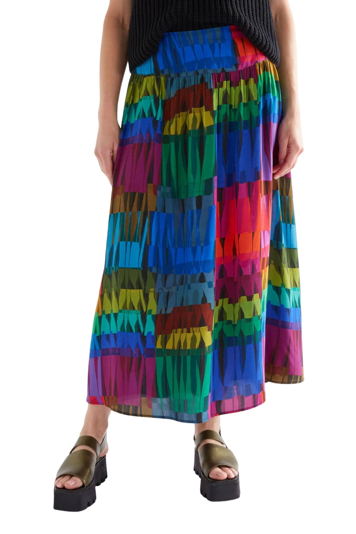 Add a splash of colour to your outfits with the Reva Skirt. Featuring the vibrant multi-coloured Lind Print, this midi length style has a wide basque waist band and sits high on the waist. Crafted from a soft, floaty LENZING™ ECOVERO™ viscose with a matte sheen. This piece has a regular fit waist, straight cut and angled side pockets. Style with simple tops tucked in for your new favourite work-to-weekend look.