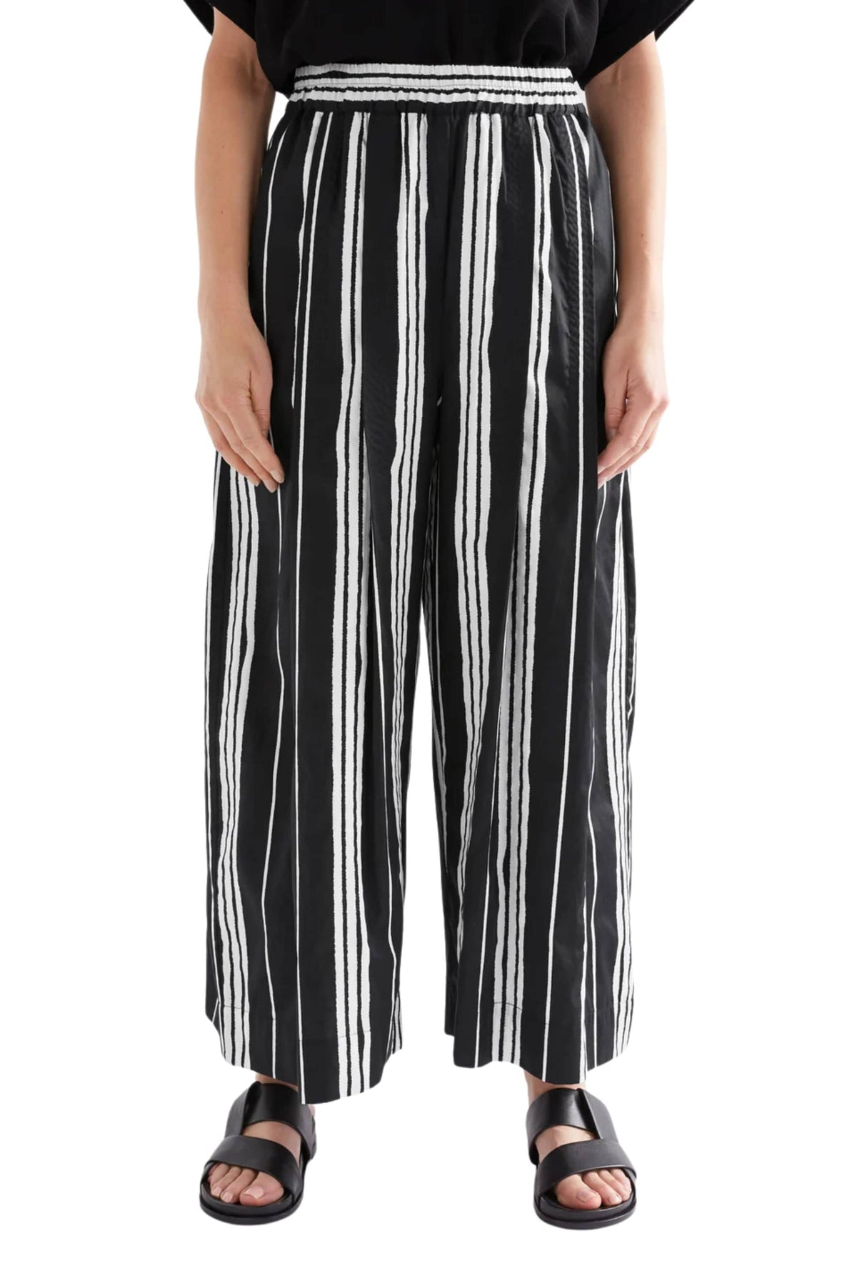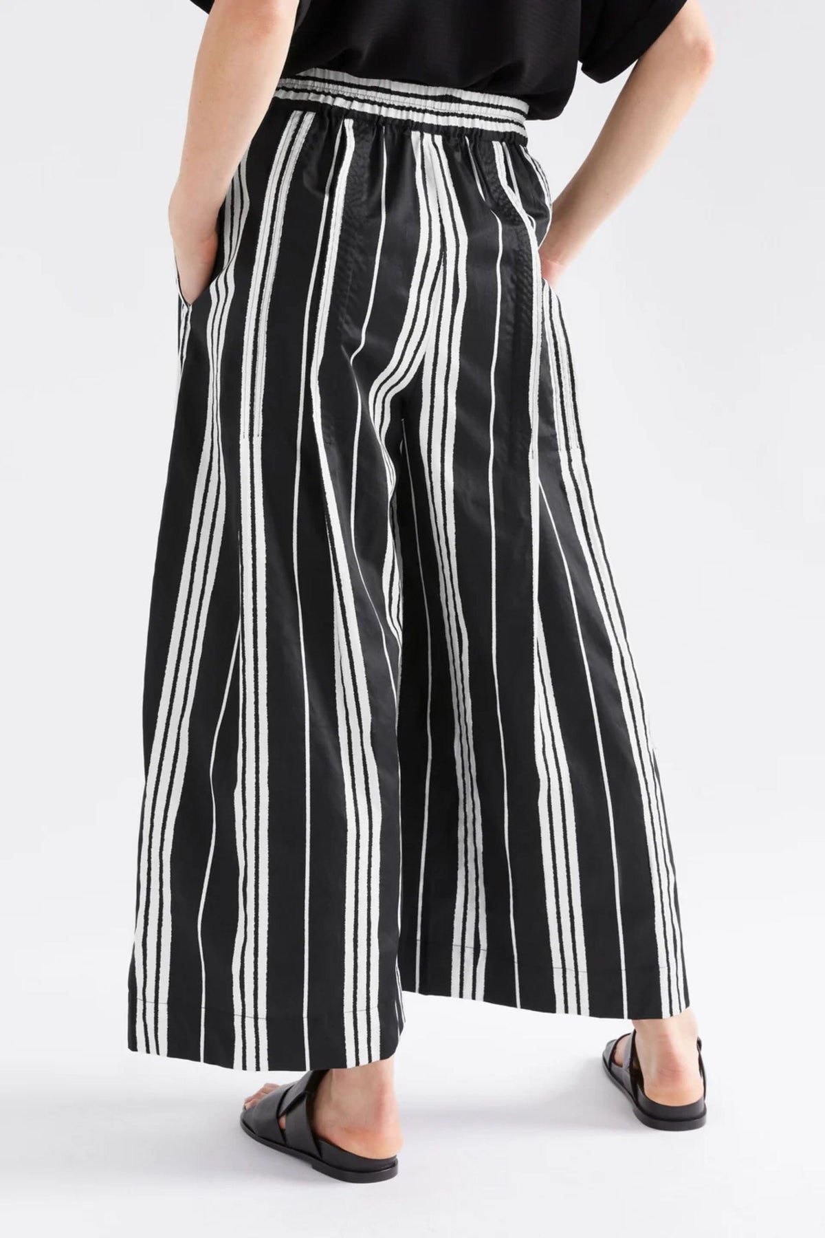The Reza Pants are a high-rise pant featuring a wide-leg silhouette in 100% organic cotton. They are pull-on style with a wide elasticated waistband for a comfortable and easy fit. These pants are finished with stitched down tucks from the waist adding extra volume in the leg.