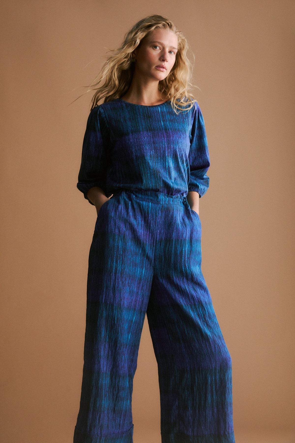 The Vaalli Pant is a wide-leg style with a comfortable pull-on design. Features include an internal drawstring waist tie for a more customisable fit. With a flat front waistband and elasticated back, this style is crafted from a soft, light and responsibly sourced viscose blend. Style with your favourite block coloured tops and shirts or pair with Maer Tee in same print for a playful matching set.