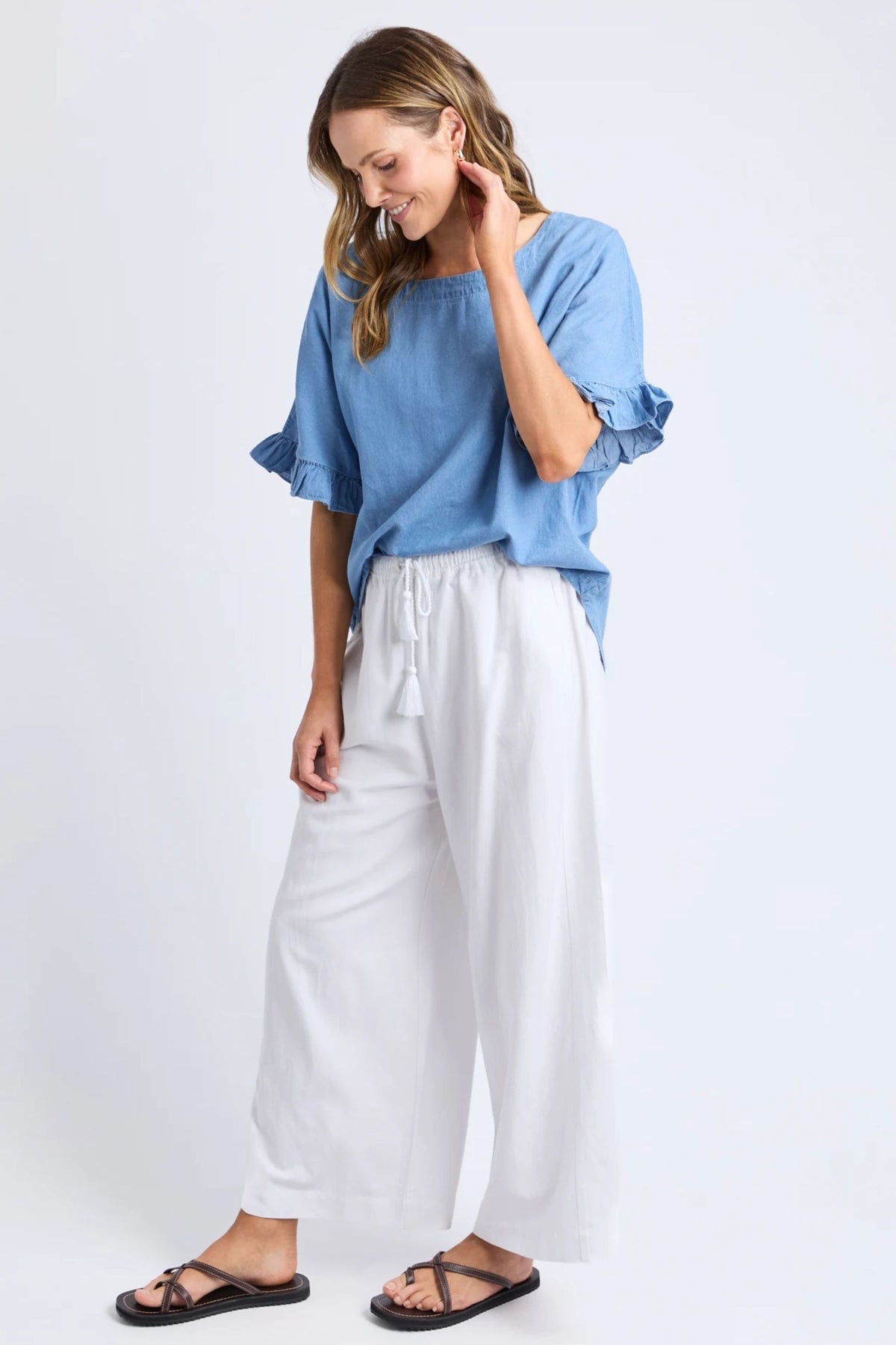 A little bit frilly, a lot of fun. This lightweight top features soft dropped sleeves with a gentle frill on the bottom making them a great coverall over the arms. Made from 100% cotton chambray this is a fabulous versatile top for every occasion.