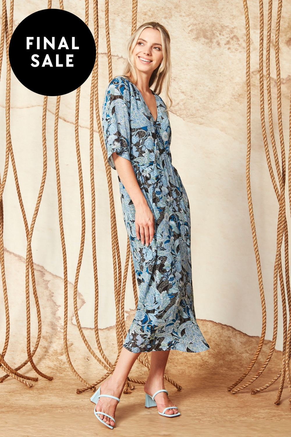 Stunning Aria print dress with V neckline. Panelled detail on front with panelled skirt. Zip back entry. Set in sleeve is slightly fluted and falls below just below the elbow. Back is shaped and waisted. The Aria dress falls to lower calf.