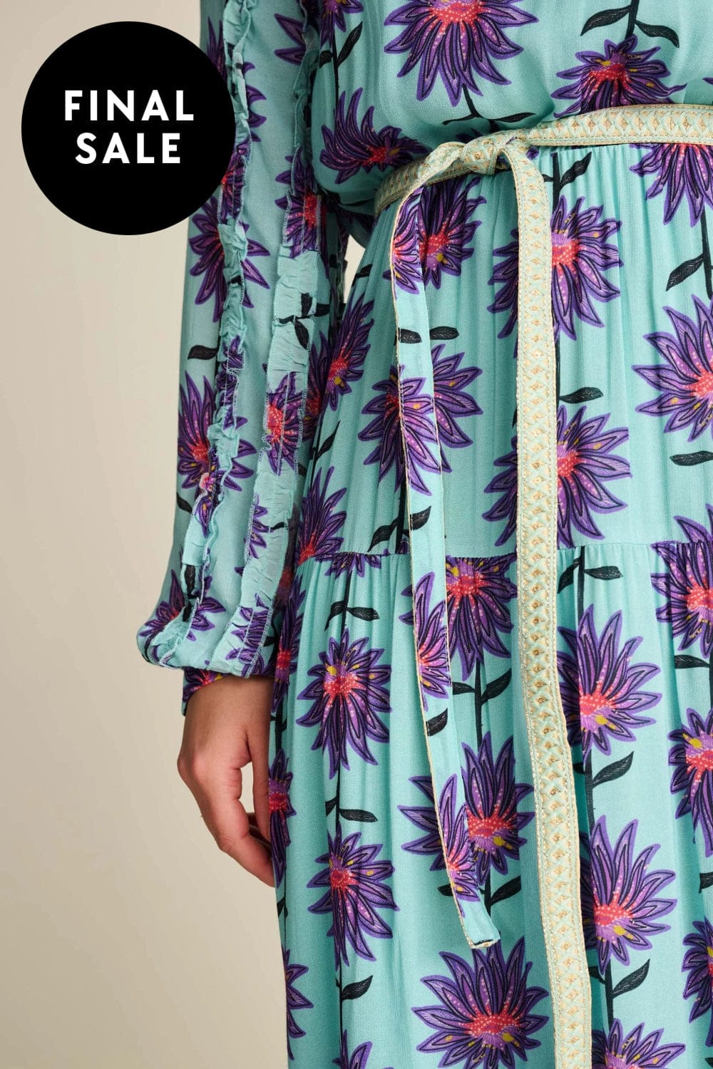 • A-line and flounces at the hem