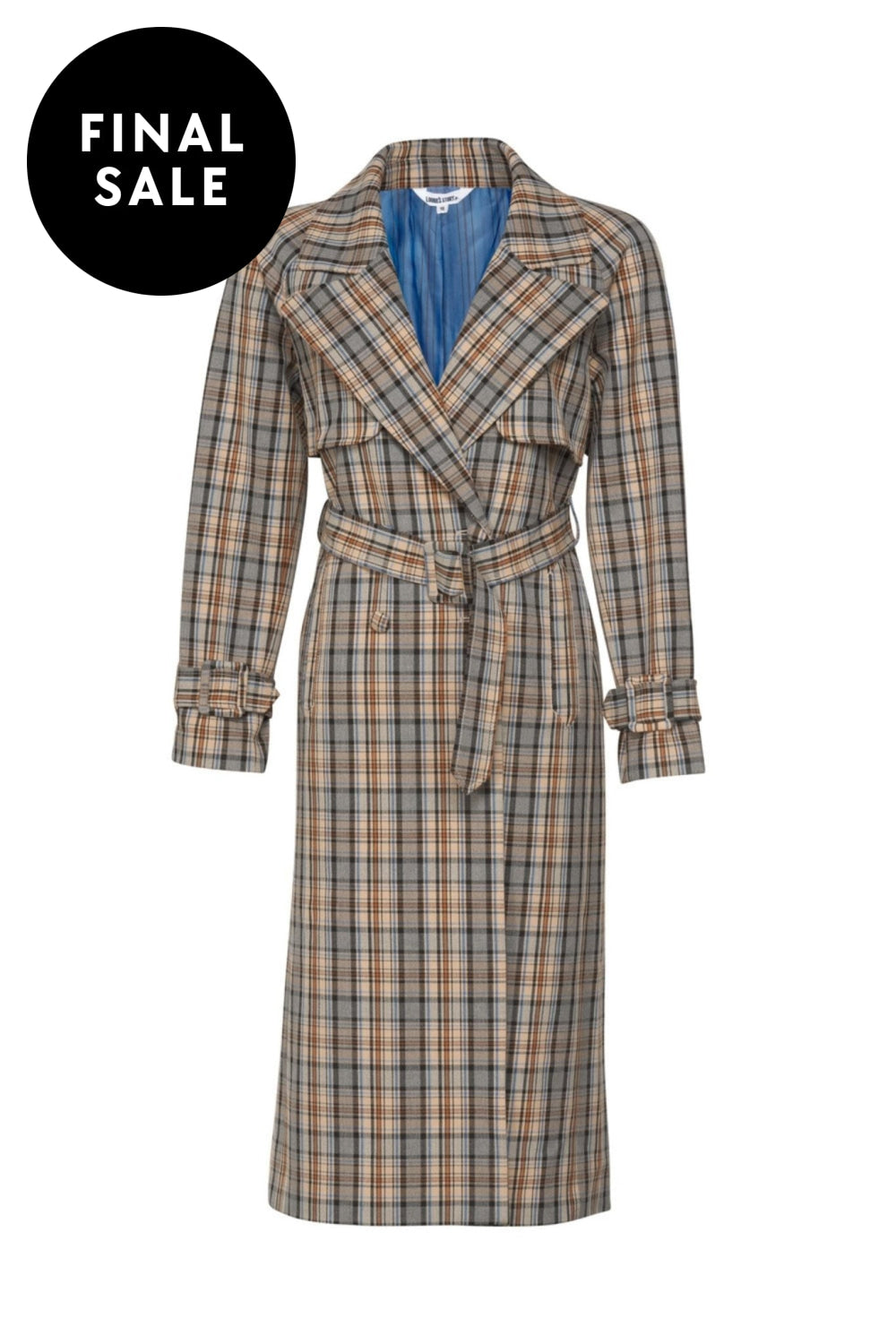 Longline double breasted trench coat with rain flap detail, with self belt and matching buckled straps at cuffs. Fully Lined.