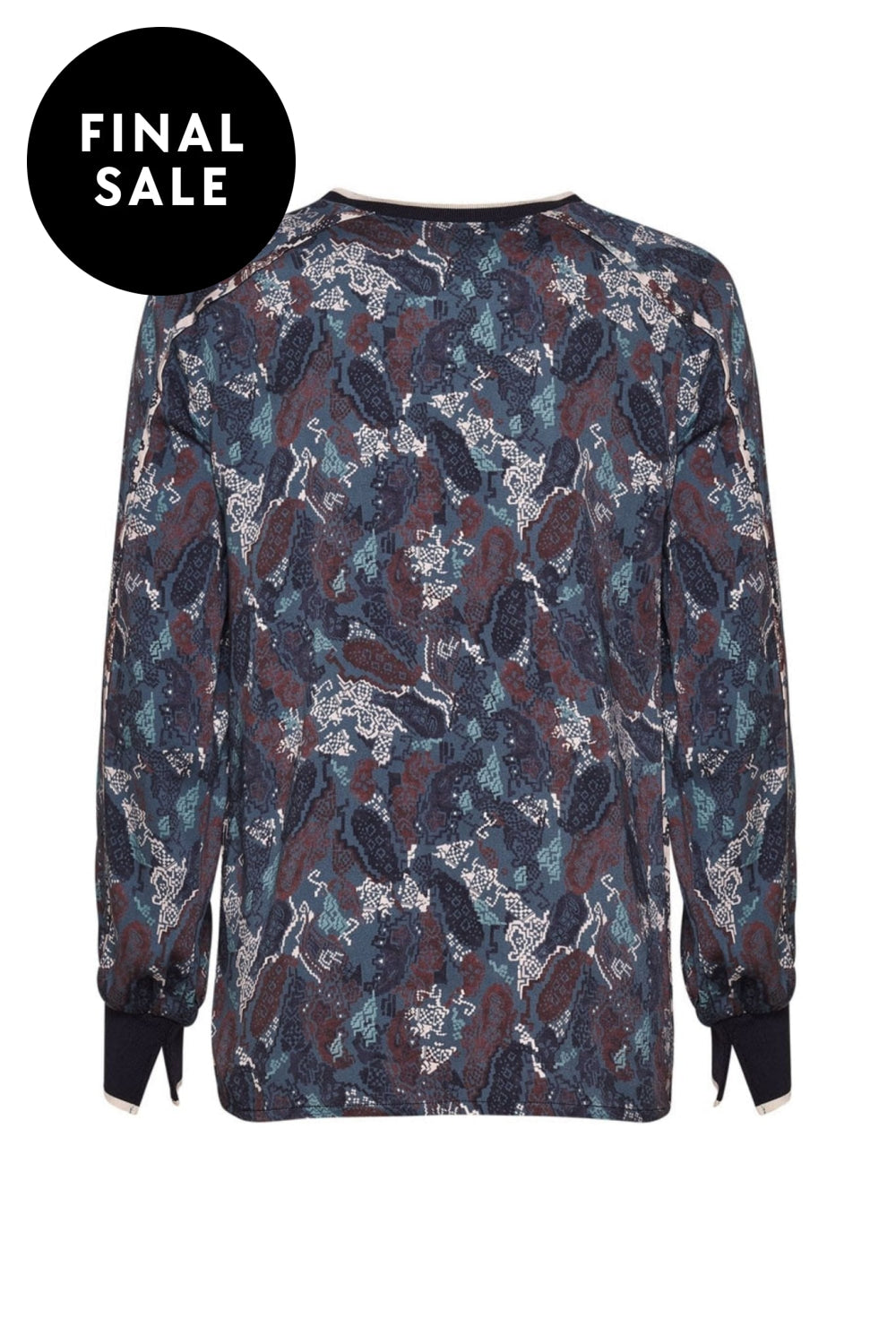 Perfect for a weekend getaway, wear the Level Up Top from Madly Sweetly with tan jeans and boots. Stretchy printed top with small ruffle detailing around the shoulder and down front sideseams. Featuring striped neck band, split cuffs and front hem panel.