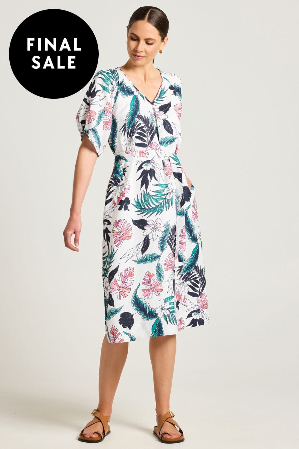 Fresh linen blend summer dress with short bishop sleeves and side pockets. A great wearable summer dress.