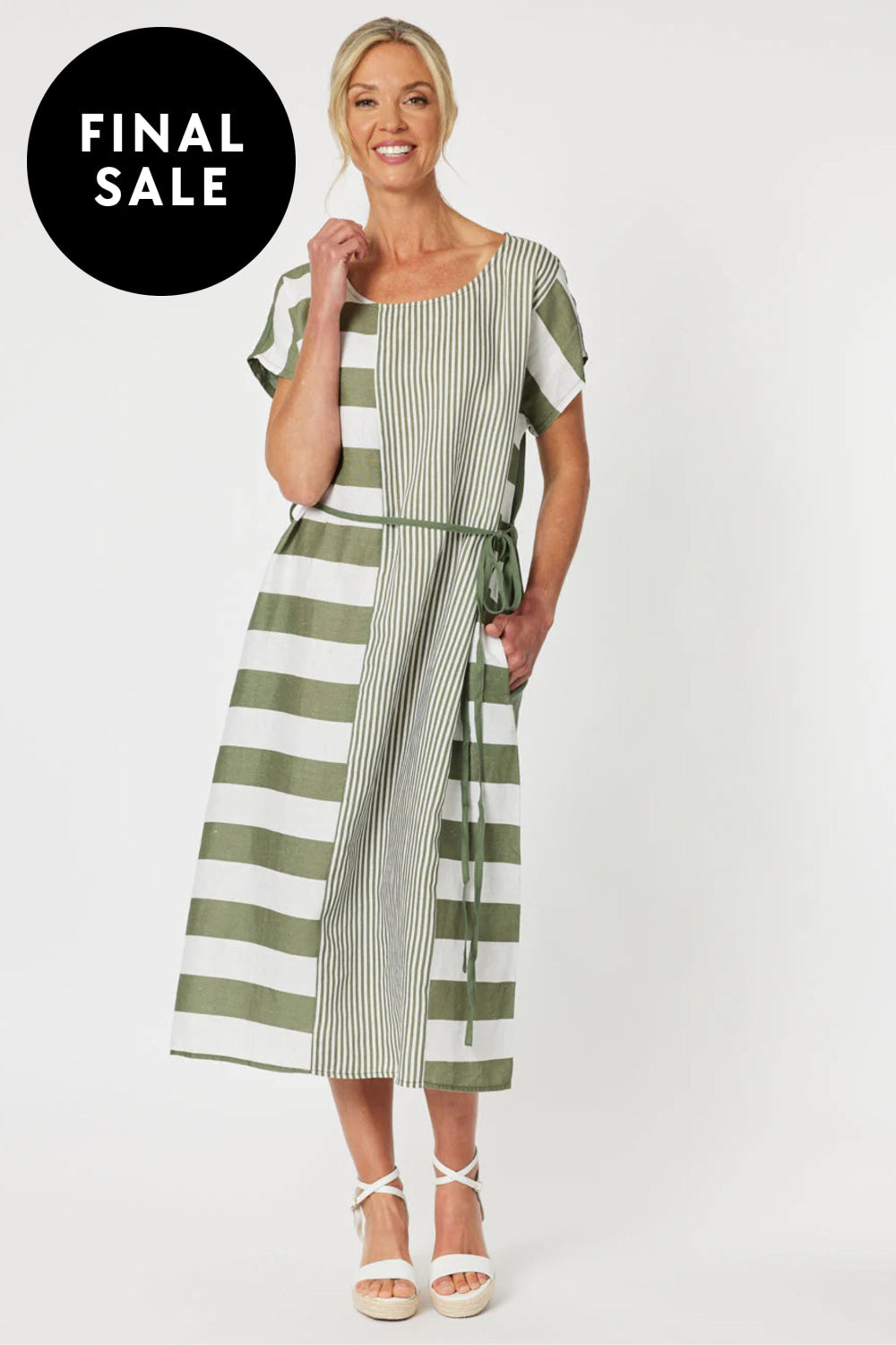 A best selling style returns in a fabulous new season colour. The Patio Stripe Dress is a striking combination of stripes and plain panels. The direction of the stripes makes for a flattering silhouette. The flattering extended shoulder line creates the perfect sleeve length, and we love that it has a detachable tie and pockets.