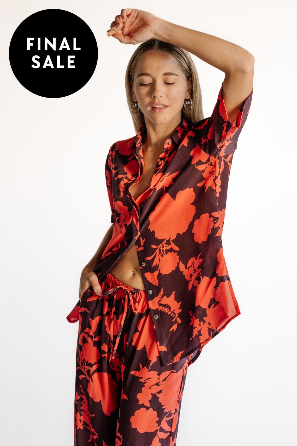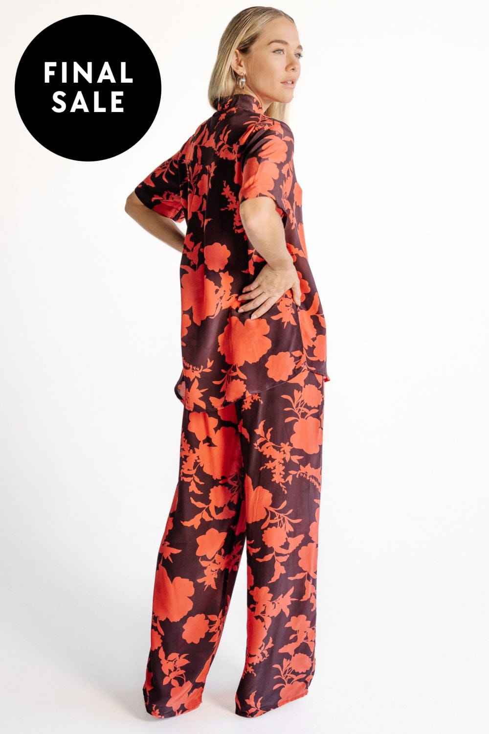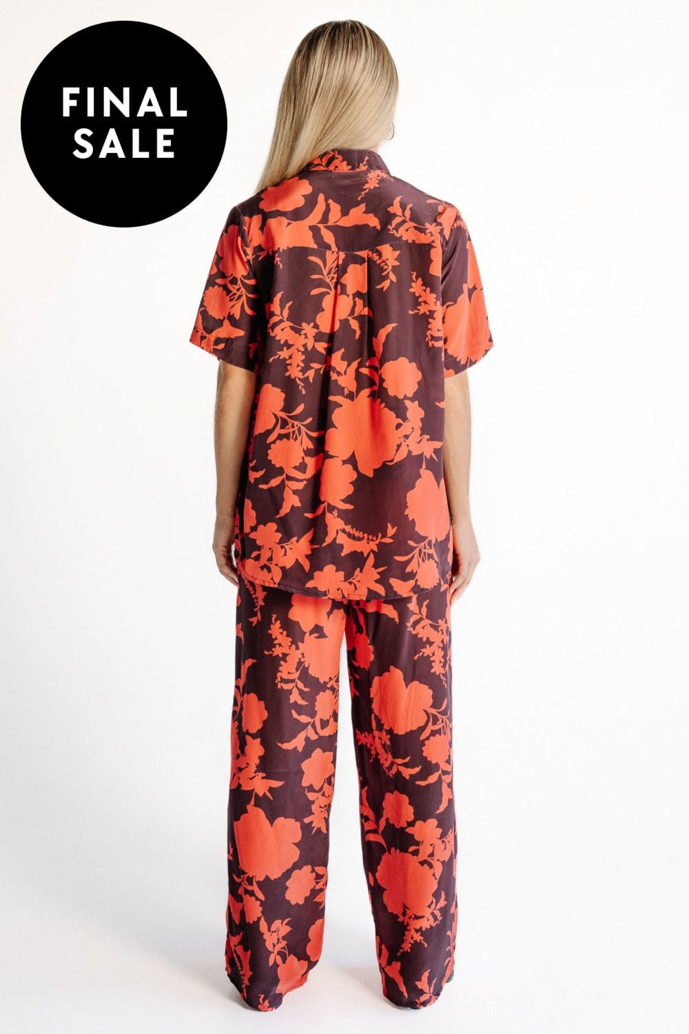 A relaxed, short sleeve shirt crafted from matt silk crepe in the exclusive Camellia print in coral and aubergine for an elevated yet effortless look. A relaxed yet slimming silhouette with small side splits and a longer back hem. Pair with the Portofino Pant for a complete holiday ensemble.