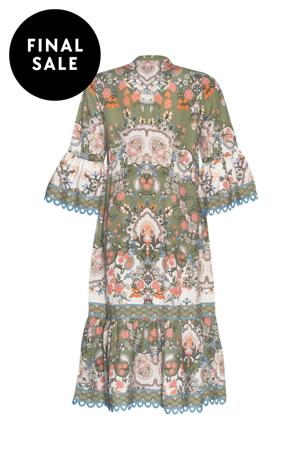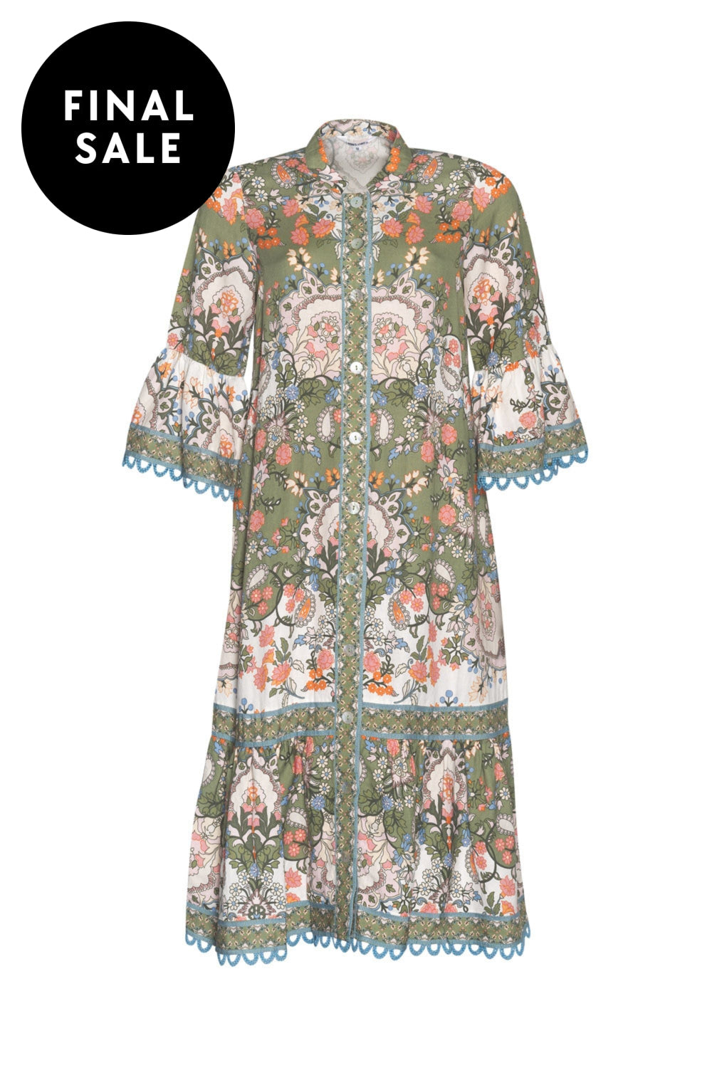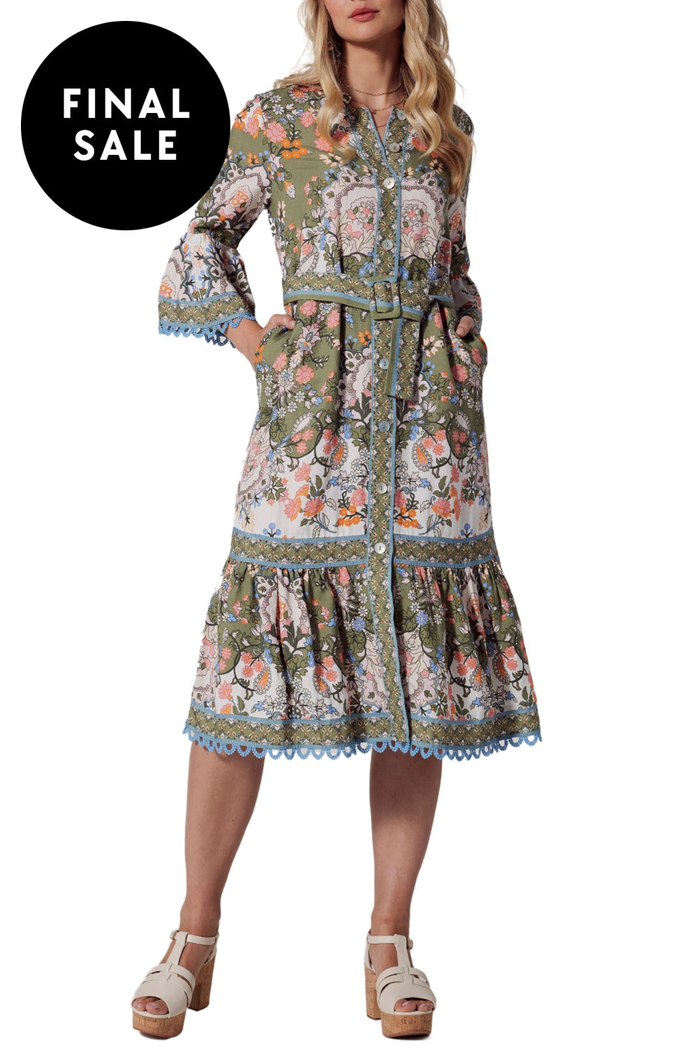 Button through midi dress with 3/4 length ruffled sleeves, with matching self belt, and hidden in-seam pockets. Featuring contrast piping detail, with cotton lace trim and shell buttons.
