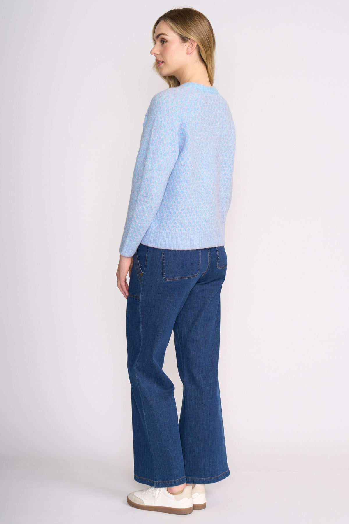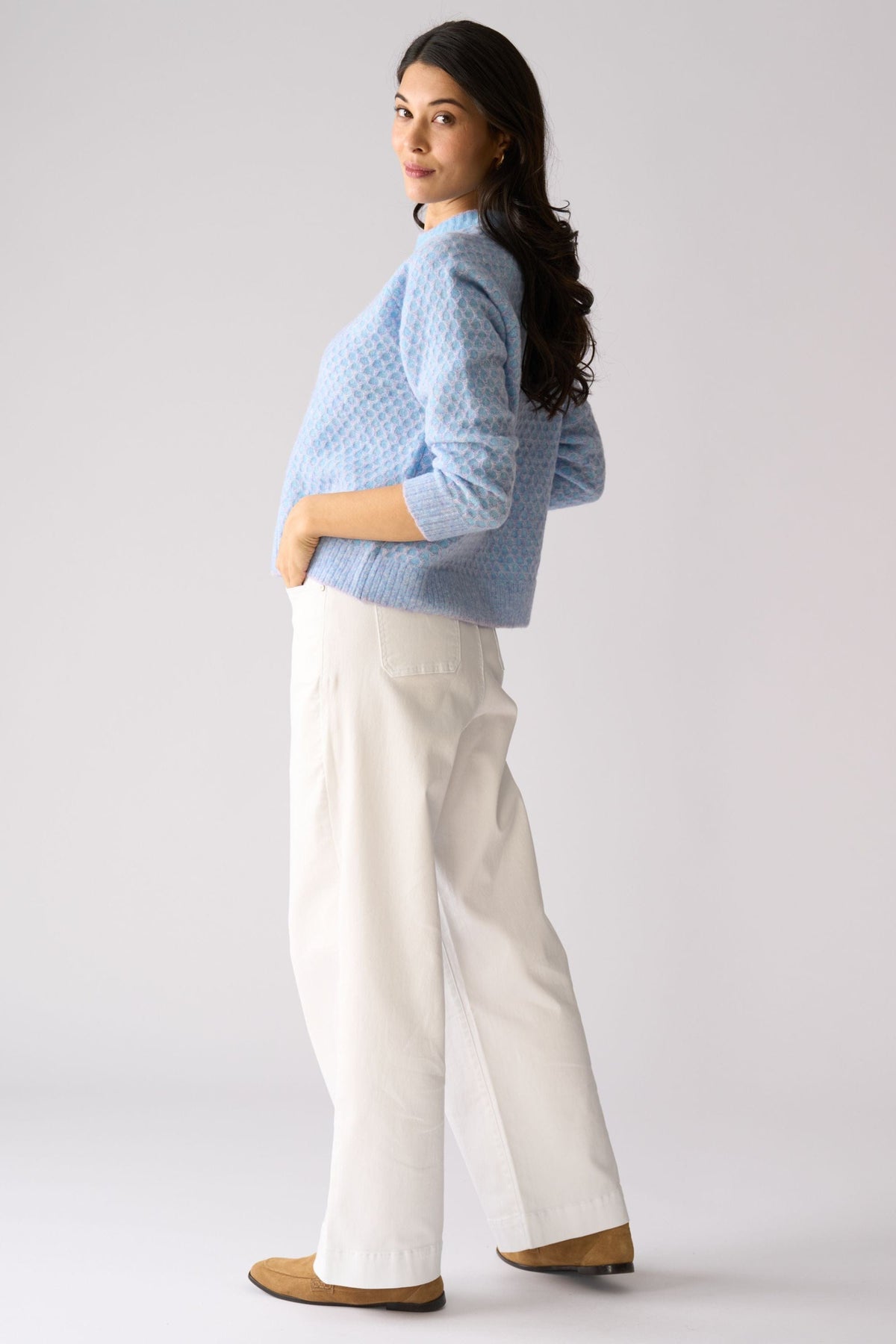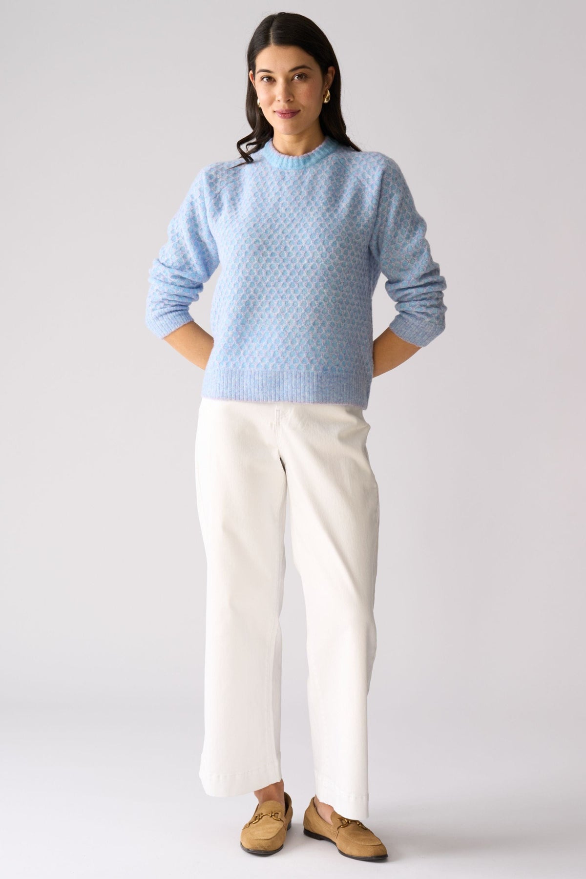 A soft, cosy knit designed to bring subtle texture and warmth to your everyday wardrobe. Crafted in a stretch knit with a gentle hand feel, it features a classic crew neckline and ribbed cuffs, and dual tone, honeycomb pattern.
