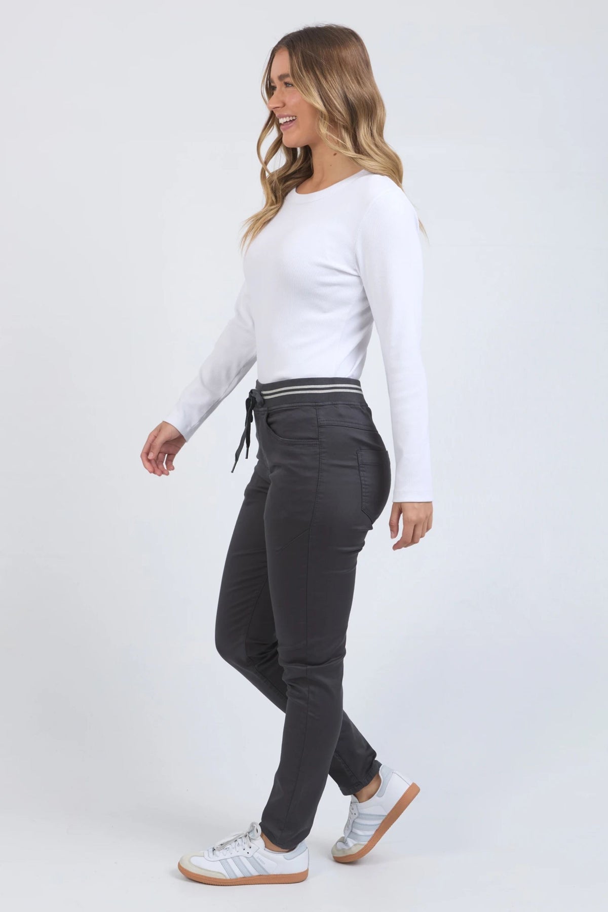 Comfortable and relaxed the Sylvia Jogger is constructed from a super soft two-way stretch cotton drill in a midweight fabric, these pants feature 2 side pockets, 2 back pockets, and an elastic waistline with a soft drawstring. Ideal for casual wear all day, every day.