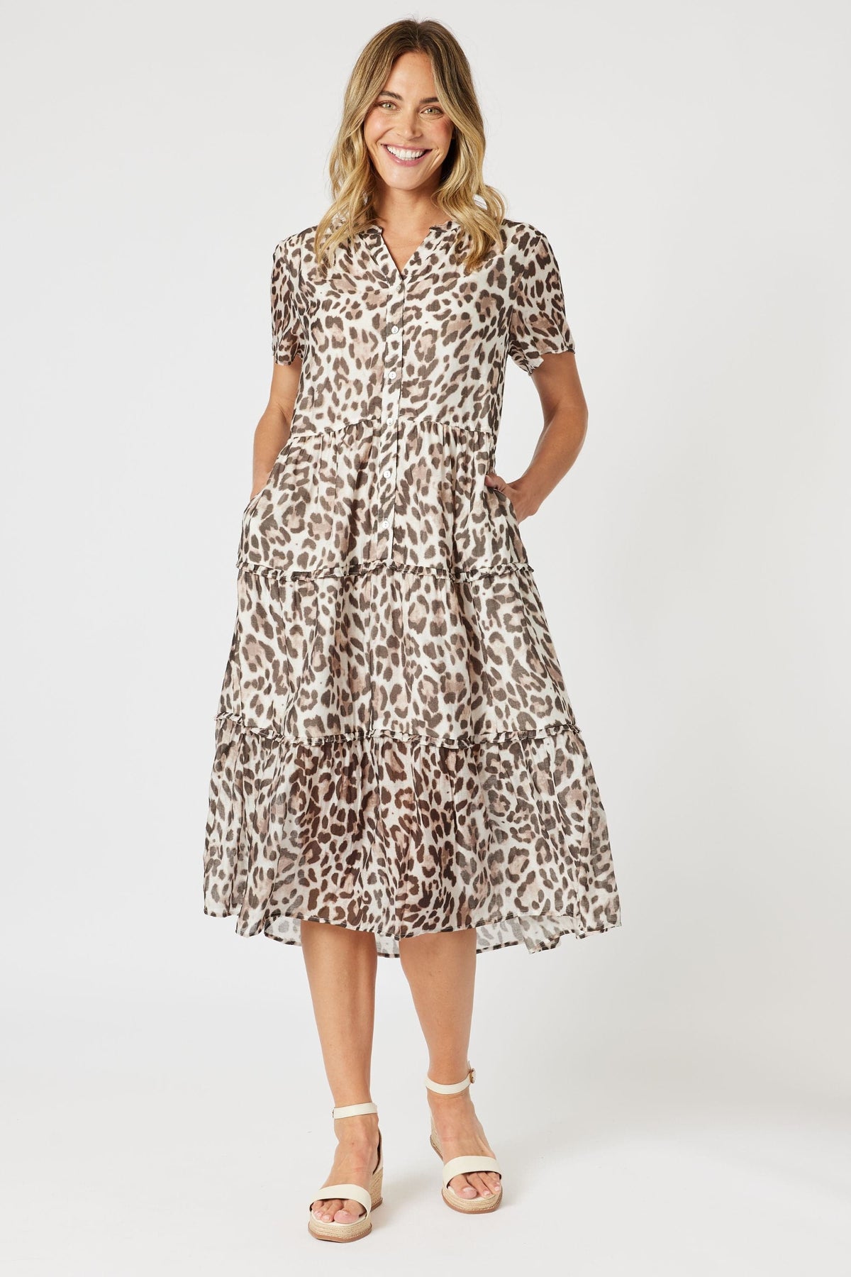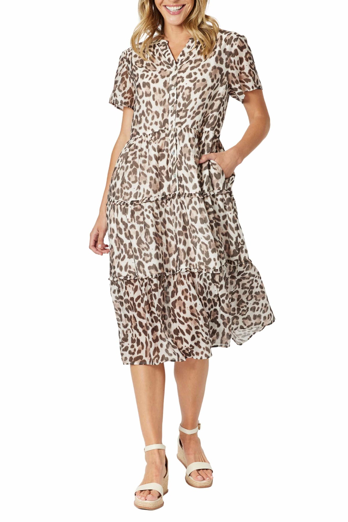 The On Safari Dress features a striking animal print in our signature Gordon Smith silhouette. Designed with short sleeves, and a 3/4 button front, it offers comfort and ease in equal measure. A cotton lining through the body ensures breathable coverage, while the calf-length hem keeps the look polished and versatile. Perfect for work, weekends, or travel - it’s effortless style with a wild side.