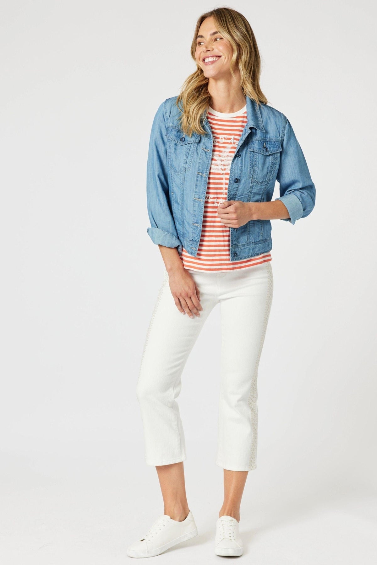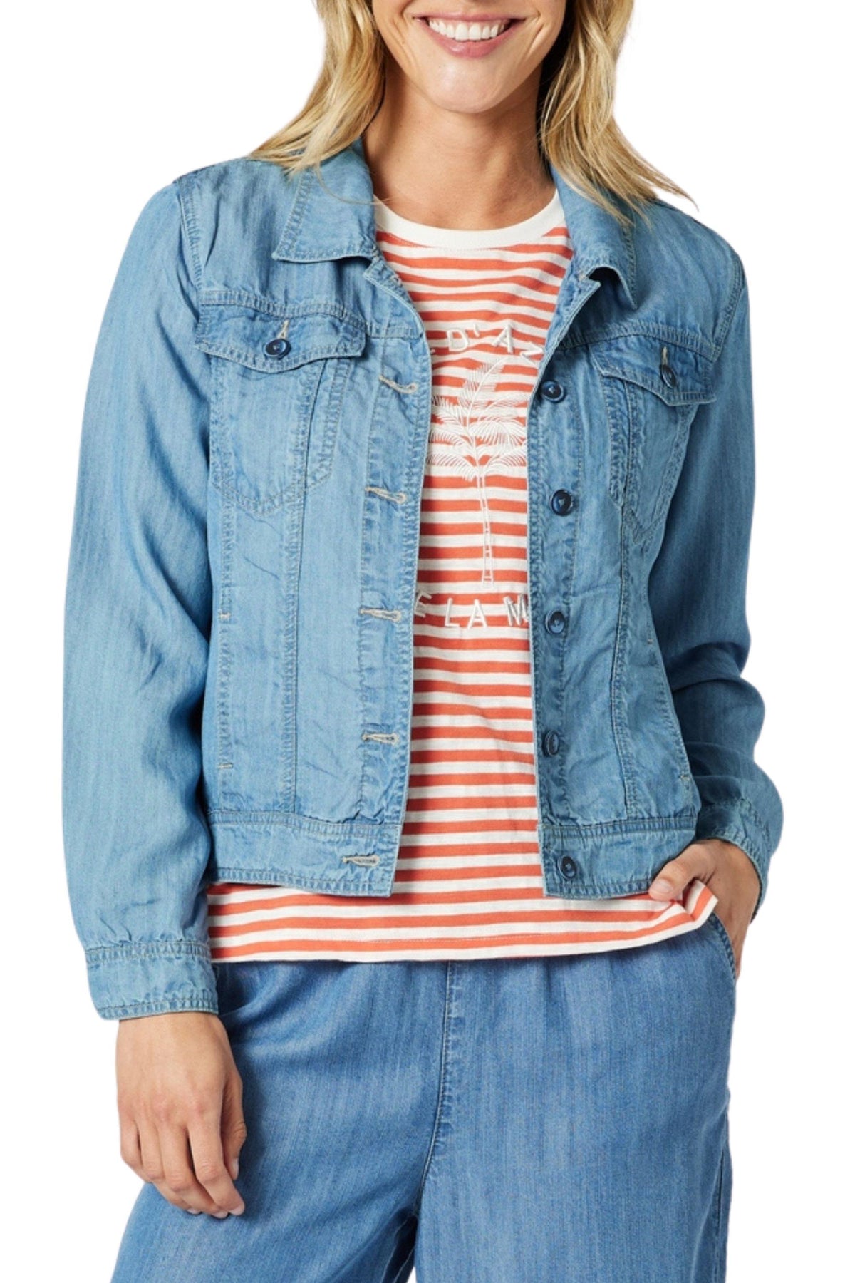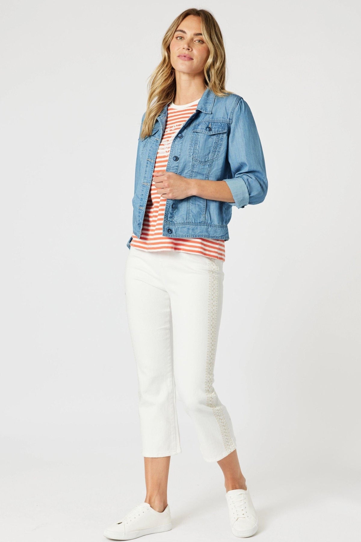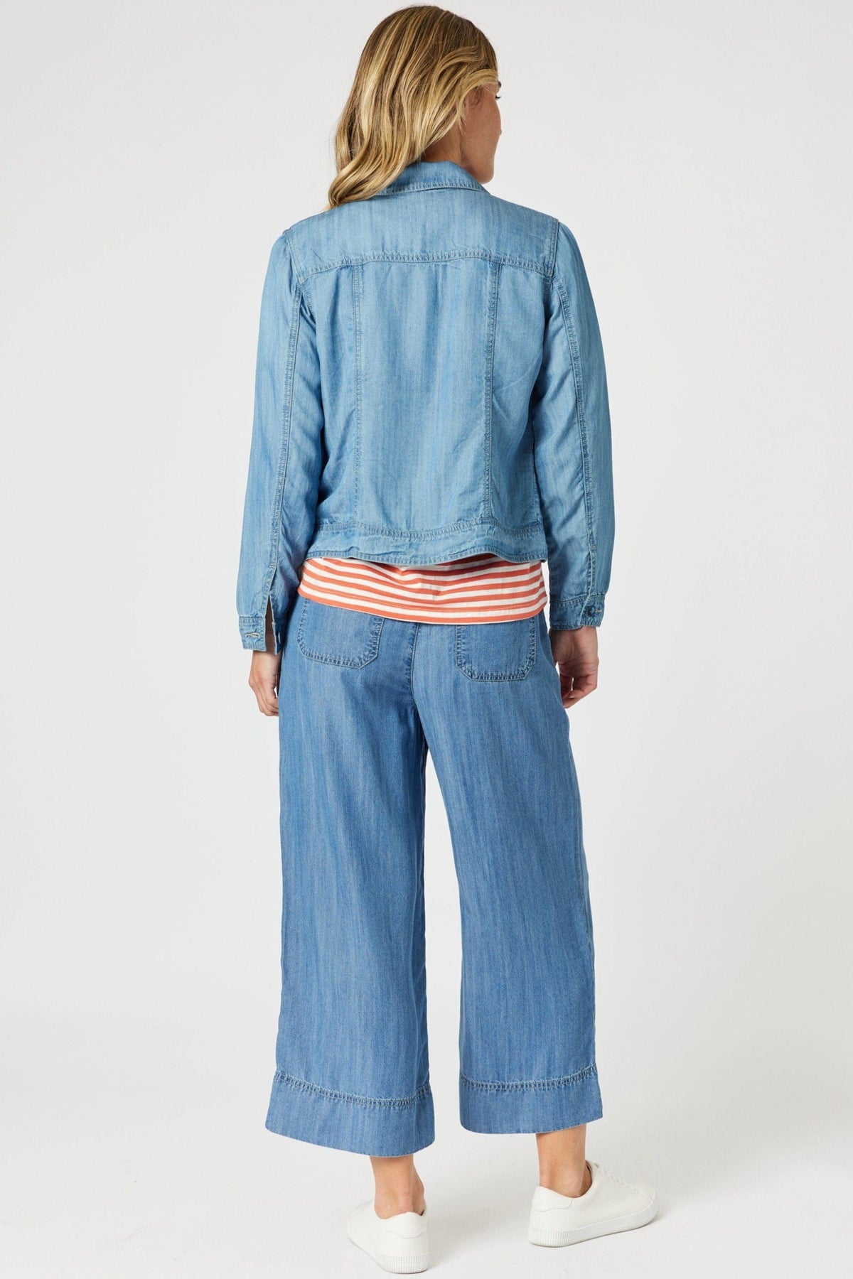 The Sandie Denim Jacket is crafted from 100% cotton for a lightweight feel that’s perfect for layering across seasons. Designed with subtle panelling for a flattering fit, it sits at the hip for easy styling and features secure, functional pockets for everyday practicality. A true transitional staple - throw it on over dresses, knits, or tees for timeless, effortless style.