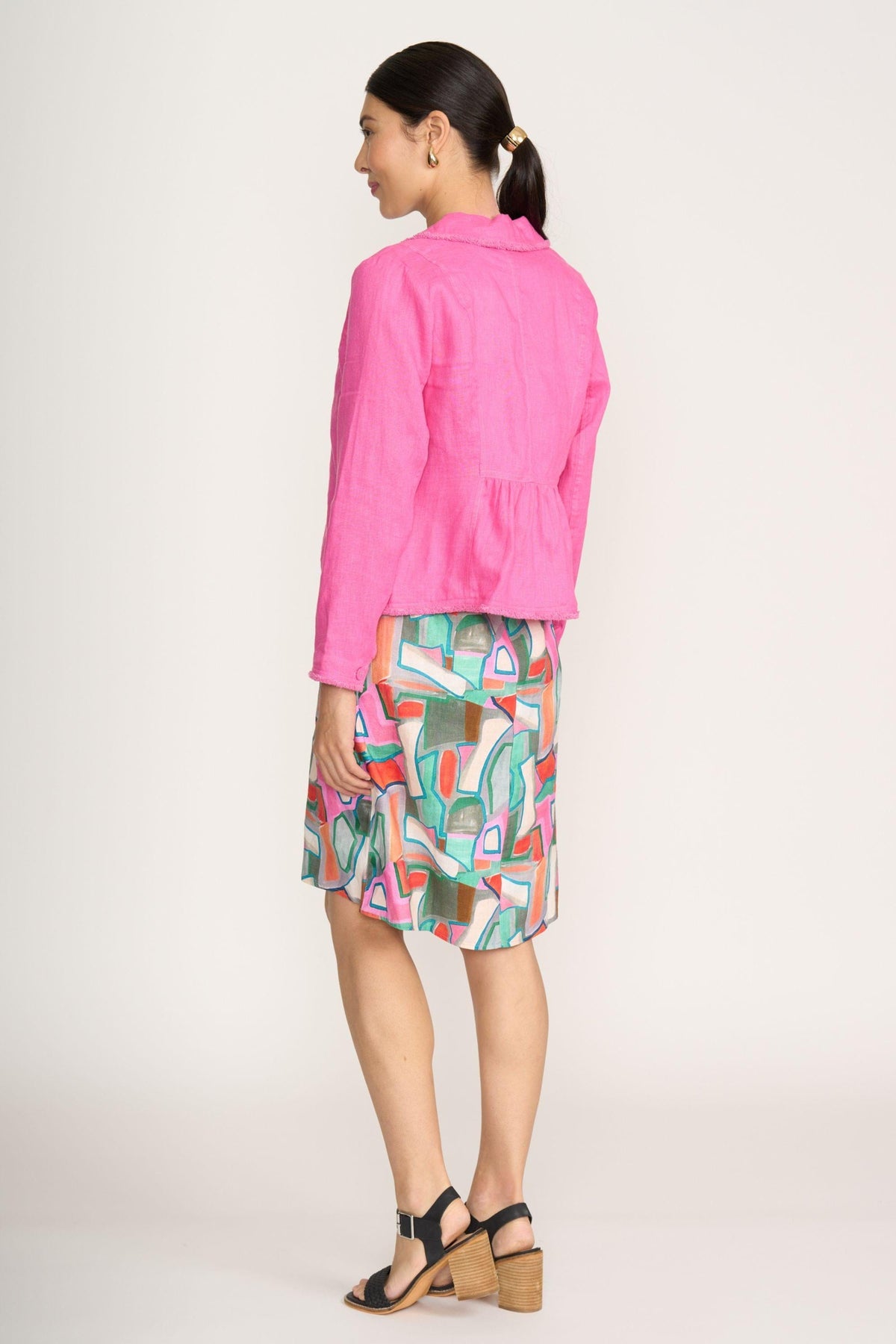 A softly tailored layer that instantly pulls outfits together. This lightweight jacket features a neat collar with revere and a gently curved hem that skims the hip. Subtle seam work through the back adds shape without feeling tight—perfect over dresses, tees and wide-leg pants when you want polish without the bulk. Fringe detailing on hem, collar and cuff. Wear with the matching Navy skirt.