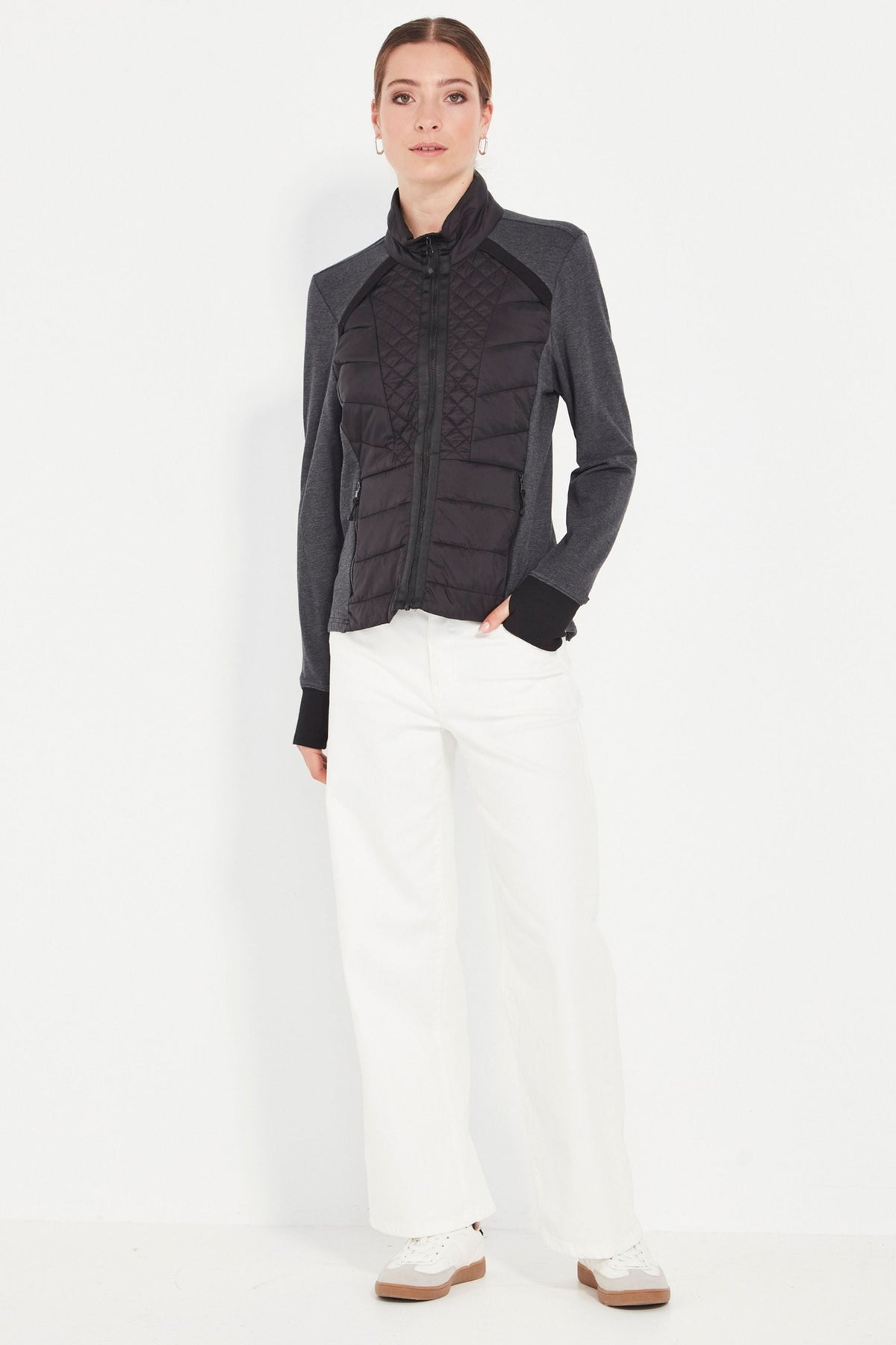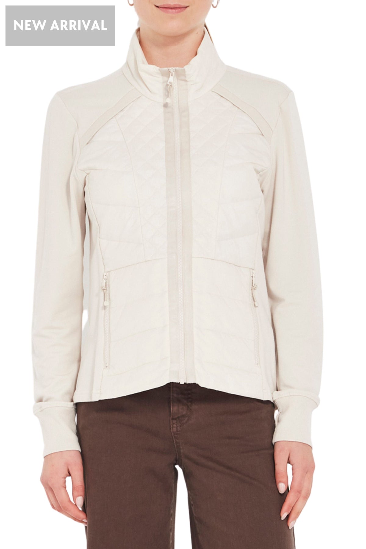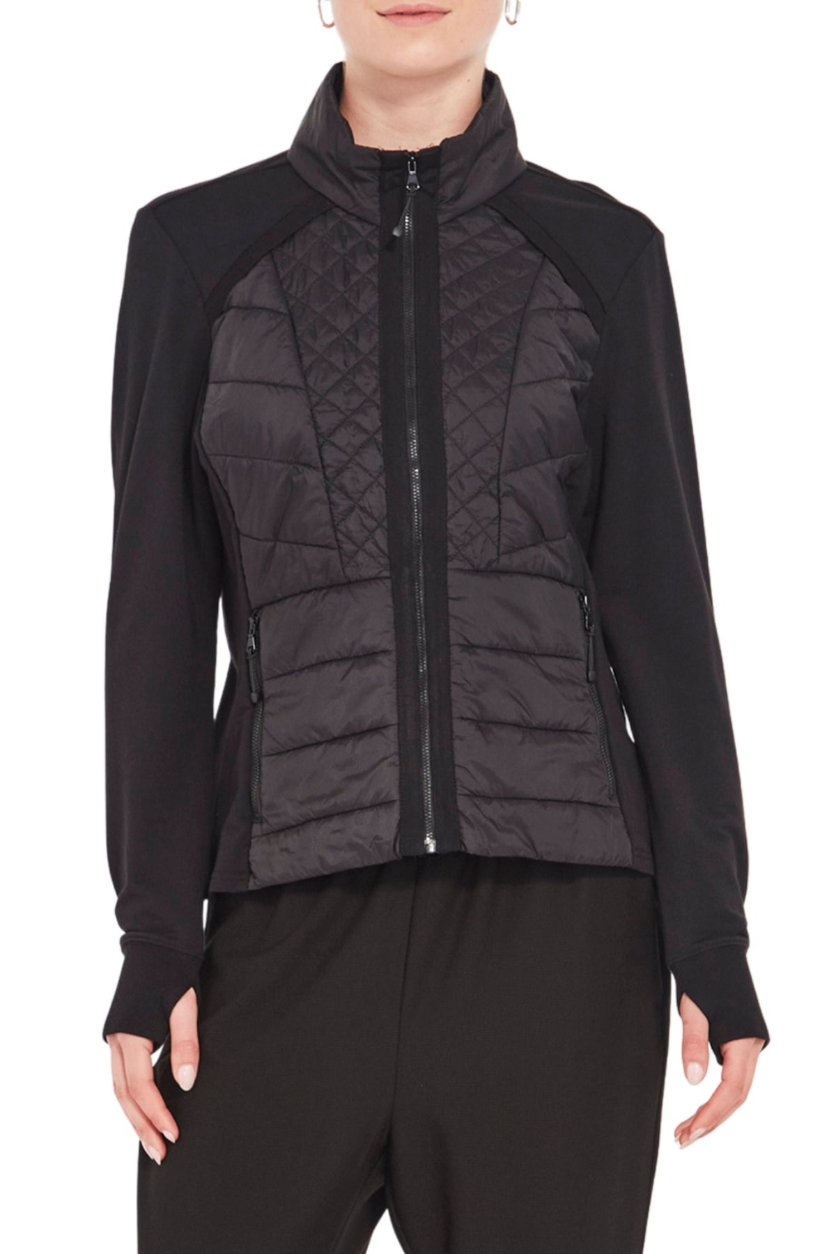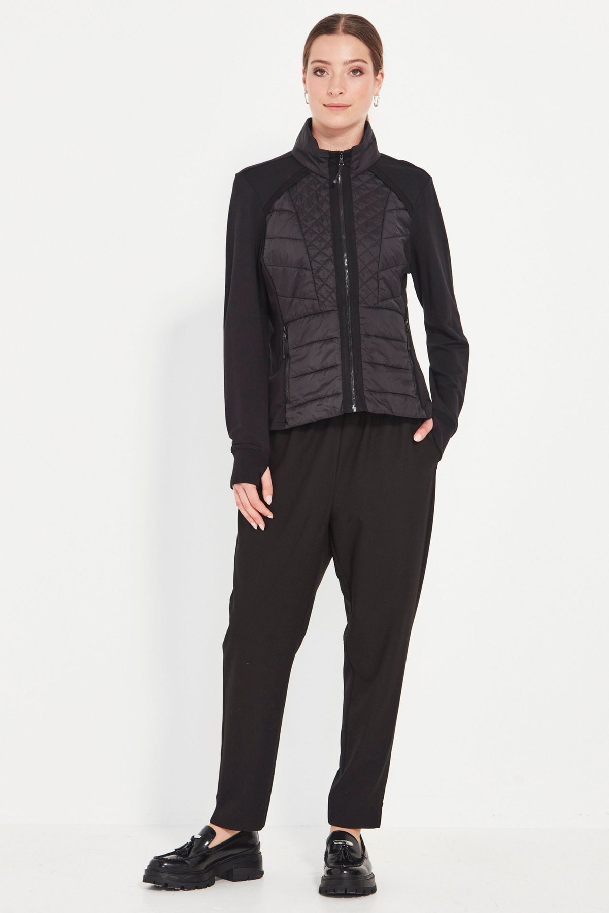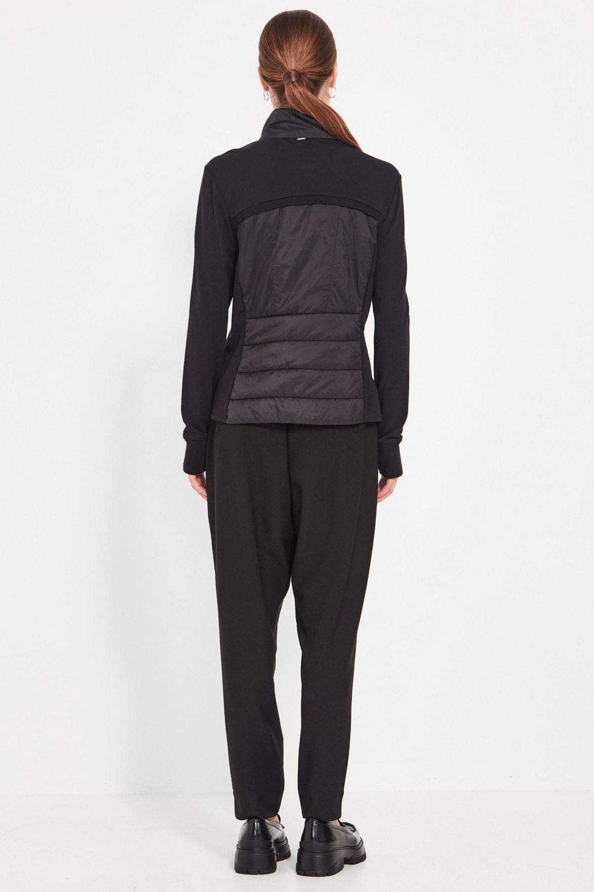 Your perfect winter travel companion! Unbrushed French Terry jacket with quilted front panels. High neckline. Front zip. Side pockets. Full length sleeve with cuff. The Idaho jacket is fitted to the body and falls to the hip.