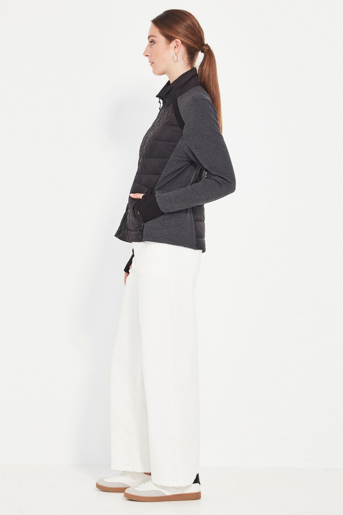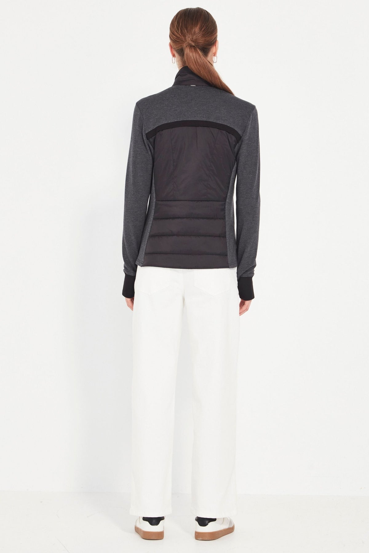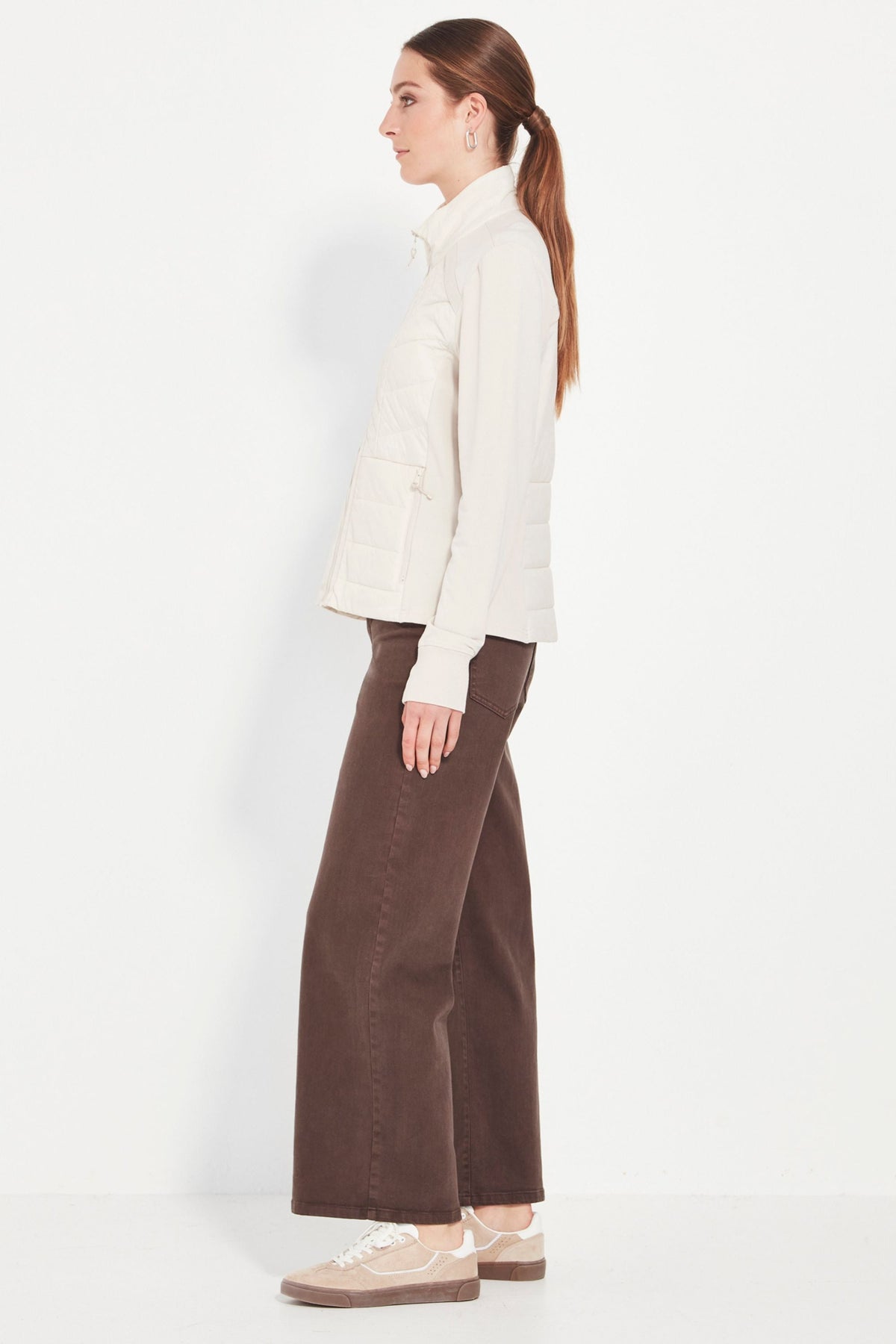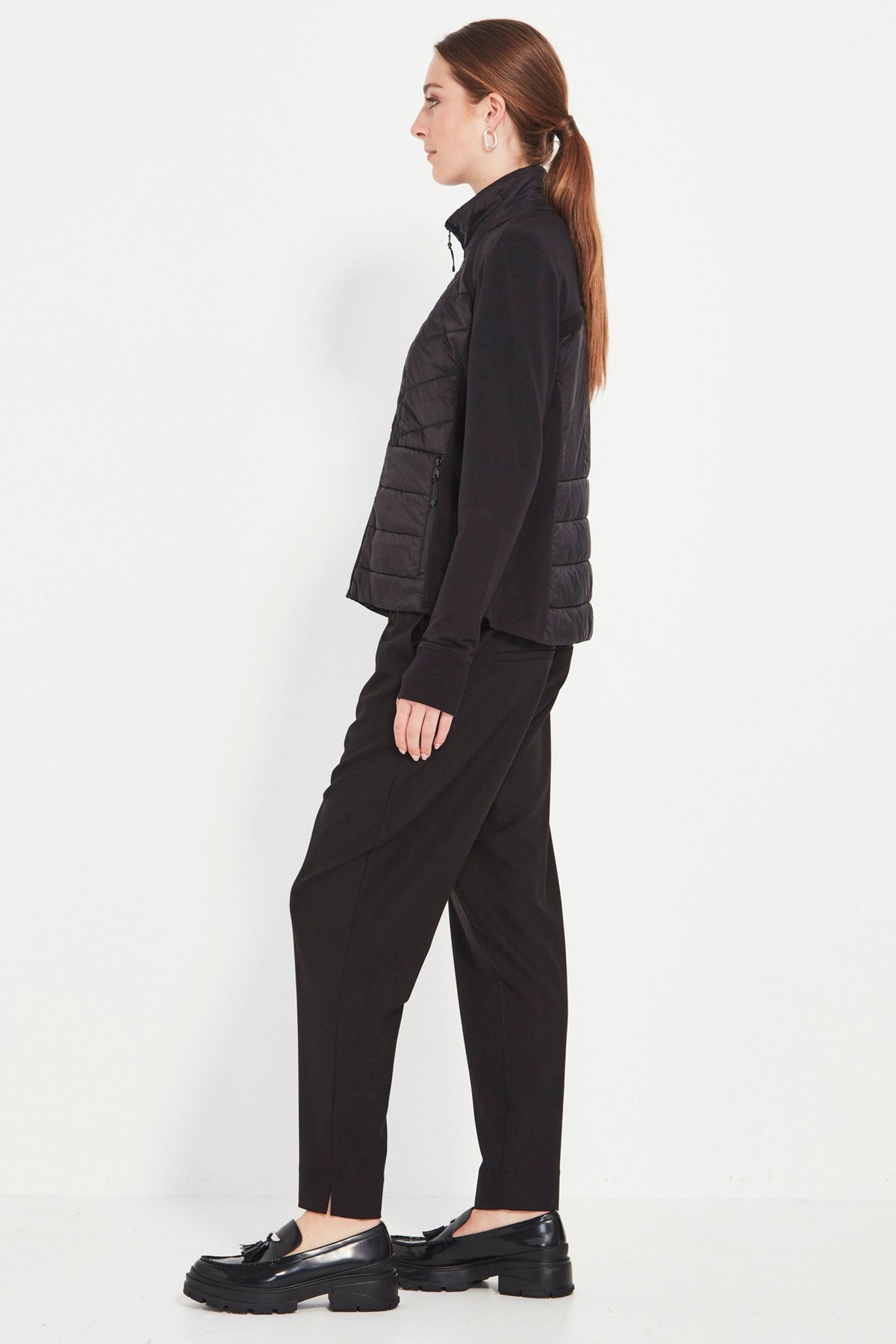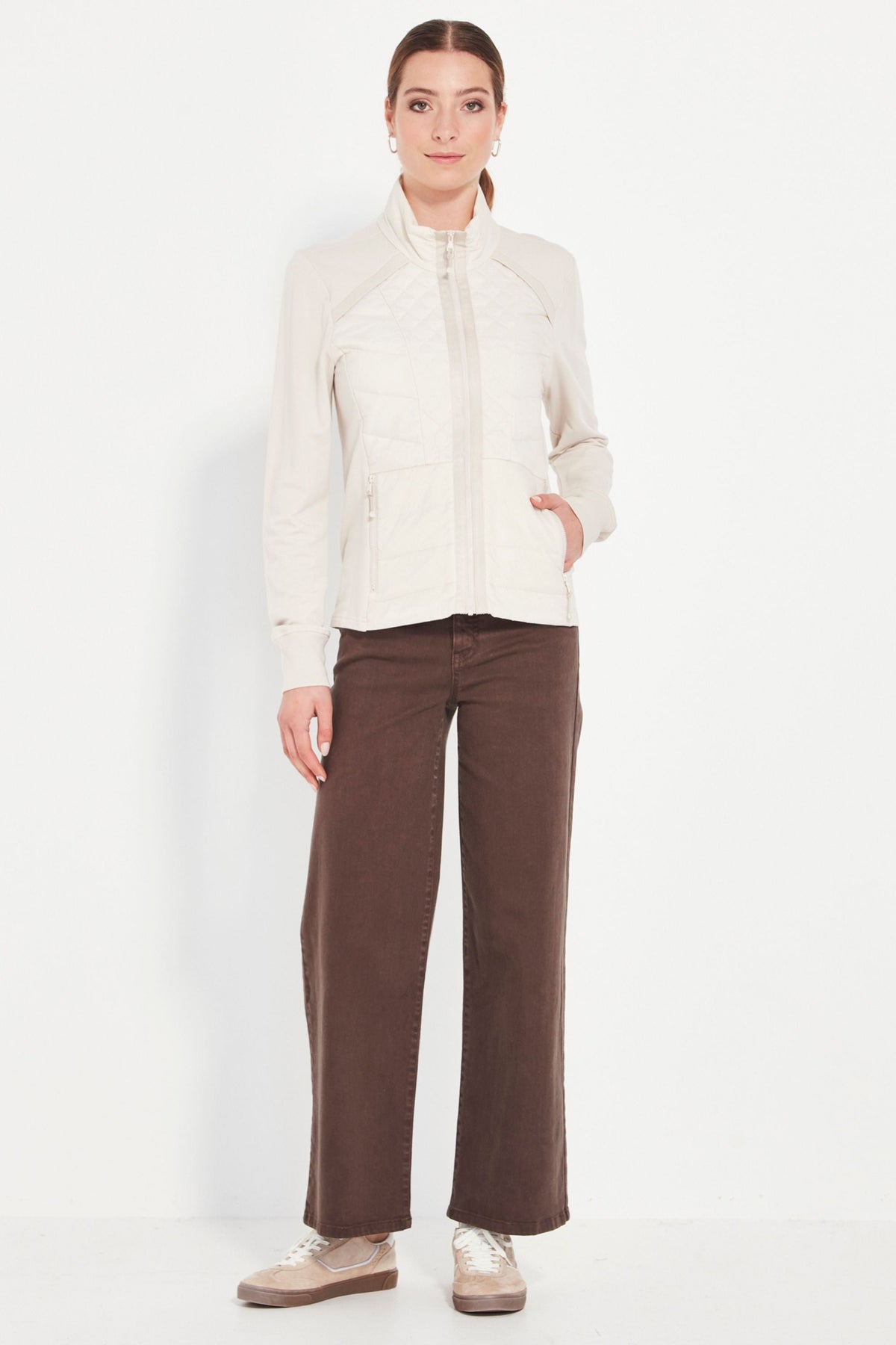Your perfect winter travel companion! Unbrushed French Terry jacket with quilted front panels. High neckline. Front zip. Side pockets. Full length sleeve with cuff. The Idaho jacket is fitted to the body and falls to the hip.
