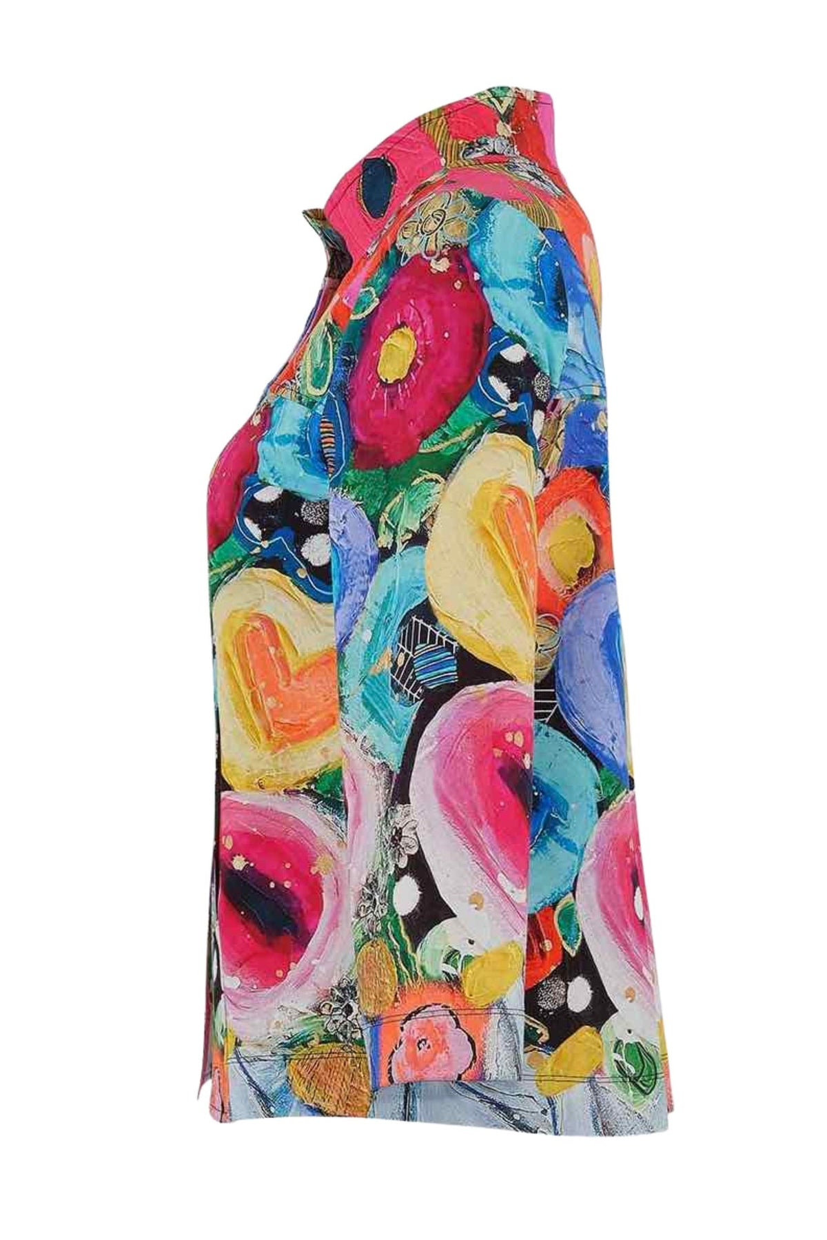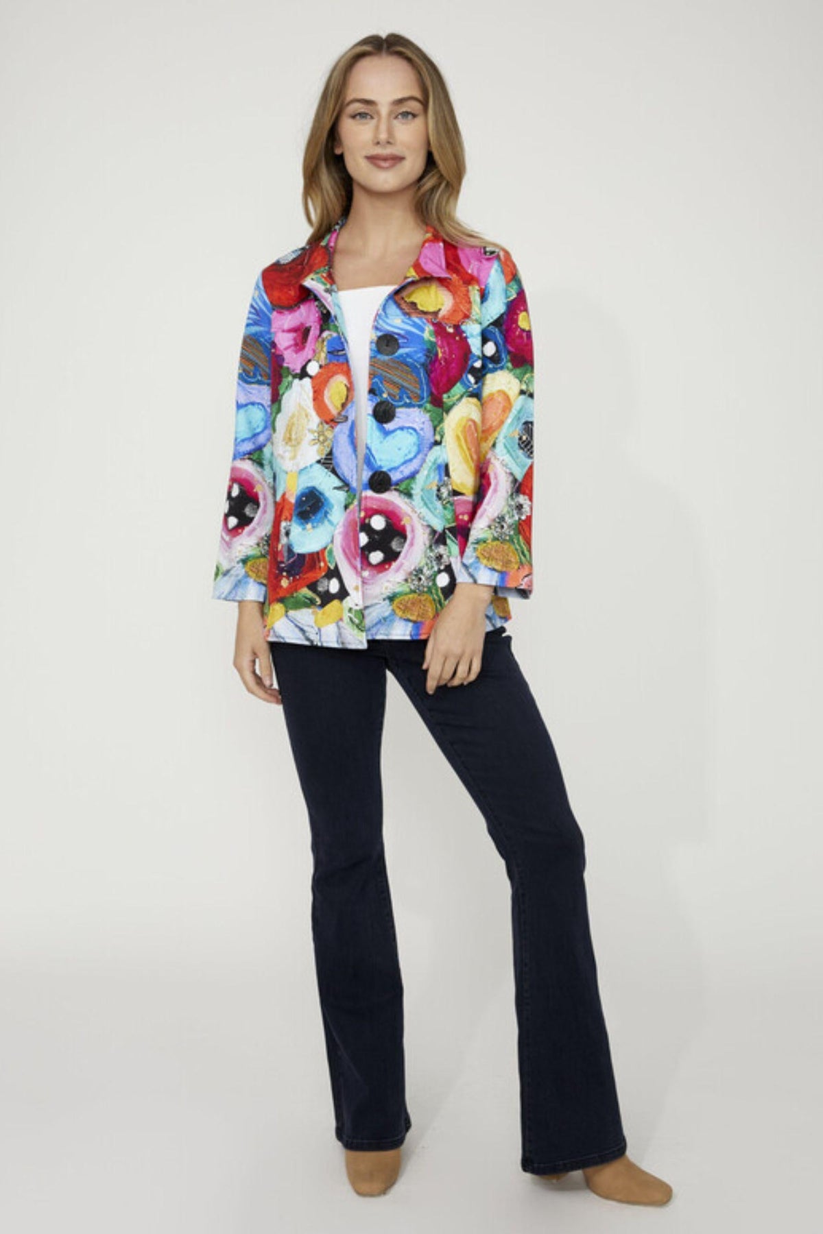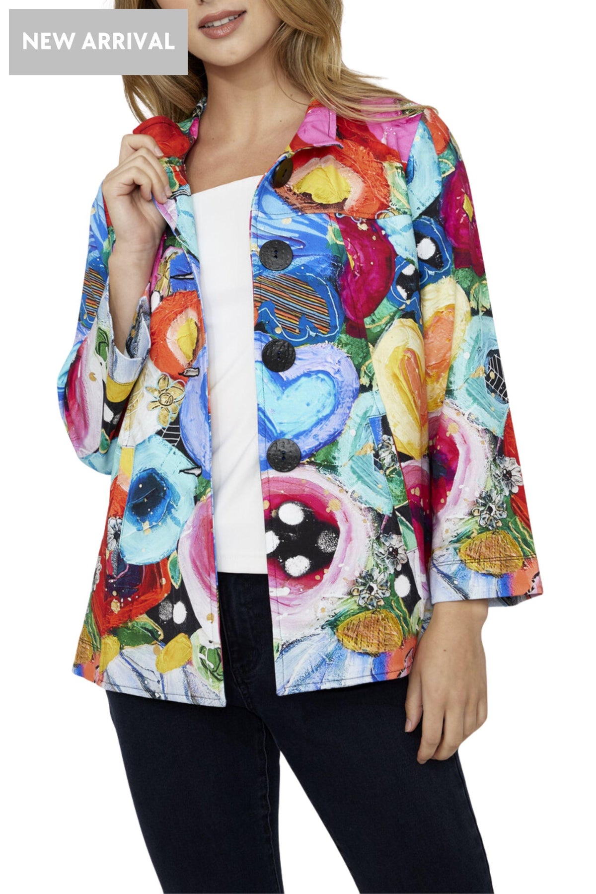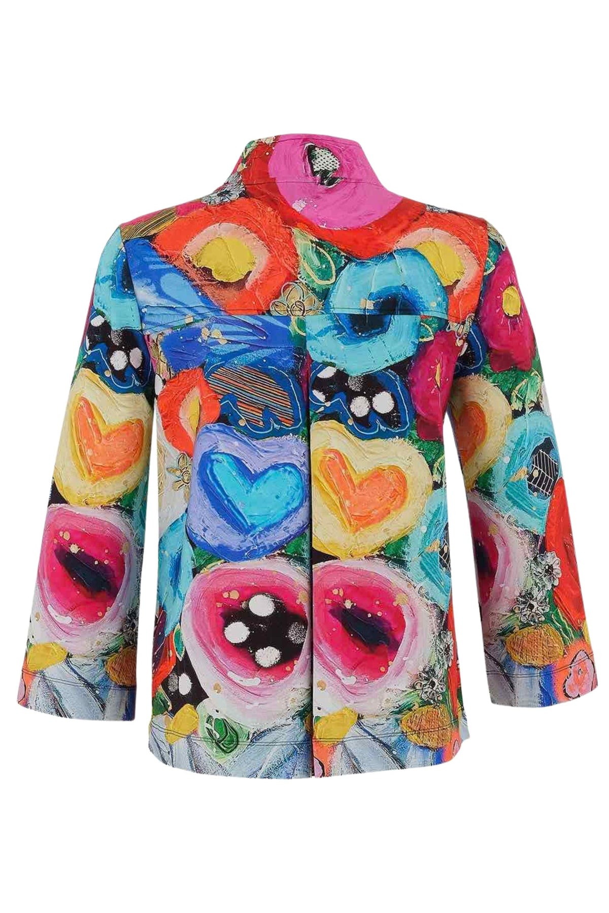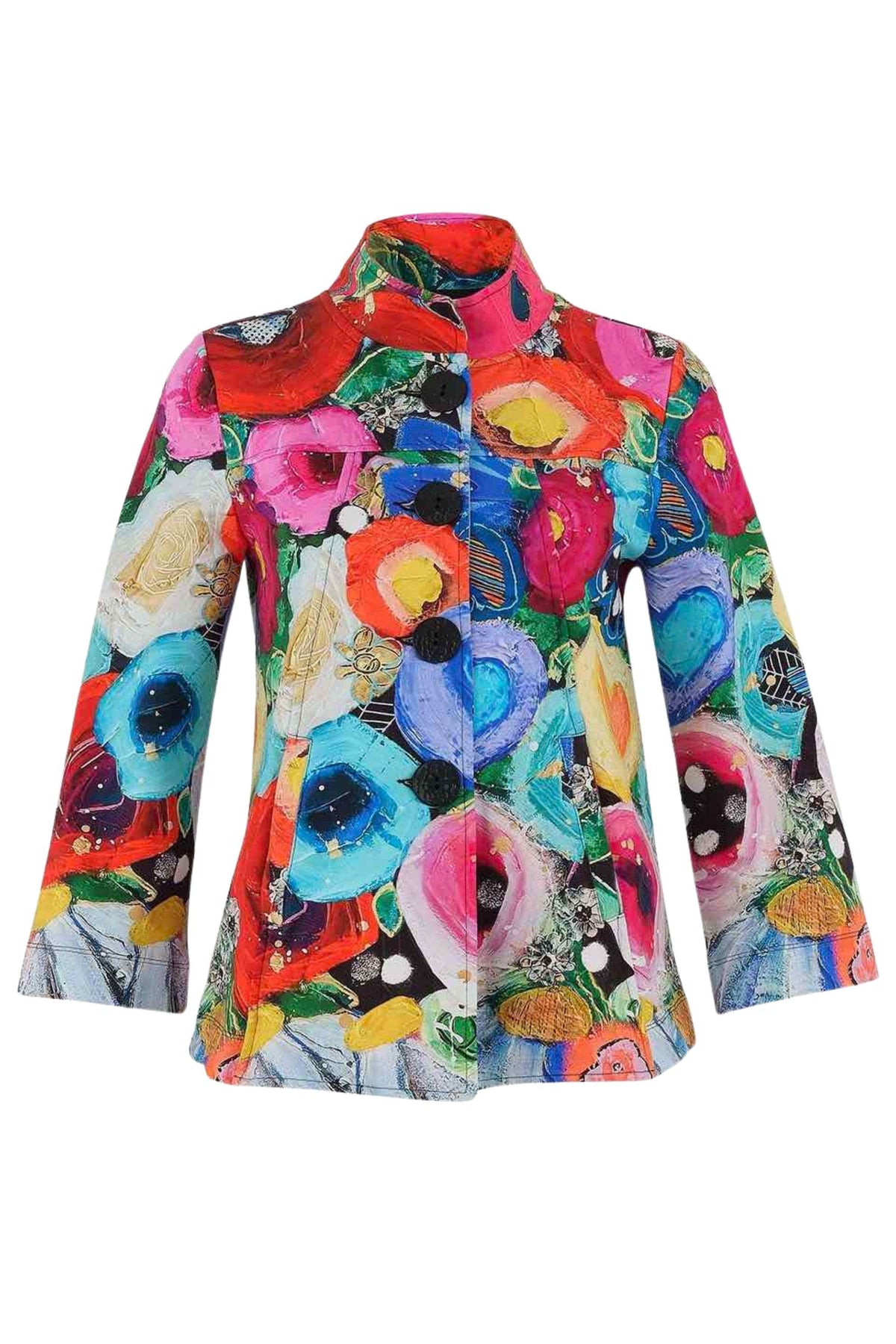 Simply Art by Dolcezza Jacket “I believe in Angels” – bestseller spectacular cotton-blend flared jacket in blazer cut with front buttons, pockets, long flared sleeves, back pleating in stunning colourful design, featuring artistic design of Genevieve Gauthier VIGO (from Quebec, Canada) painting in bright colours palette, easy comfortable fit, stretchy.