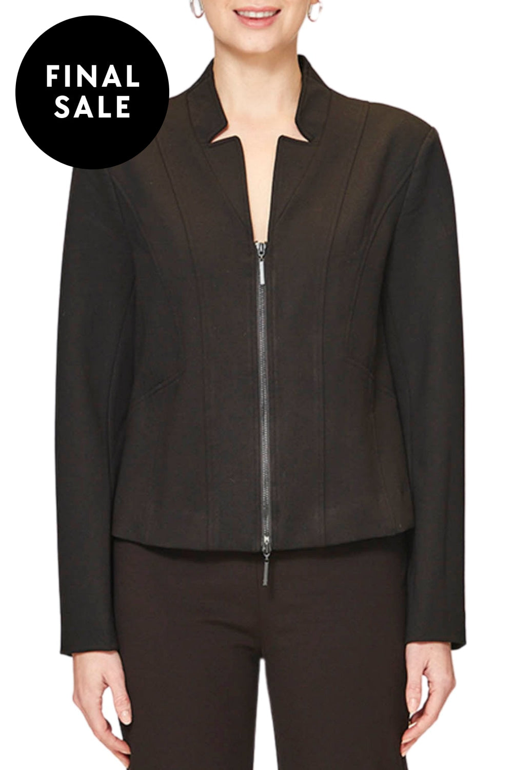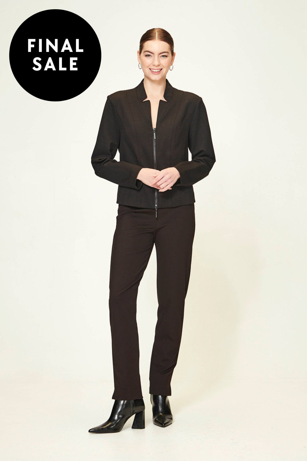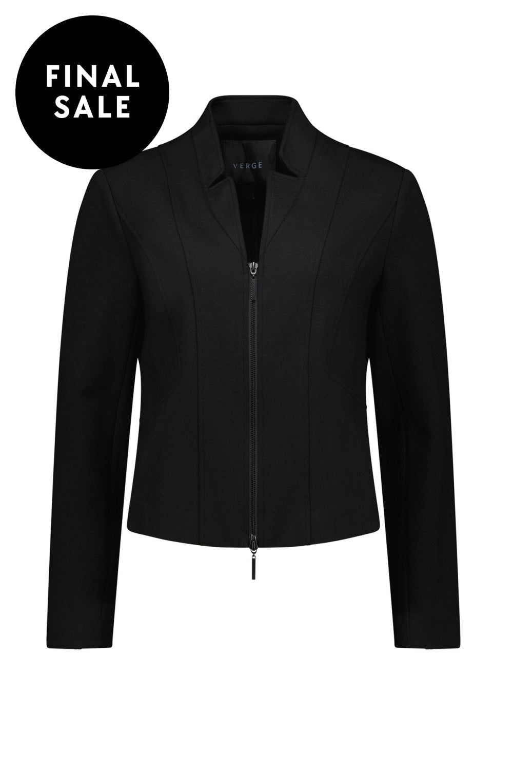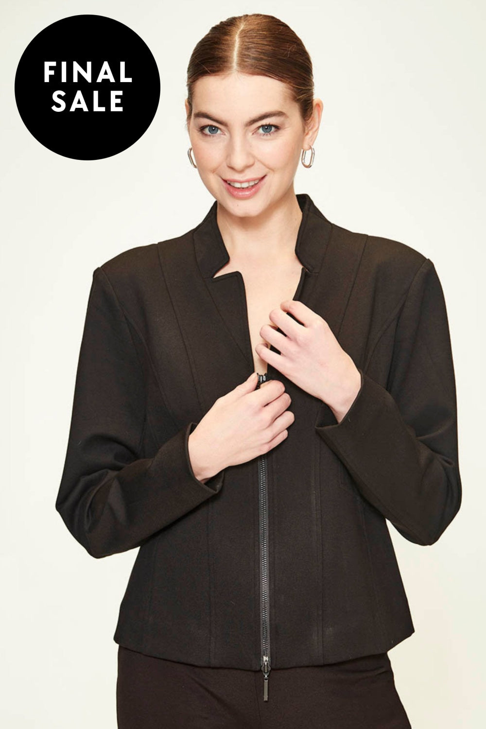 Shaped Deluxe Ponti jacket with stand up lapel collar and zip front.  The Riviera jacket is panelled throughout the body and shaped at the back. The Riviera jacket falls to the hip.
