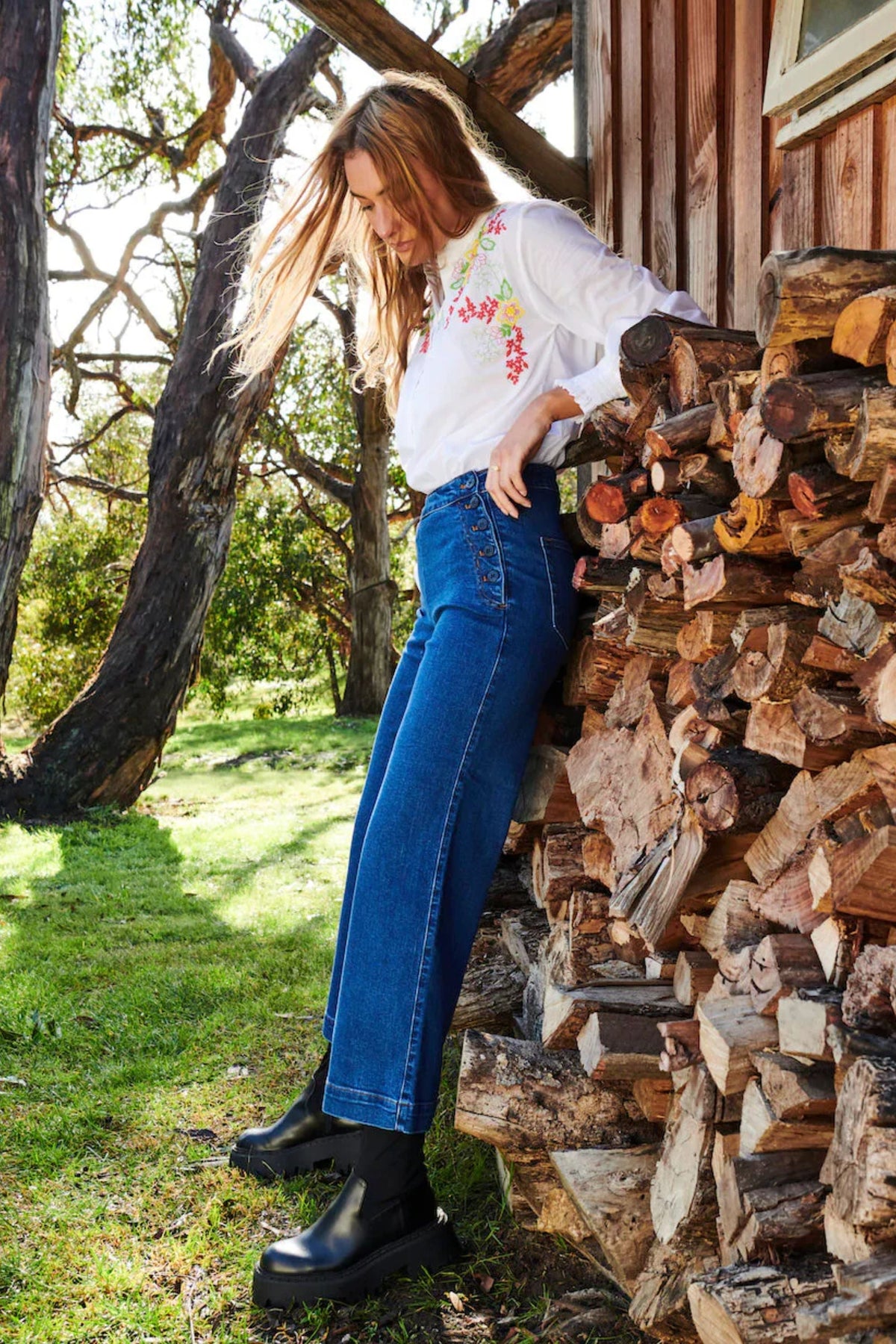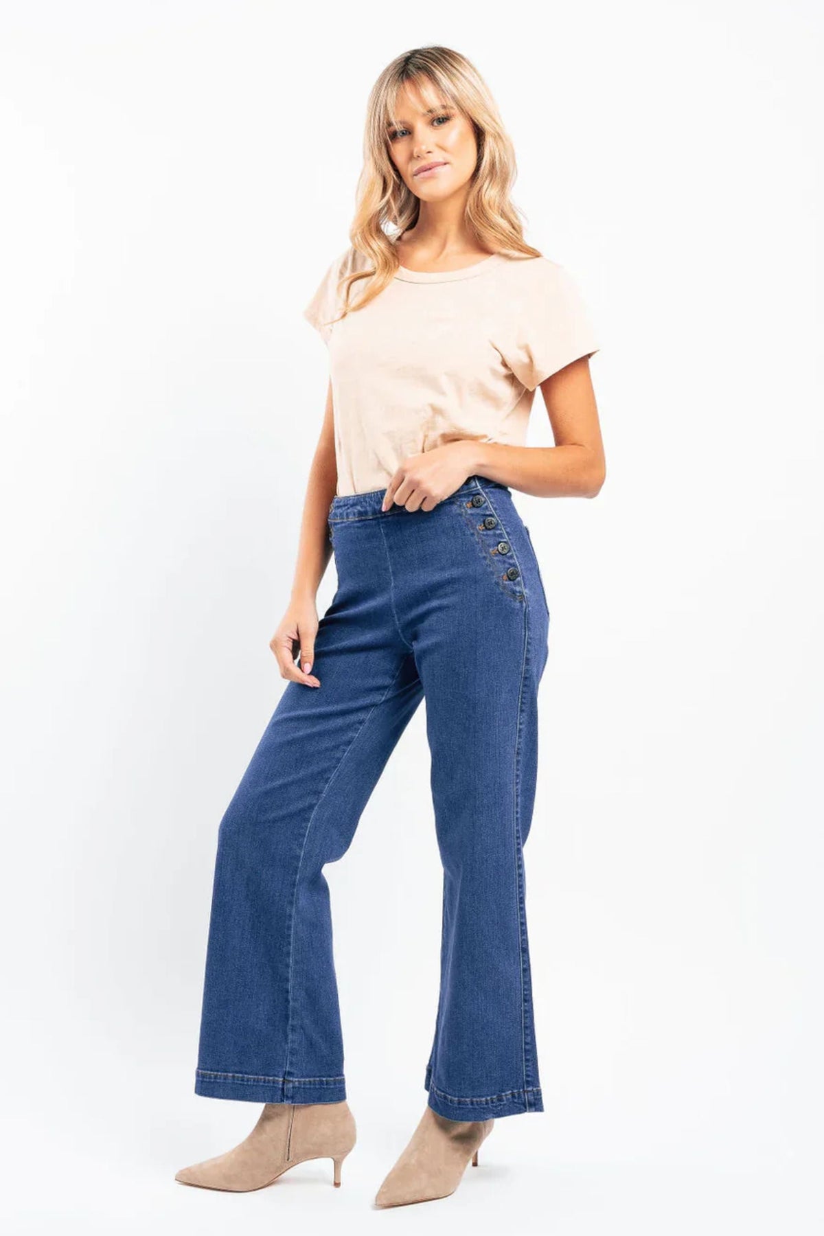 We’ve taken our favourite jean style and added a nautical twist. Introducing the re-worked Freya Sailor Jean. Featuring the same classic wide-legged style and mid/high rise waist we’ve added a sailor front with 4 buttons either side.
