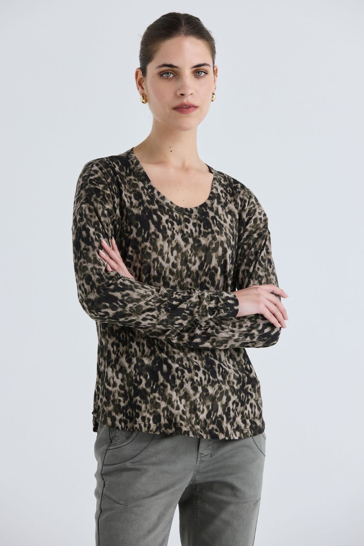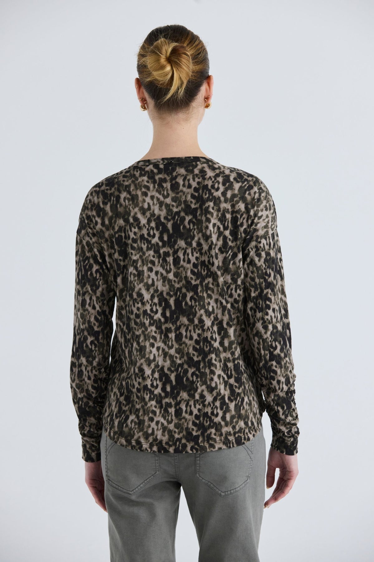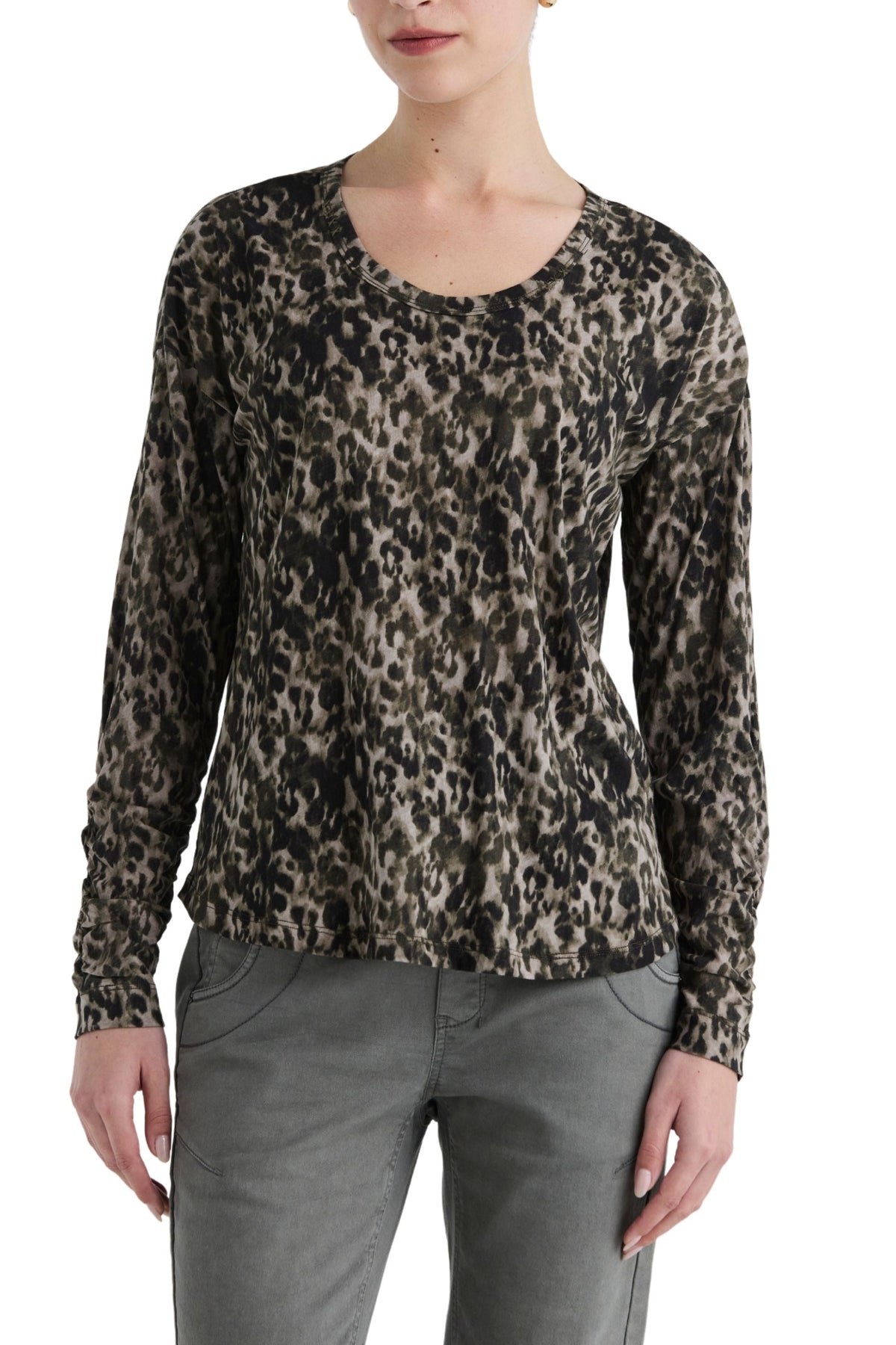 The Jagger Top offers a relaxed fit in a soft cotton jersey, showcasing an eye-catching animal print in khaki shades. With its round neckline, cross stitch embroidery, and ruched cuffs, this long sleeve top is perfect for laid-back days.