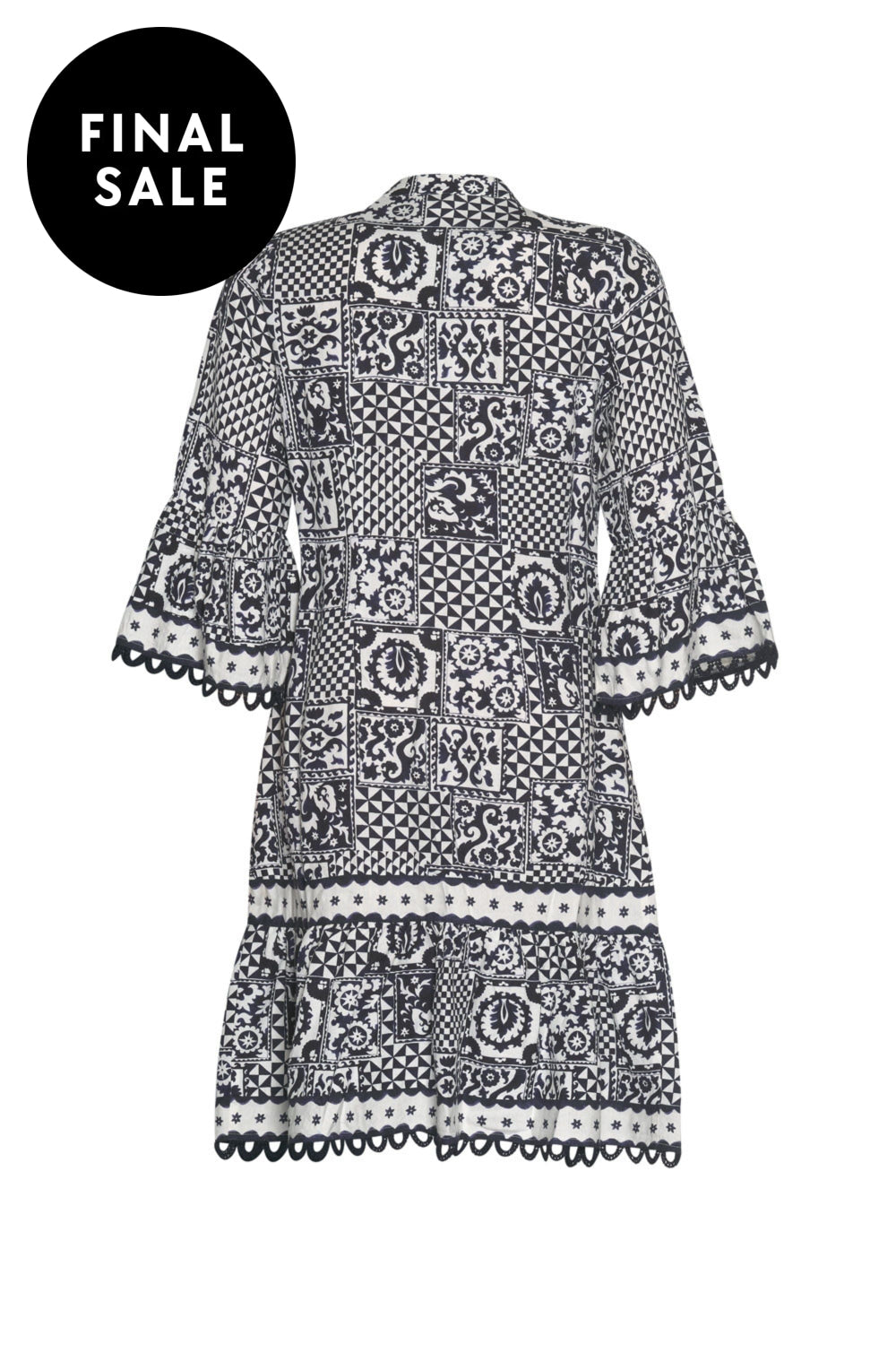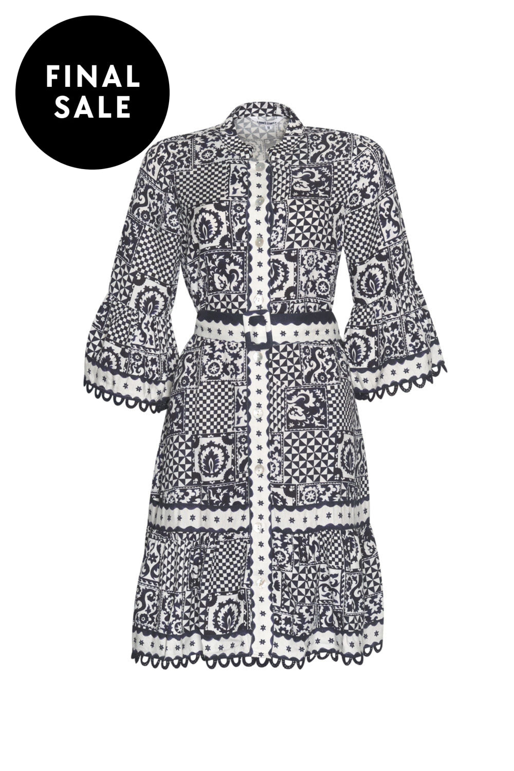 Button through midi dress with 3/4 length ruffled sleeves, with matching self belt, and hidden in-seam pockets. Featuring contrast piping detail, with cotton lace trim and shell buttons.