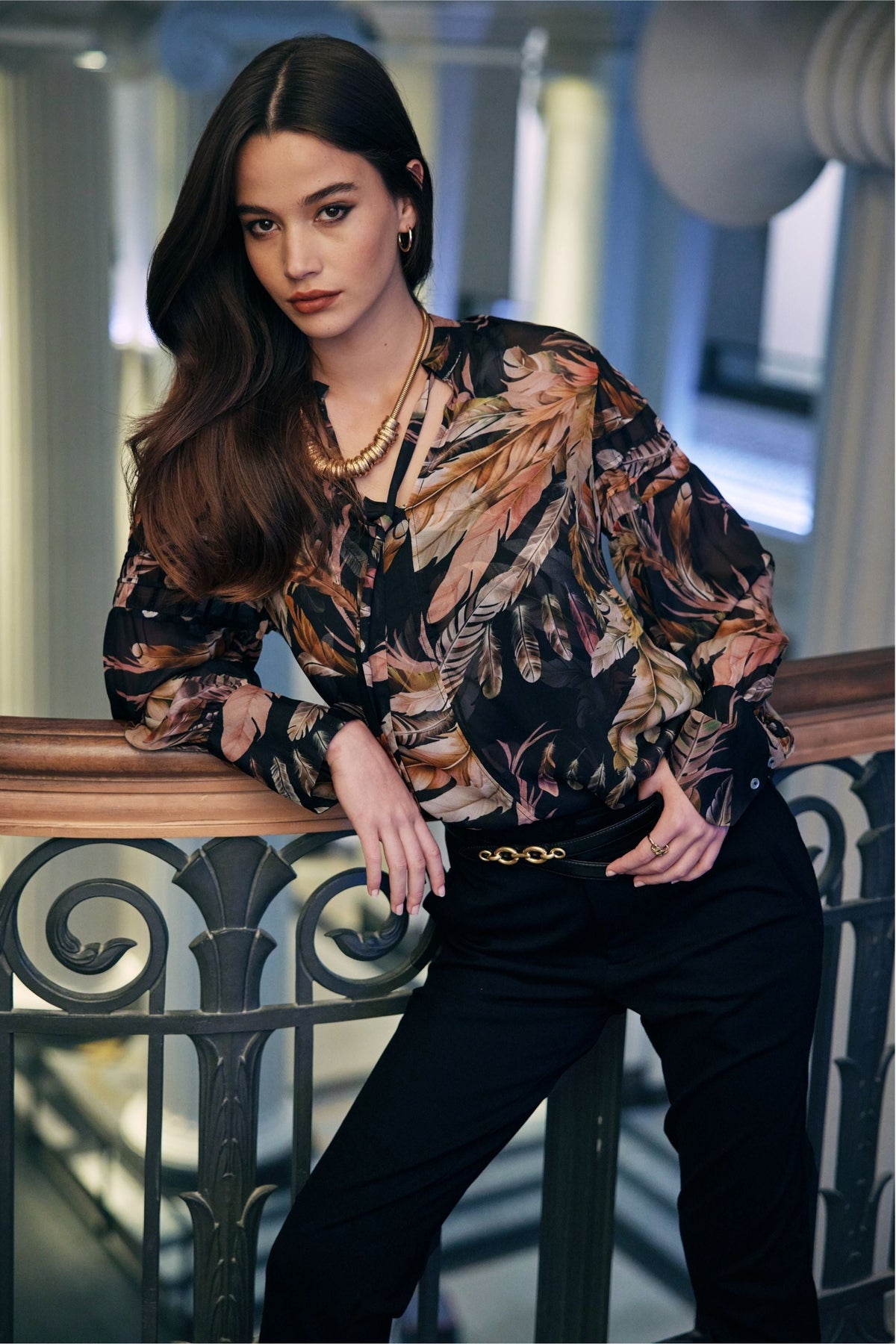 This sheer blouse exudes elegance with its center front tie and tuck detail sleeves. Perfect for any occasion, the deep cuffs and printed cami add a touch of sophistication. Elevate your wardrobe with this exclusive piece.