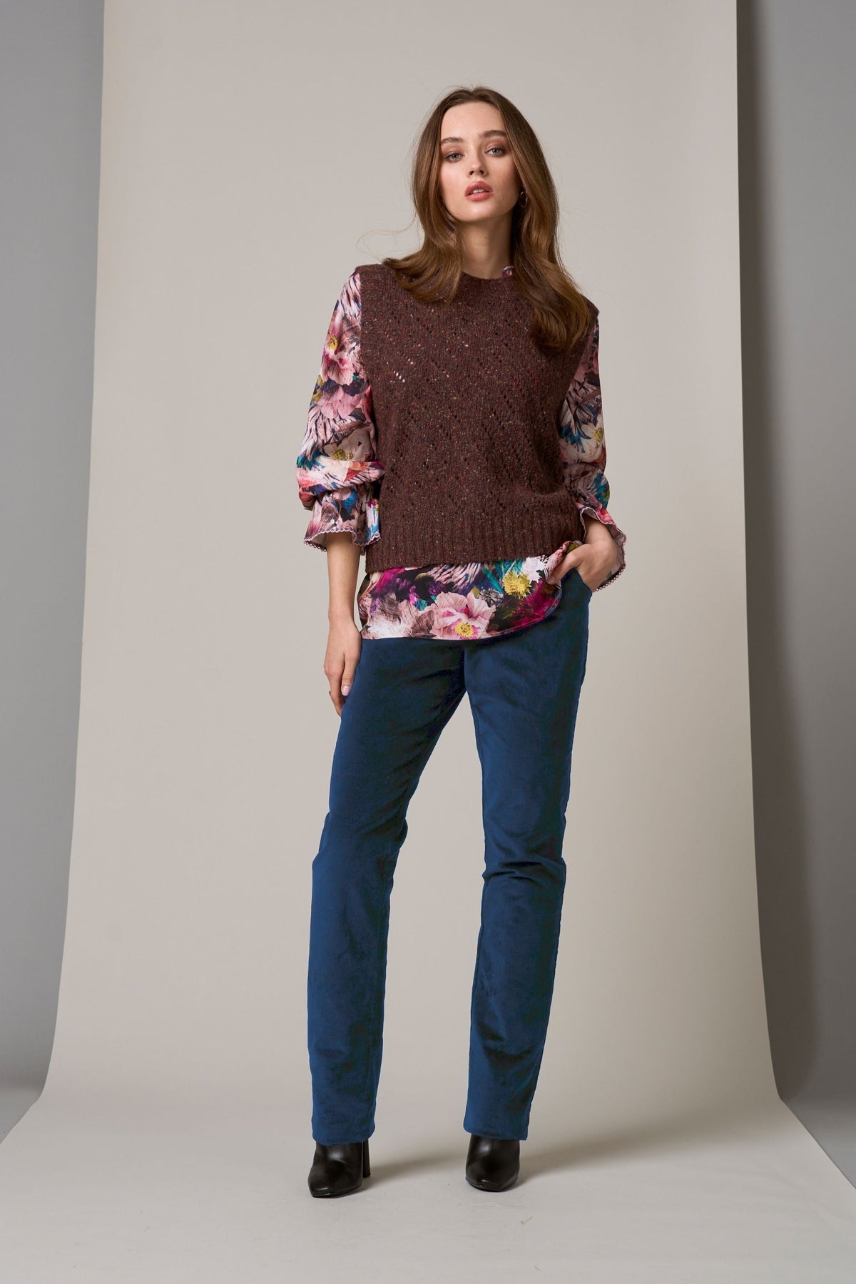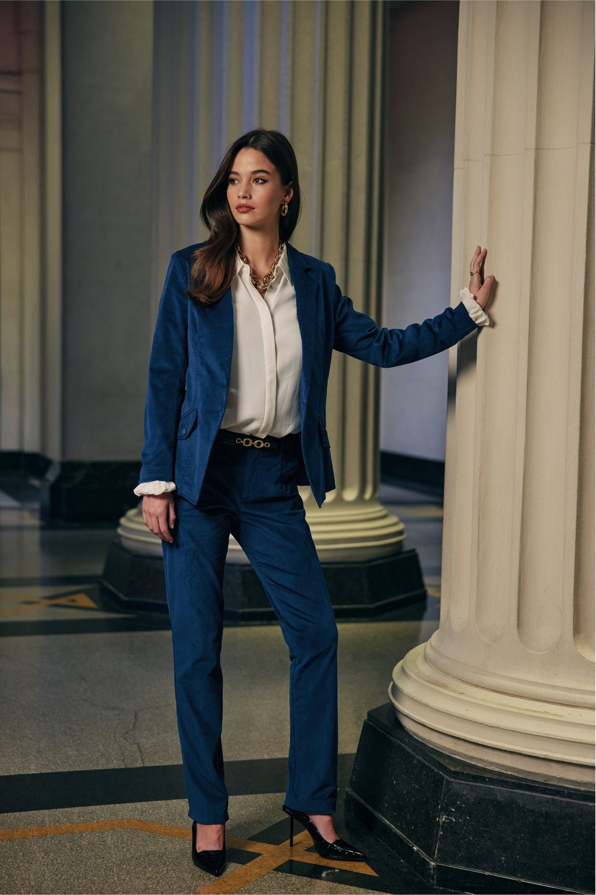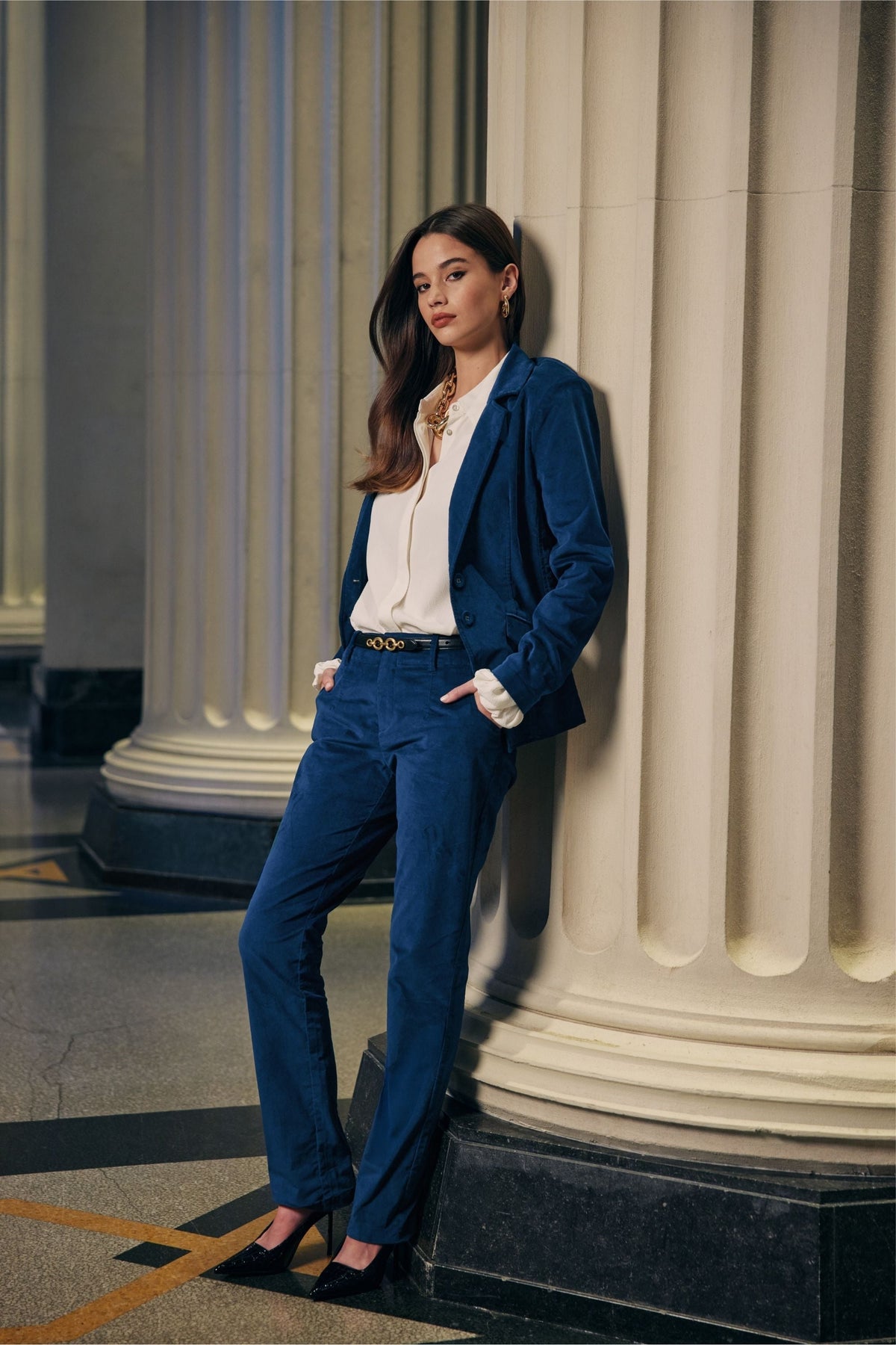 Elevate your wardrobe with our Prudence Pant. Designed with a slim fit and velveteen material, it features front and back darts for a flattering silhouette. Complete with belt keepers and a functional fly, our pant effortlessly combines function and style for a truly luxurious look.