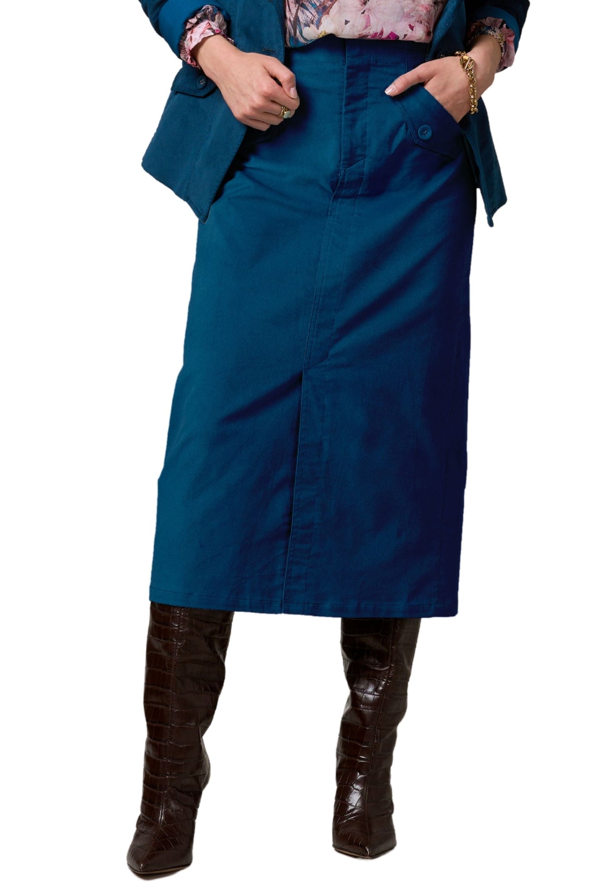The Prudence Skirt is a luxurious, fitted midi skirt made of soft velveteen fabric. Its unique design includes darts and forward side seams for a flattering fit, as well as faux flap front pockets. With a front split for comfort and ease of movement, this skirt is both stylish and functional.