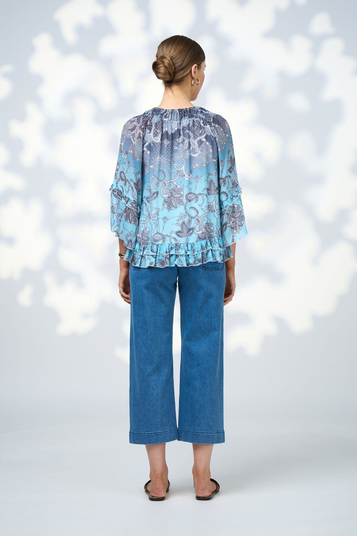 Floaty, sheer blouse in an ombre print, with layered ruffle sleeves and hem. Featuring a ruched neckline to create an adjustable, gathered V-neck. Fully lined.