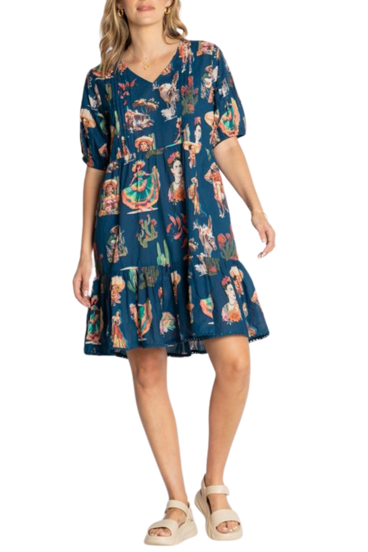 Brighten your wardrobe with the LulaLife Arriba Dress, a playful blend of comfort and style. Crafted in Australia from lightweight 100% cotton voile, this knee-length dress is perfect for warm-weather dressing. Featuring a relaxed fit with a flattering V-neckline, vertical tucks on the bodice, and tiered gathered panels, it offers a breezy and feminine silhouette. The gathered elbow-length sleeves with soft elastic hems add comfort, while practical side pockets make it easy to wear every day. Finished with a retro Mexican western-inspired digital print, this dress is a vibrant choice for summer outings, holidays, or casual weekends.