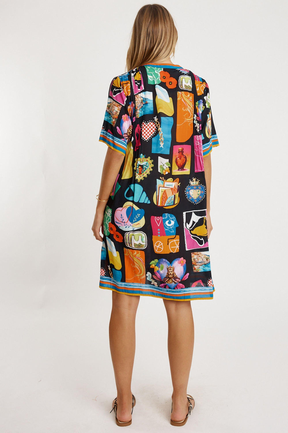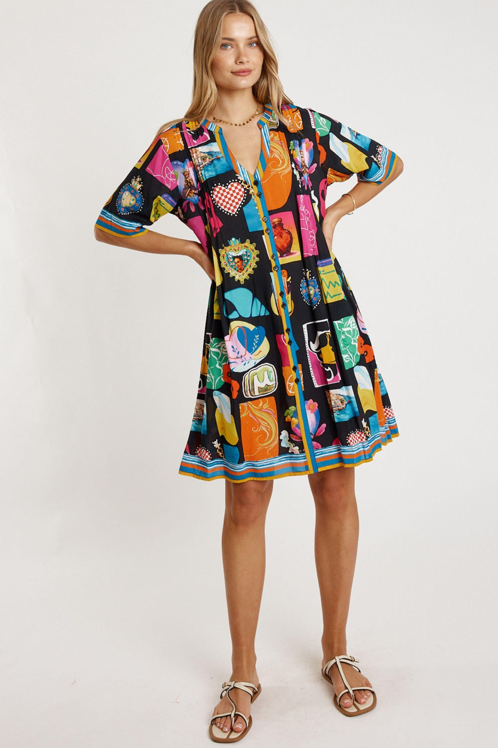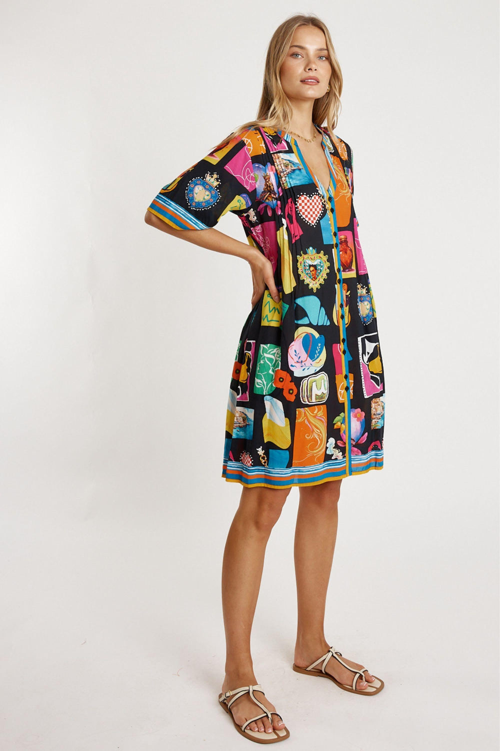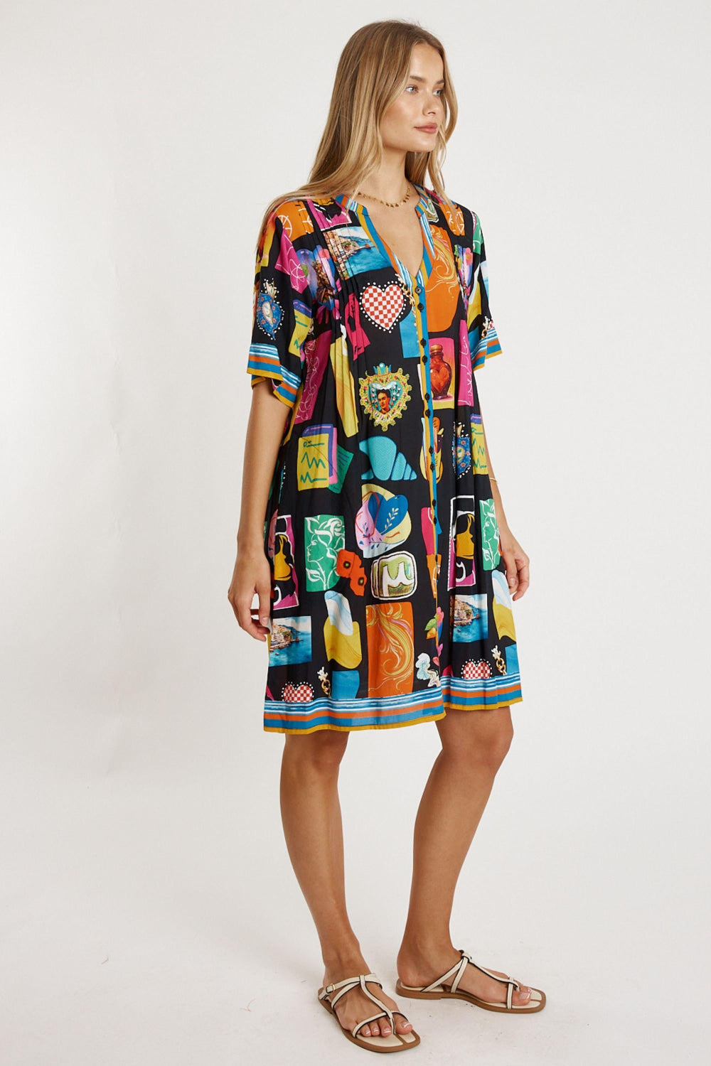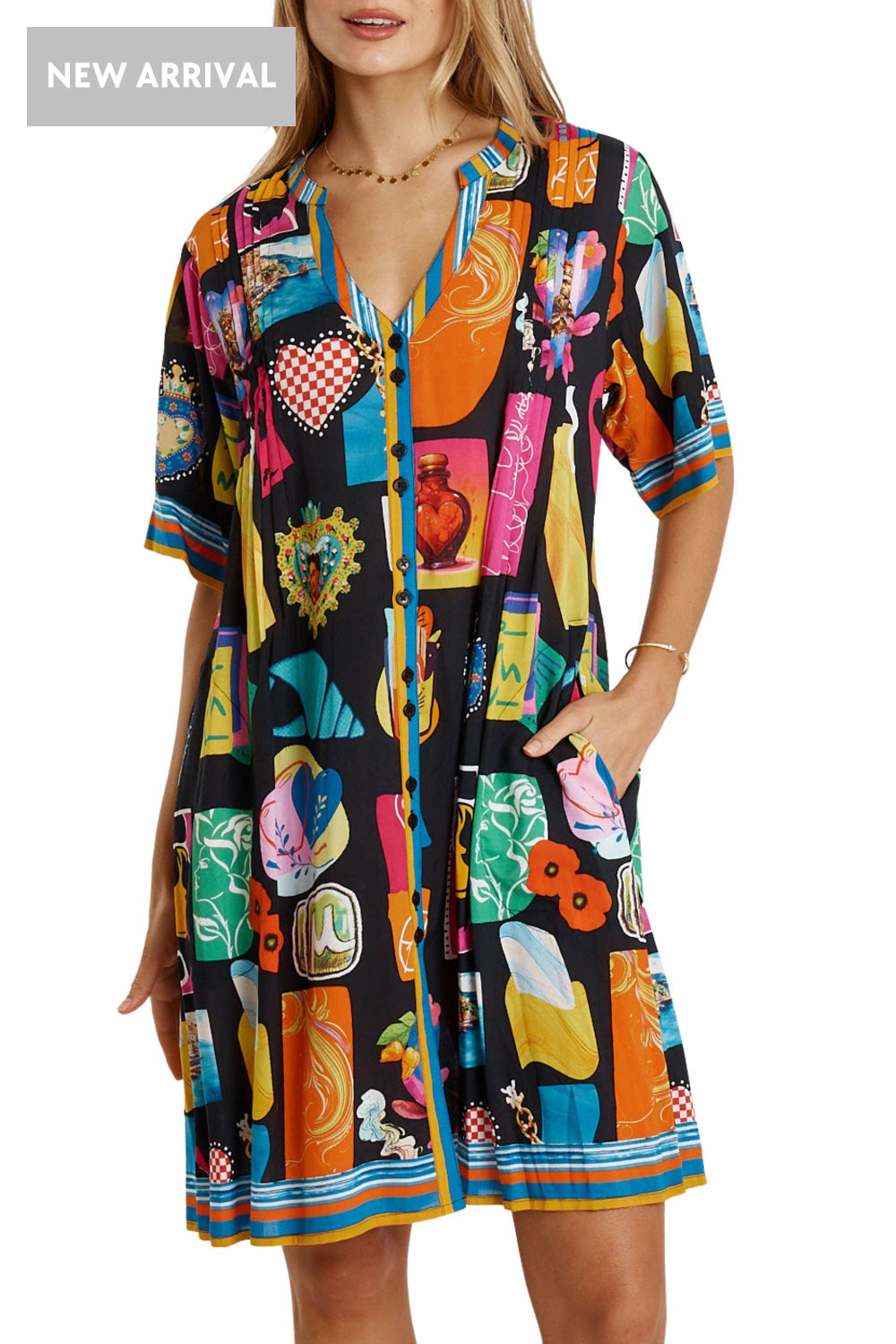 Fresh, flowy, and full of personality, the Lula Life Odette Tuck Dress is an easy everyday favourite with beautiful detail. Made from 100% viscose, it feels soft, lightweight, and perfect for warm days. The Nauru collar flowing into a V-neck and front tab button-through design give it a relaxed, polished look. Soft vertical tucks on the front and back bodice add gentle shaping, while the elbow-length sleeves, side pockets, and curved hem keep the fit effortless and comfortable. Finished in a striking Japanese-inspired digital print, this Australian-designed dress—made in India—offers vibrant, wearable style. Model is 5'8½” for reference.