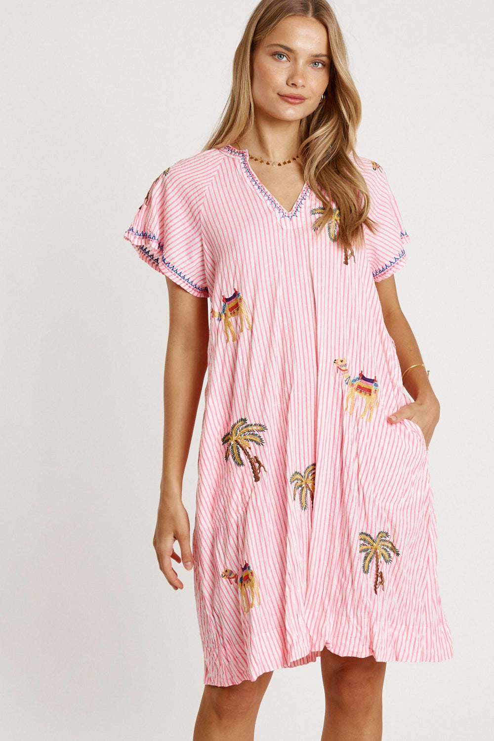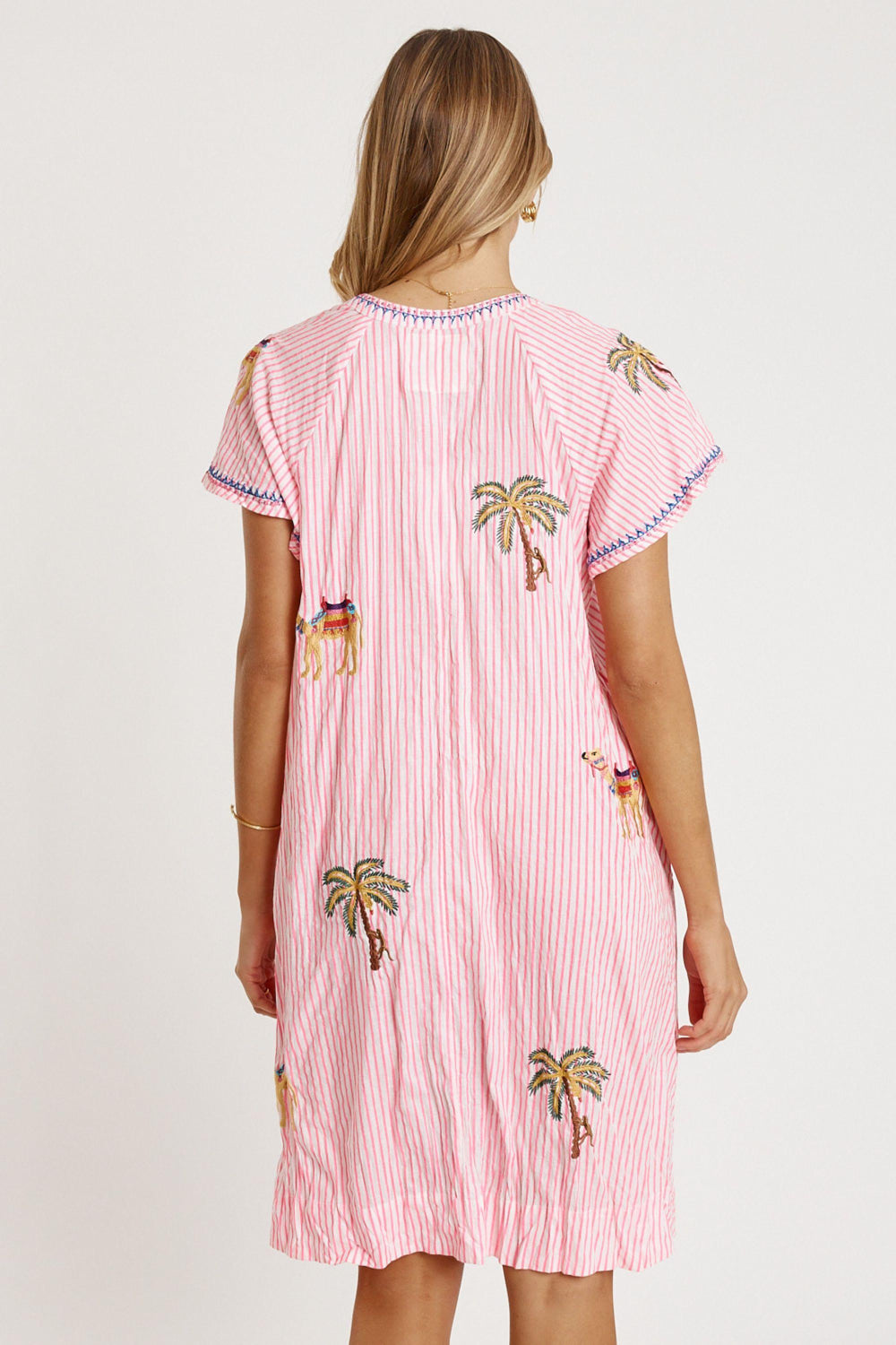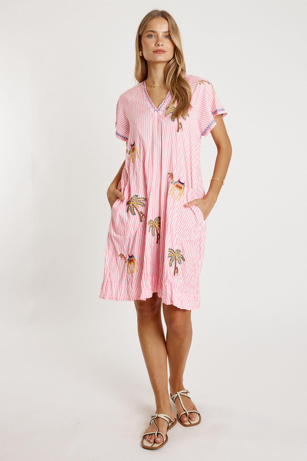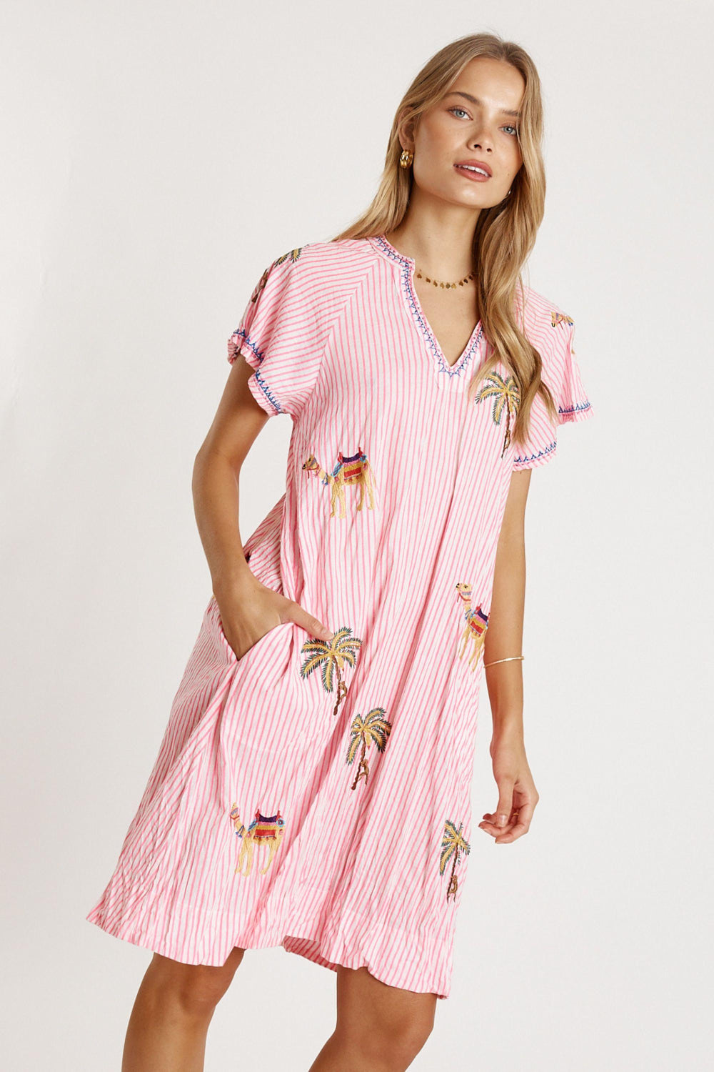 Bringing breezy comfort and beautiful detail, the Lula Life Sahara Dress is an easy everyday favourite. Crafted from 100% cotton, it’s soft, breathable, and perfect for warm-weather style. The embroidered motifs add a delicate, handcrafted touch, while the V-neck with Nauru collar keeps the look fresh and flattering. Designed in a relaxed A-line shape, it features loose raglan sleeves, handy side pockets, and a versatile knee-length cut. Proudly designed in Australia, this dress blends colour, comfort, and effortless charm for casual days out.
