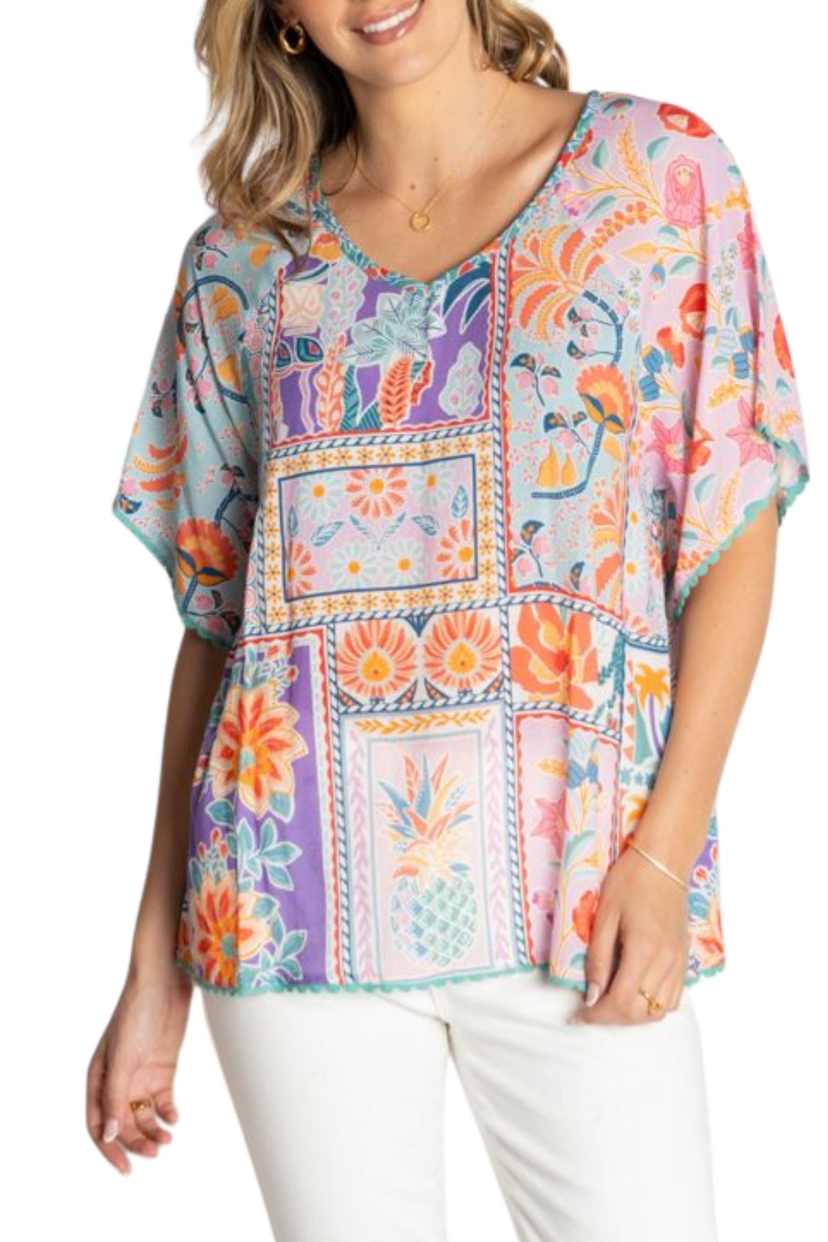 The LulaLife Zorana Top is a relaxed-fit, lightweight top crafted from 100% viscose and designed in Australia. Featuring a flattering V-neck and wide raglan sleeves to the elbow, it offers comfort and effortless style. Ric-rac braid trim on the hems adds playful detail, while mix-and-match patchwork digital prints bring vibrant, eye-catching character. Perfect for pairing with jeans, skirts, or shorts, this top is ideal for casual outings, summer days, or holiday wear.