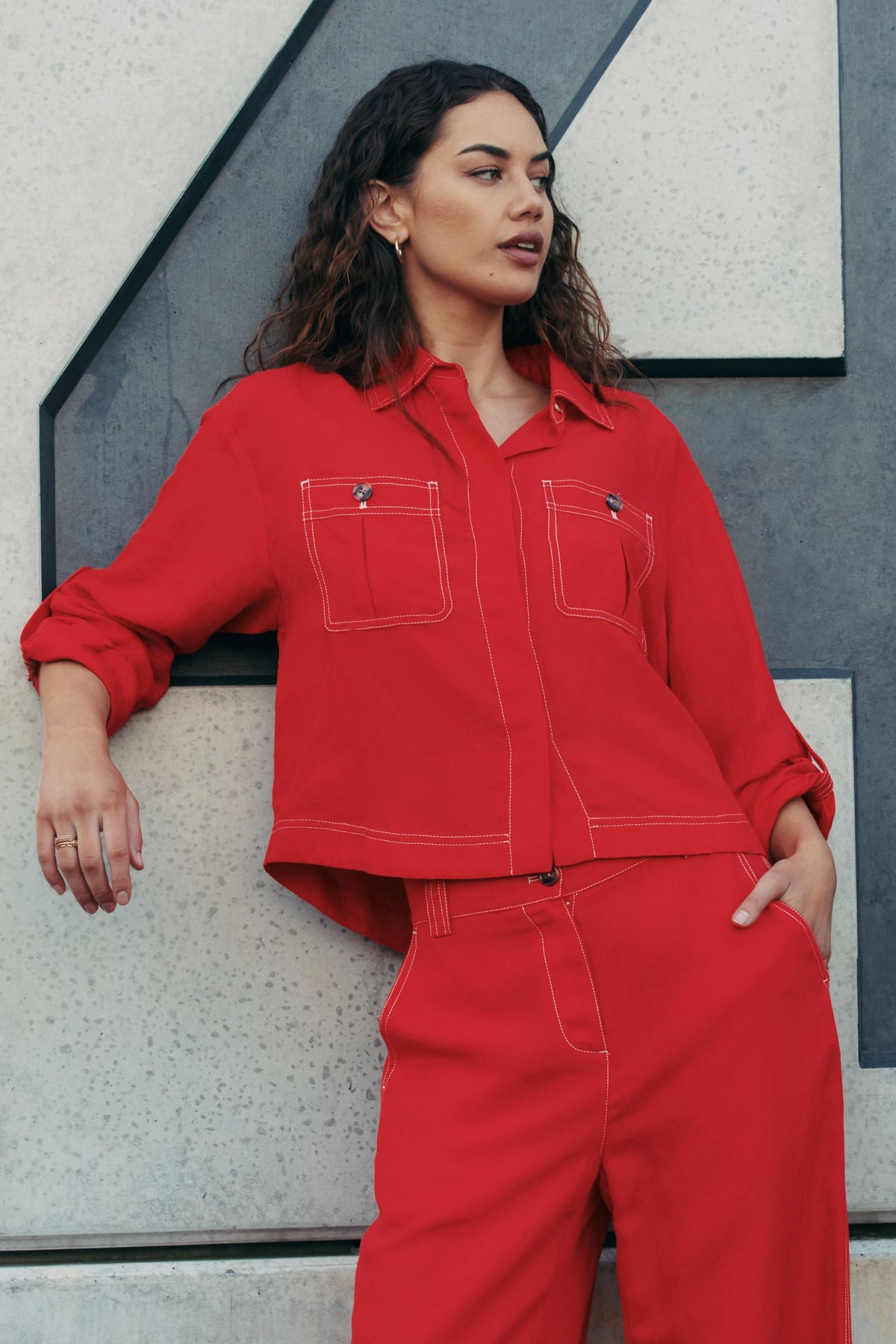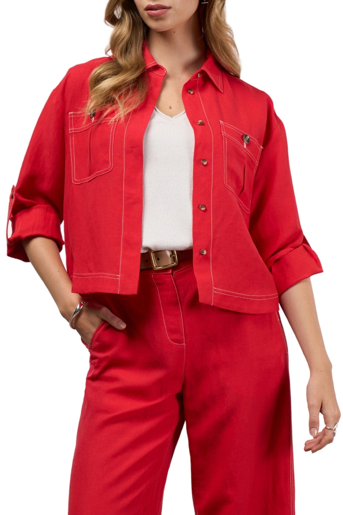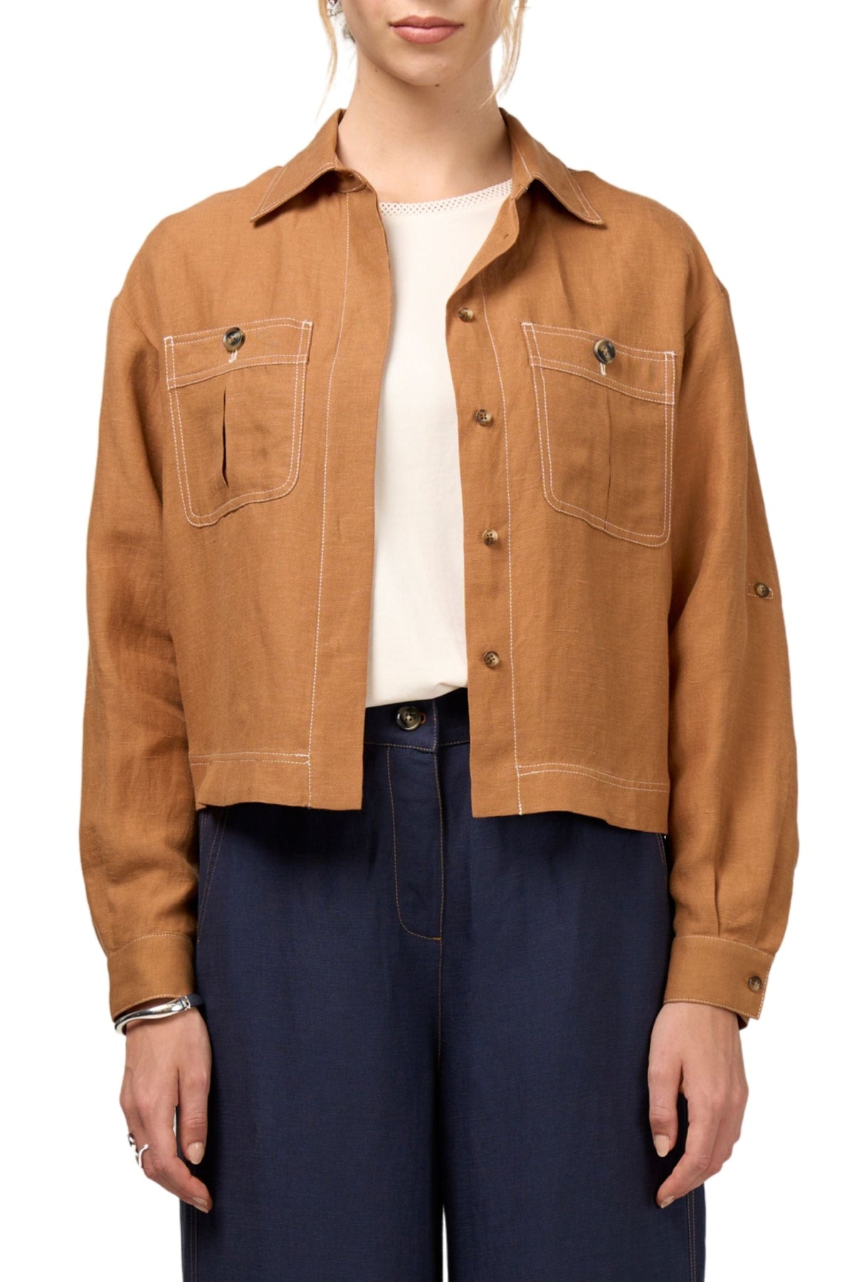 • Cropped Jacket in a linen blend, with front pockets, featuring contrast twin needle detailing, and adjustable sleeves with a hidden tab.