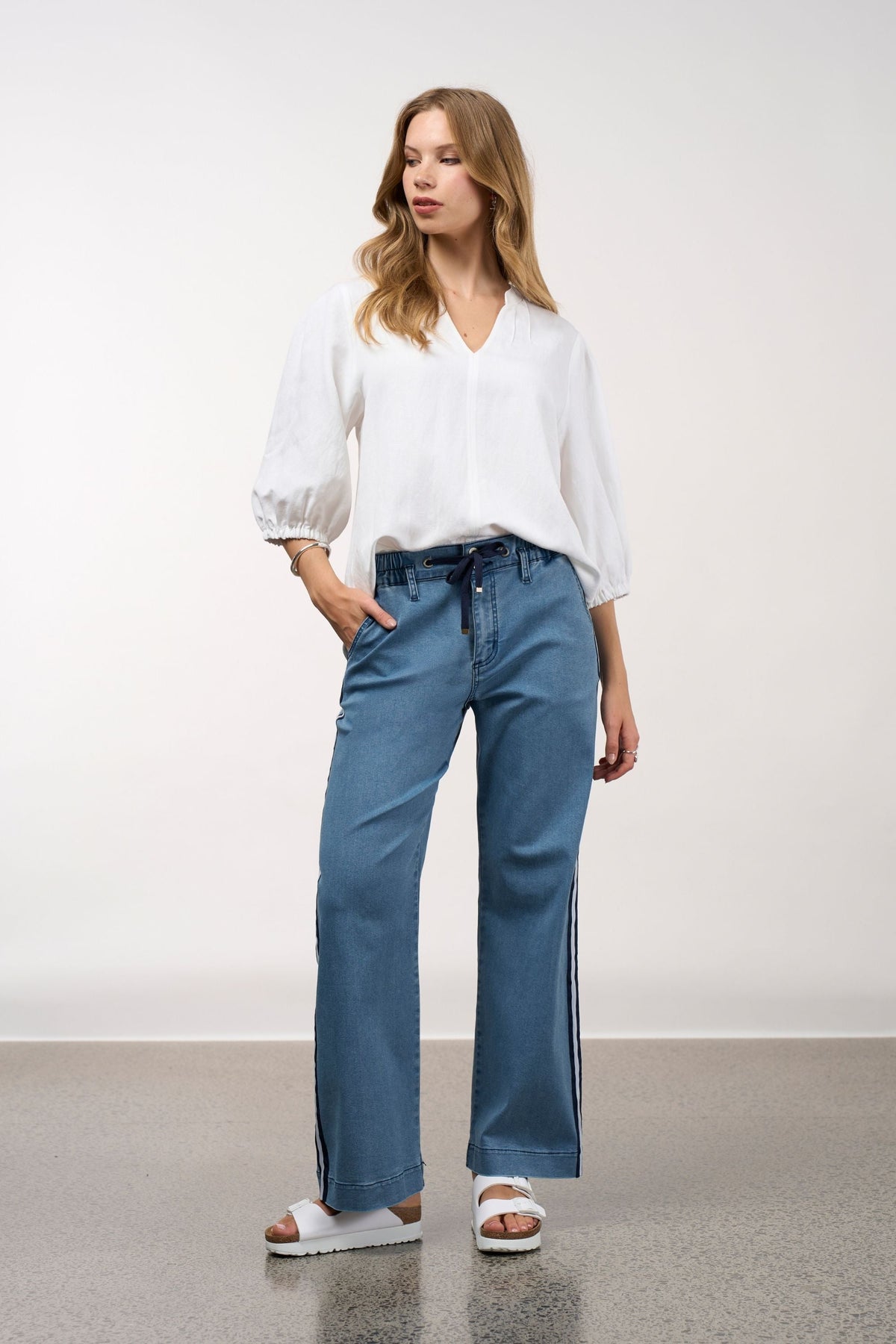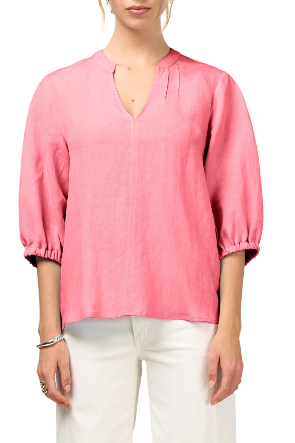 Relaxed fitting top with a V neckline, featuring fine pin-tuck detailing at the front neck and at the shoulder, with blouson sleeves and elasticated cuffs.