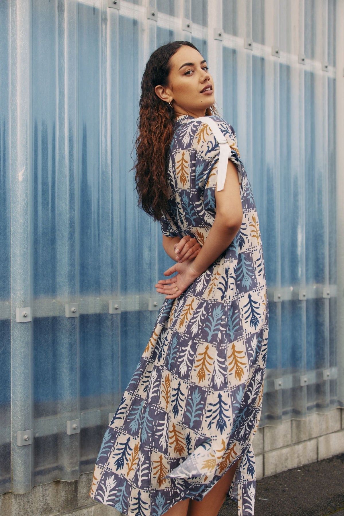 Button-through dress with a rounded hem and side splits, with under bust gathering for soft fullness. Featuring contrast overarm tape and D-rings for adjustable, grown on sleeves.